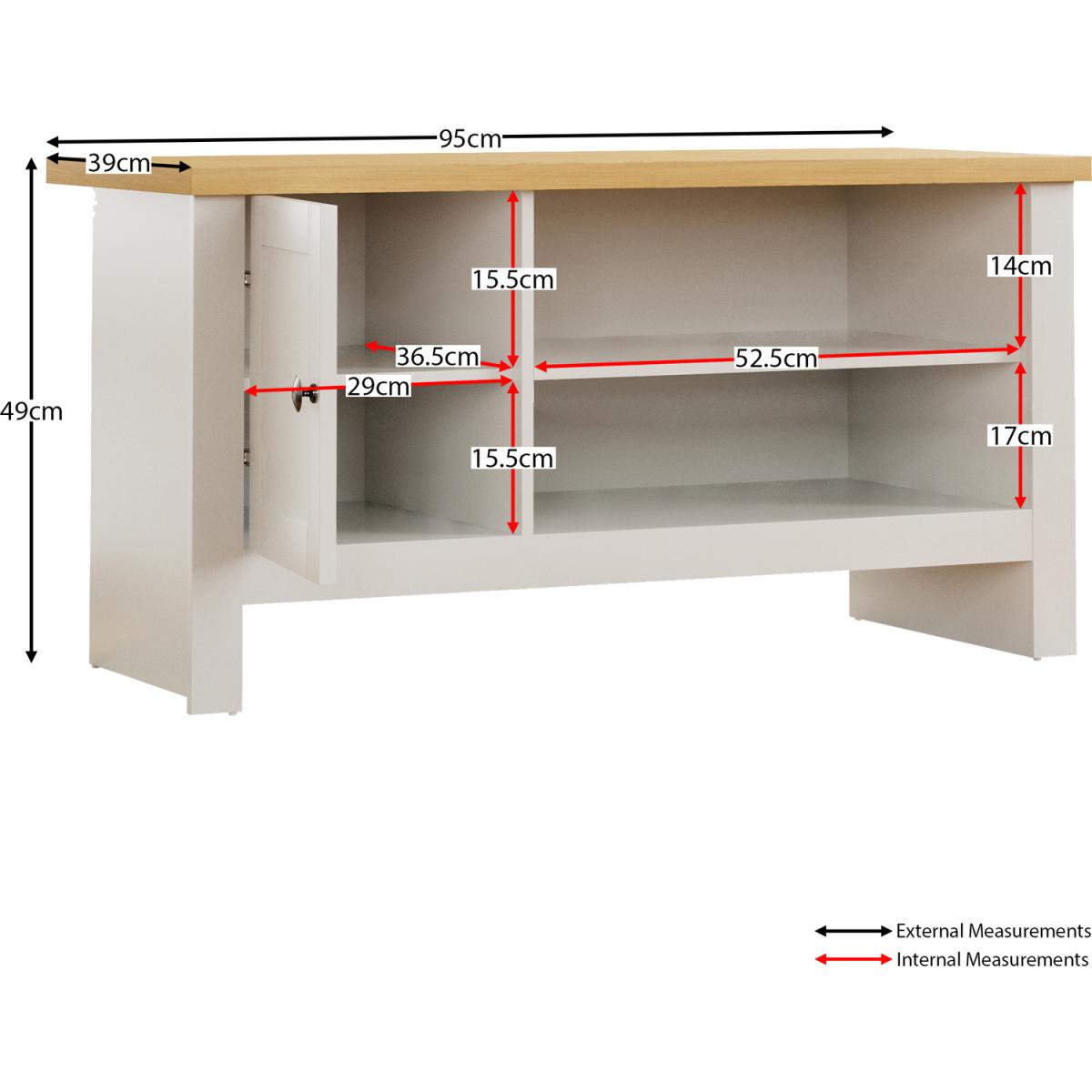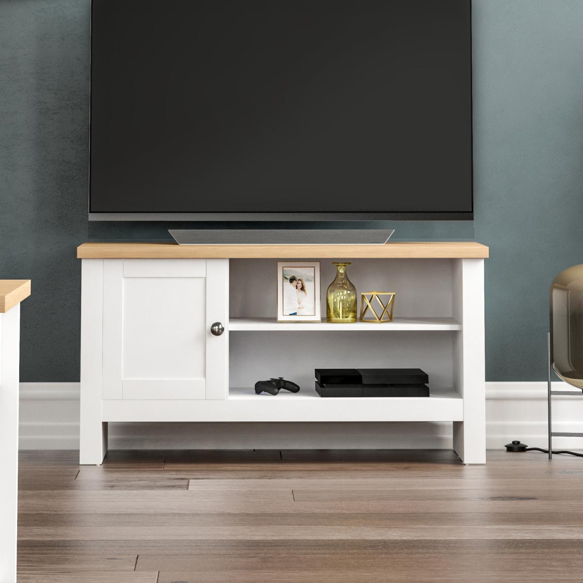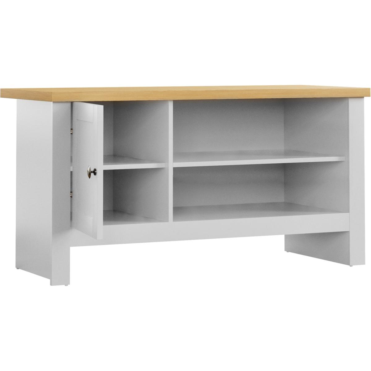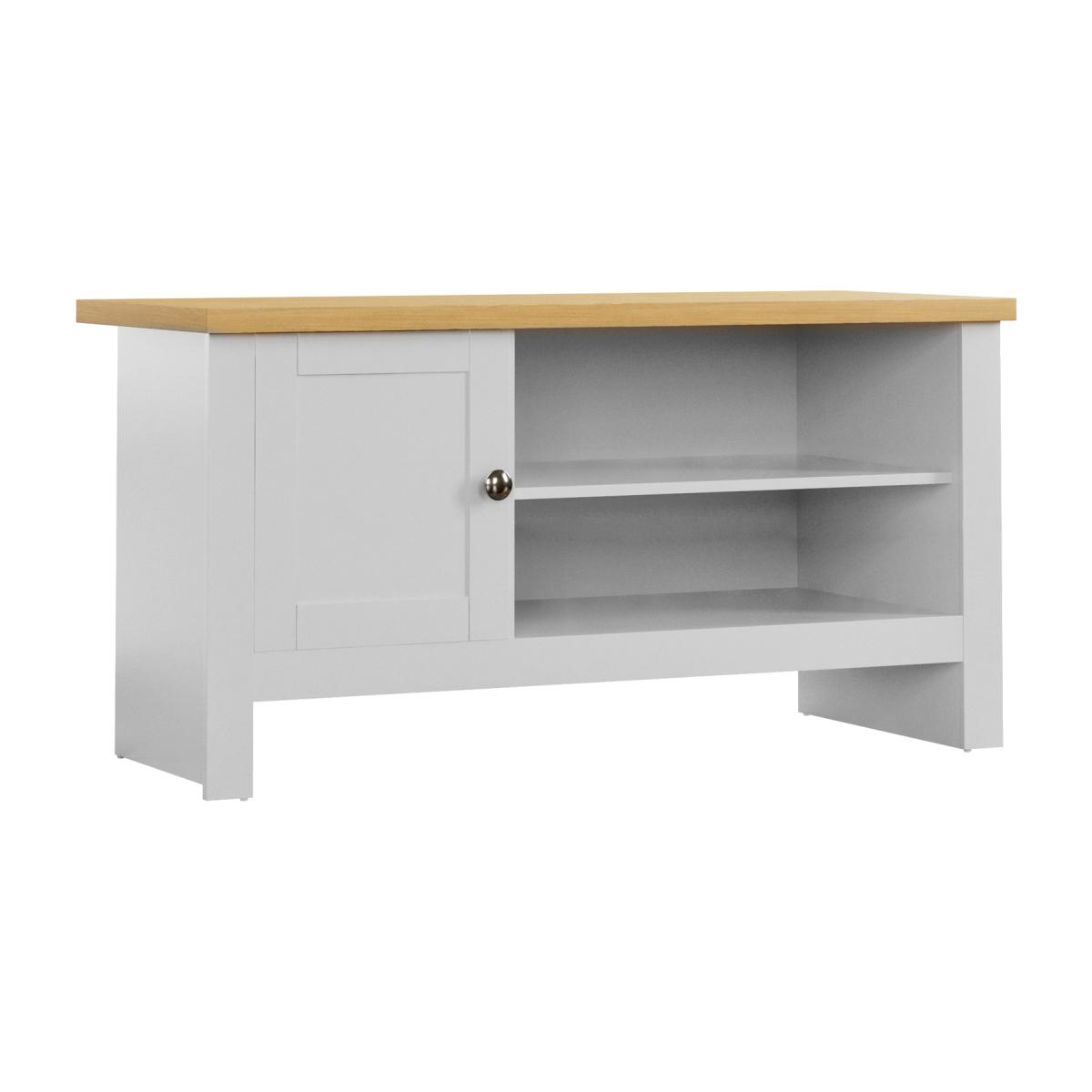 I’m a fan of this TV unit for its clean lines and two-tone finish - the grey body and oak-effect top strike a modern yet relaxed tone. It works particularly well in Scandi, coastal or contemporary schemes, where its neutral palette can sit alongside soft pastels or darker accents. The single door is perfect for stashing remotes or gaming kits out of sight, while the open shelves suit media players and simple décor like a low vase or framed photo. For a balanced look, tuck a woven basket on one shelf and lean a slim planter beside the unit to soften the angles and add texture.