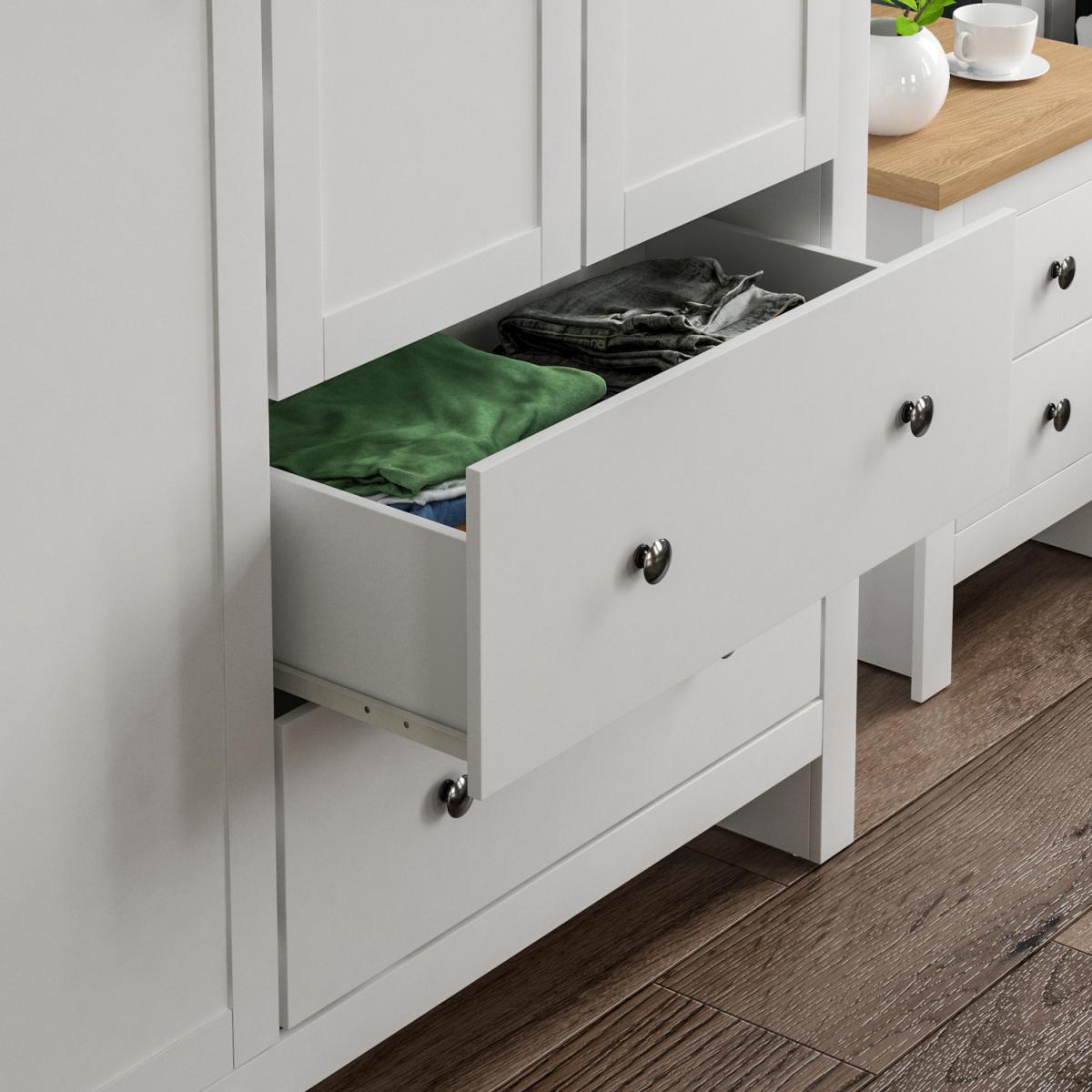 I’m a fan of this Arlington wardrobe for its clean two-tone finish and clever storage layout - three doors and two deep drawers give you hanging space, shelves and concealed stowage all in one. The grey-white palette makes it a versatile backdrop in modern, Scandi or contemporary country bedrooms. To style it, keep the top free of clutter and add a small potted plant or simple ceramic vase to bring a touch of life. Inside, use matching woven baskets or fabric boxes on the shelves to corral smaller items and keep drawers organised with dividers for socks and accessories. Position it against a soft-hued wall and complement with linen bedding and a cosy rug to tie the scheme together.