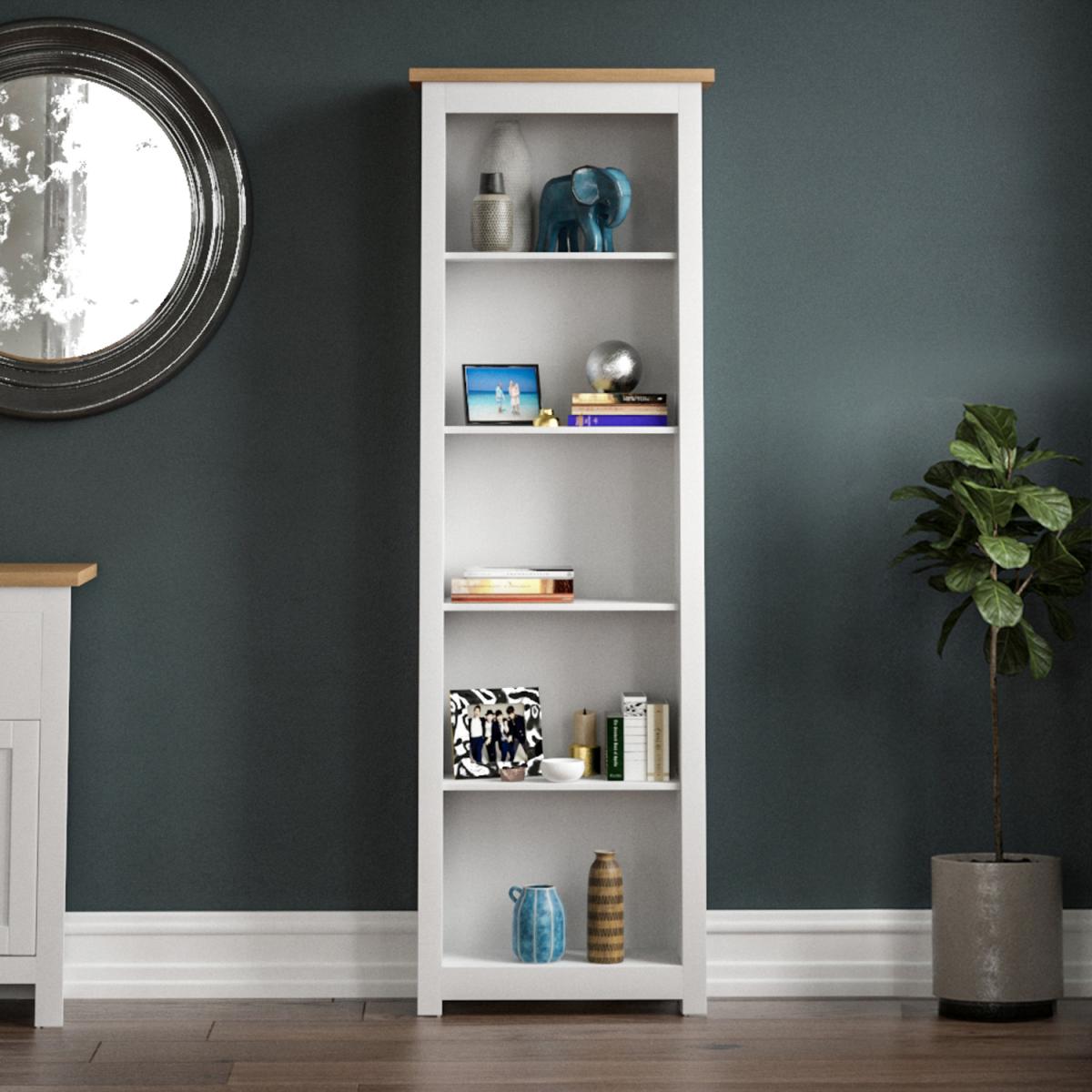 I’ve used this slim five-shelf unit in everything from compact home offices to open-plan living rooms because its neutral mix of grey and white works with Scandi, modern farmhouse or transitional schemes. The narrow profile makes it perfect for tight hallways or beside a desk, and the five tiers give you room to layer books, baskets and a few sculptural accents without overwhelming the space. Styling tip: alternate horizontal and vertical book stacks, tuck small wicker or fabric baskets on lower shelves for concealed storage, and leave a little breathing room around each item to avoid a cluttered look. A couple of small potted plants or framed prints on the central shelves will add life without competing with the clean lines.