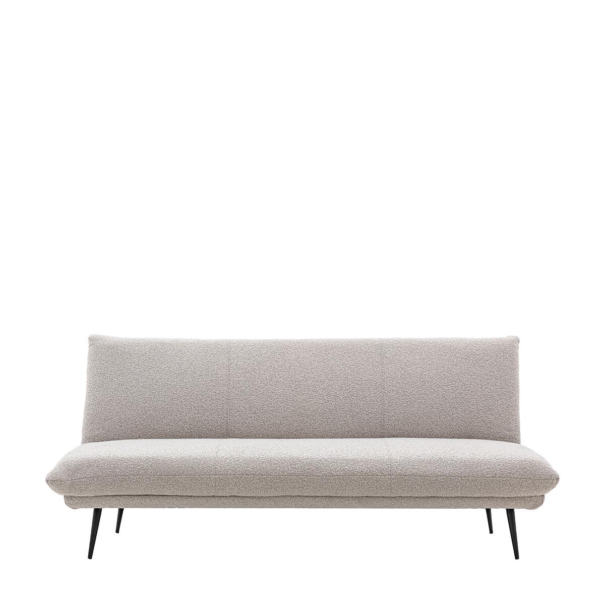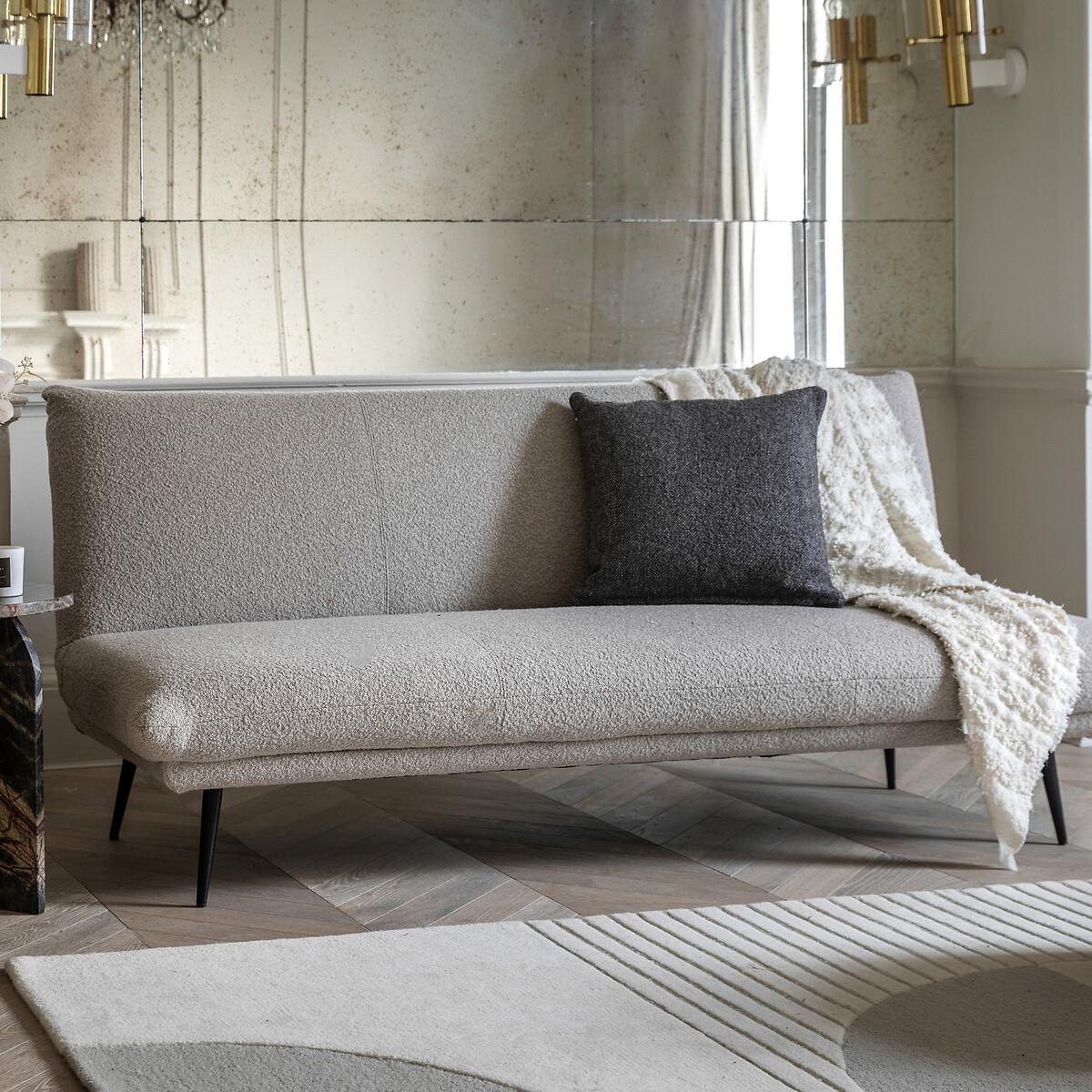 Offering simple contemporary design, this simple yet elegant sofa bed offers a practical solution for when guests stay overnight, with the back quickly and simply folding down to create a bed. Cosy boucle upholstery provides the perfect finishing touch. Product details• Textured Boucle Upholstery• Metal legs• Pine wood frame• Click-clack opening mechanism• Seats 3• Folds out to reveal a sleeping space that can accomodate two sleepers (the size of a small double)• Seat Filling - Foam• Back Filling - Foam• Seat Firmness - Medium• Back Firmness - Medium• 12 month manufactuers warranty• Some assembly required - legs/feet only. Product Composition - Pine 45% / Foam 23% / Fabric 13% / Plywood 10% / Iron 9%Product Dimensions - 85 cm x 186 cm x 82 cm , Weight - 30.4 KGSeat Height - 41 cm. Seat Width-186 cm. Seat Depth - 55 cm Leg / Feet Height - 20 cm Clearance to Floor - 20 cm. Sleeping area dimensions - 188 cm x 110 cm Package Dimensions - 188 cm x 117 cm x 21 cm, Weight 35.8 kg. This product will be dispatched by one of our trusted suppliers. You’ll be contacted by their selected courier about your delivery. Please note: this product cannot be delivered to all Offshore Islands, Northern Ireland or Republic of Ireland. GALLE01