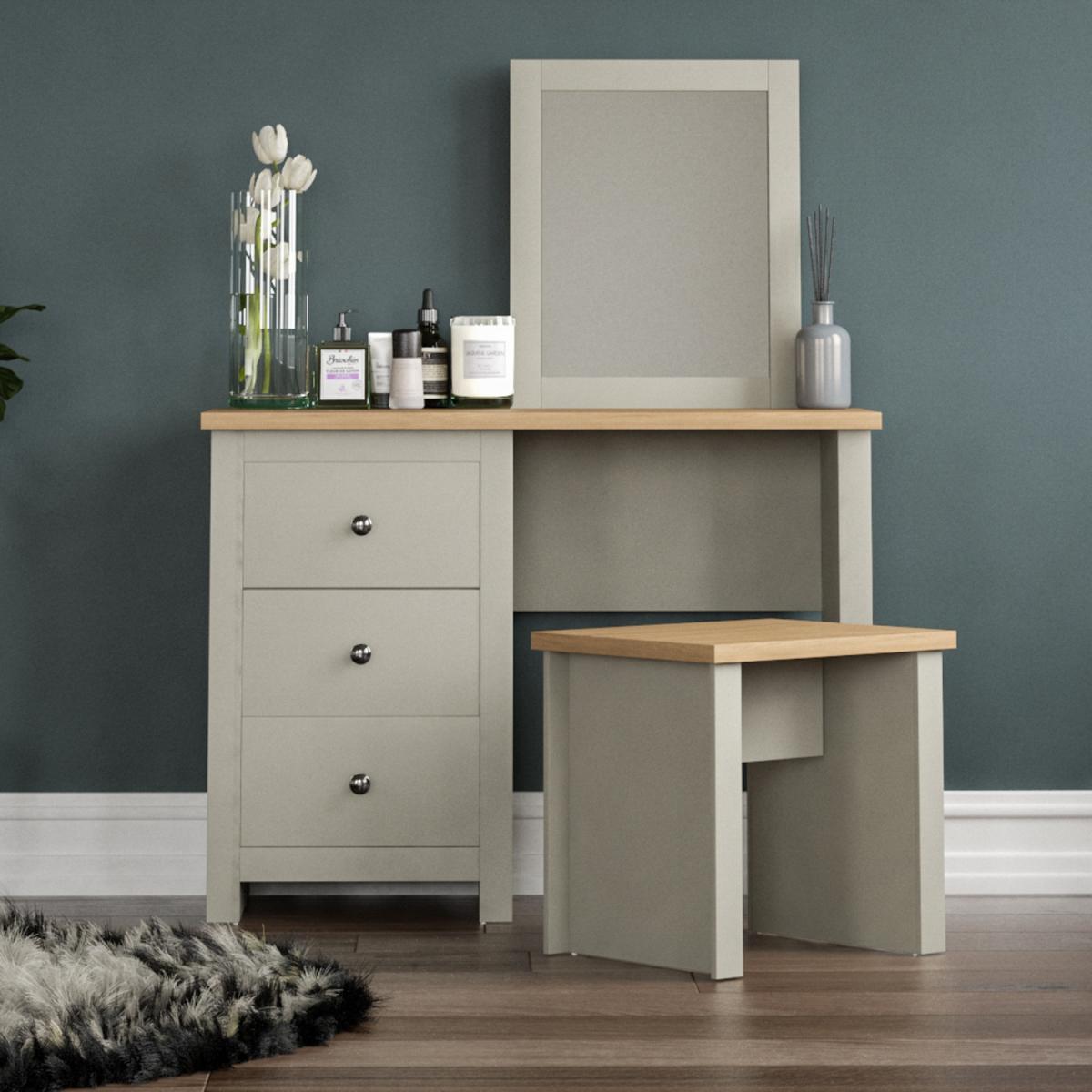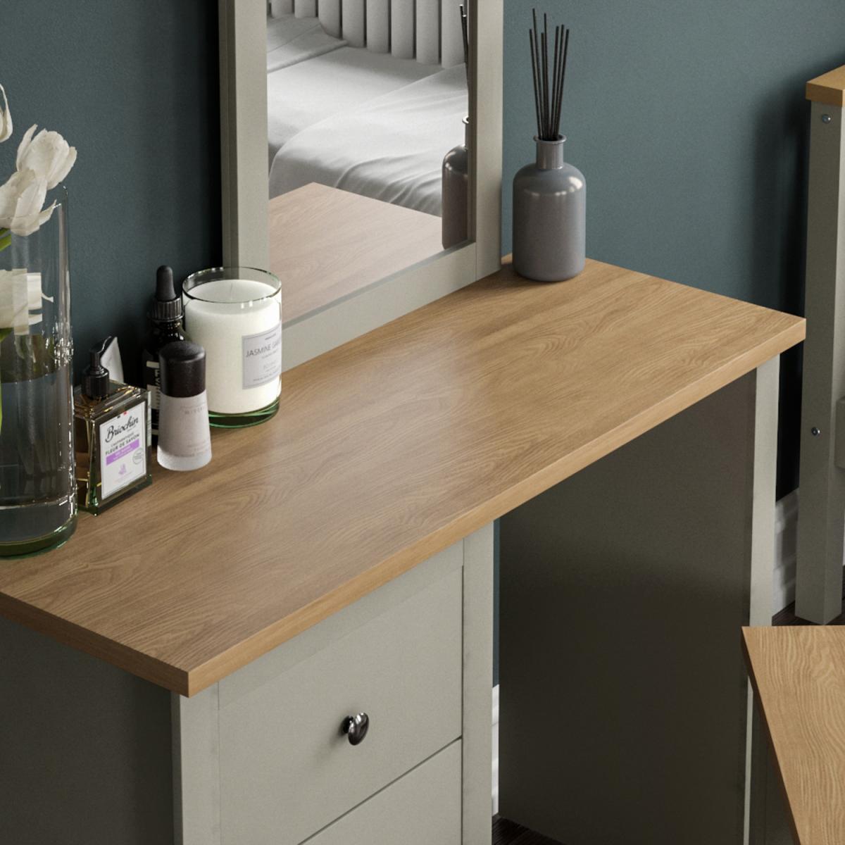 The Arlington dressing table set is a great choice for those seeking a stylish yet practical piece. Its neutral grey tone offers versatility, allowing it to complement various colour schemes - from modern minimalist to softer, more traditional interiors. I love how the natural wood top adds warmth and texture, preventing the space from feeling too cold or clinical. This set works especially well in bedrooms that prioritise functionality, offering ample storage with its drawers and a designated mirror space. Practical styling tips include adding organisational containers in the drawers to keep beauty products tidy, and layering with complementary accessories like a small vase or framed photos on the top to personalise the space. Overall, it’s a sleek and adaptable addition that balances style with everyday usability.