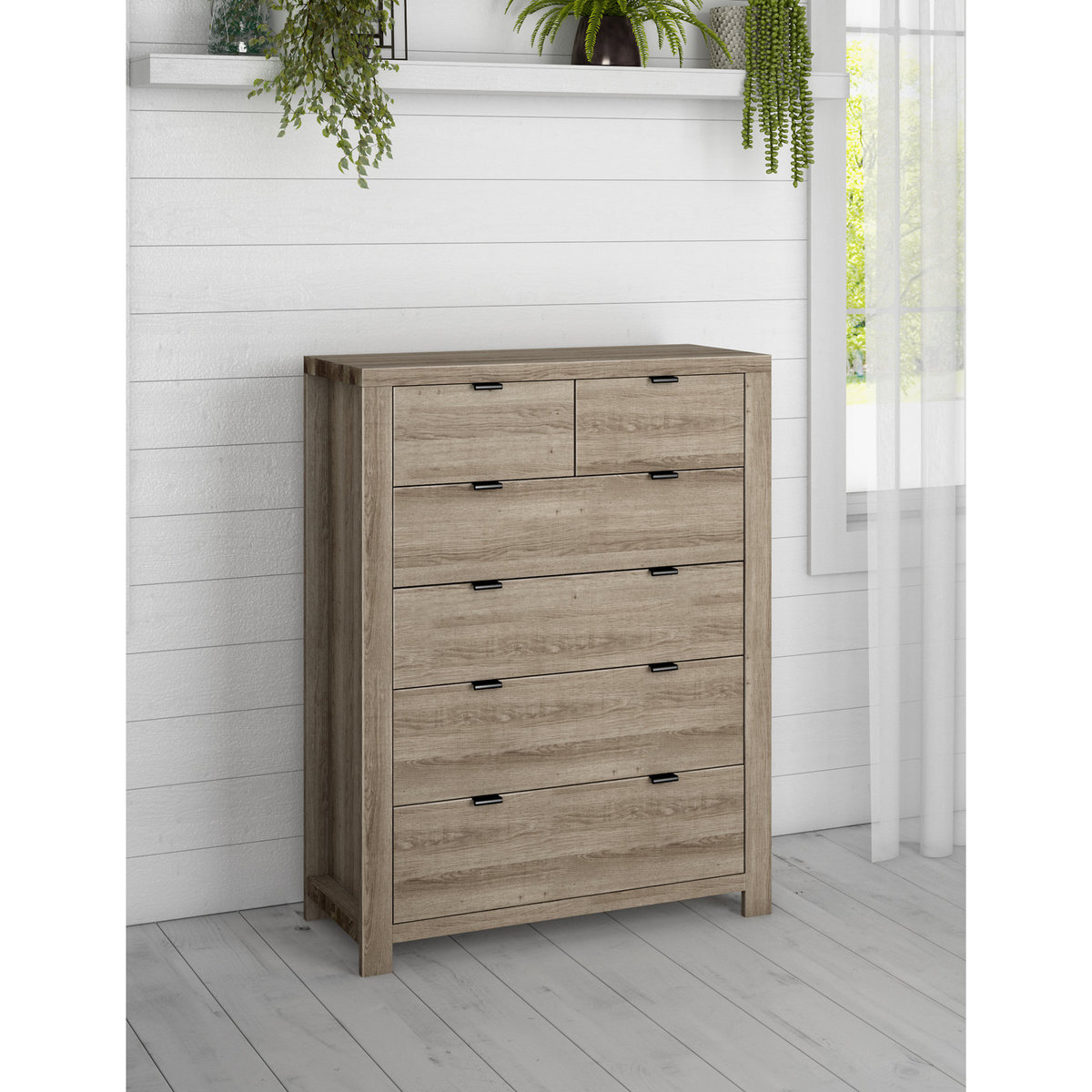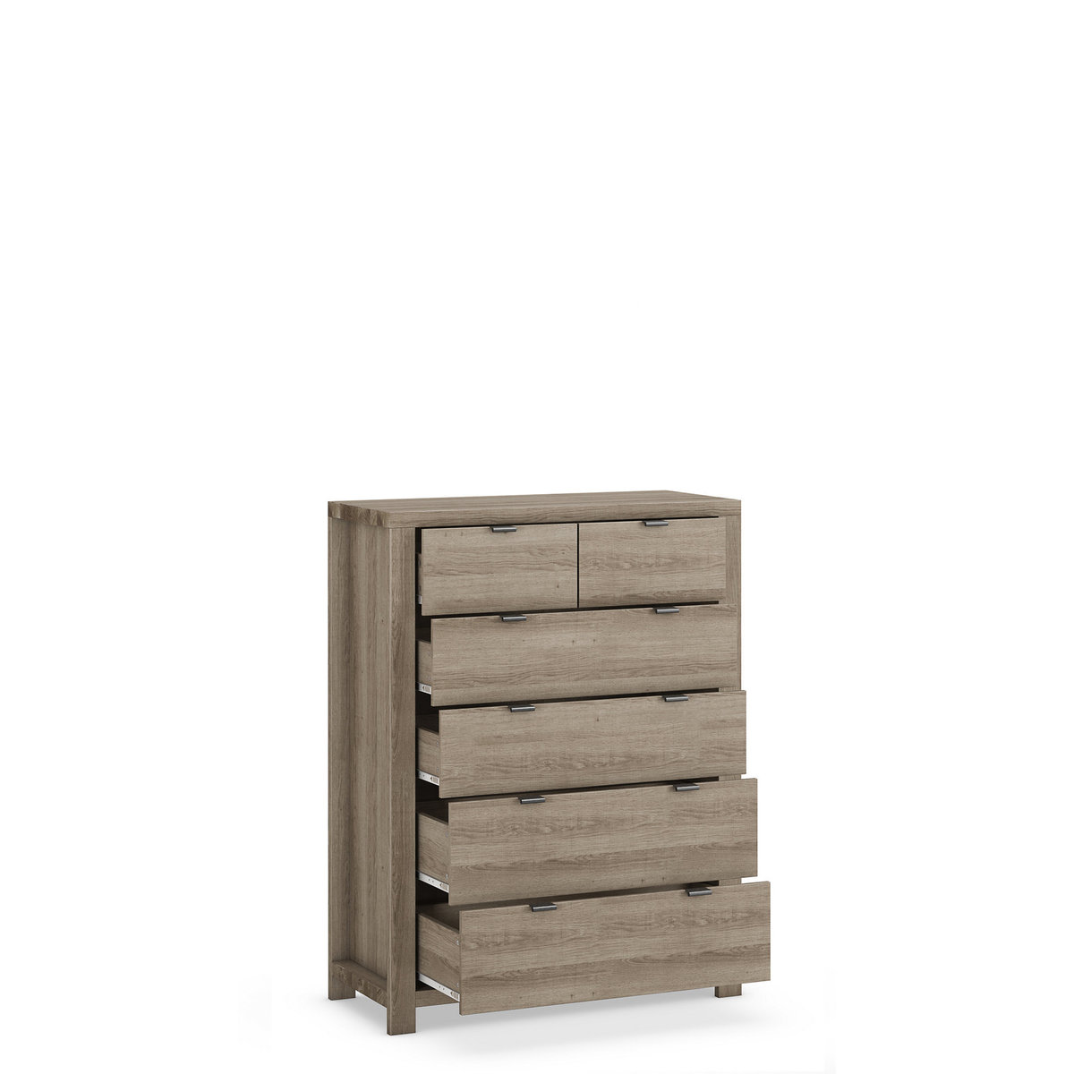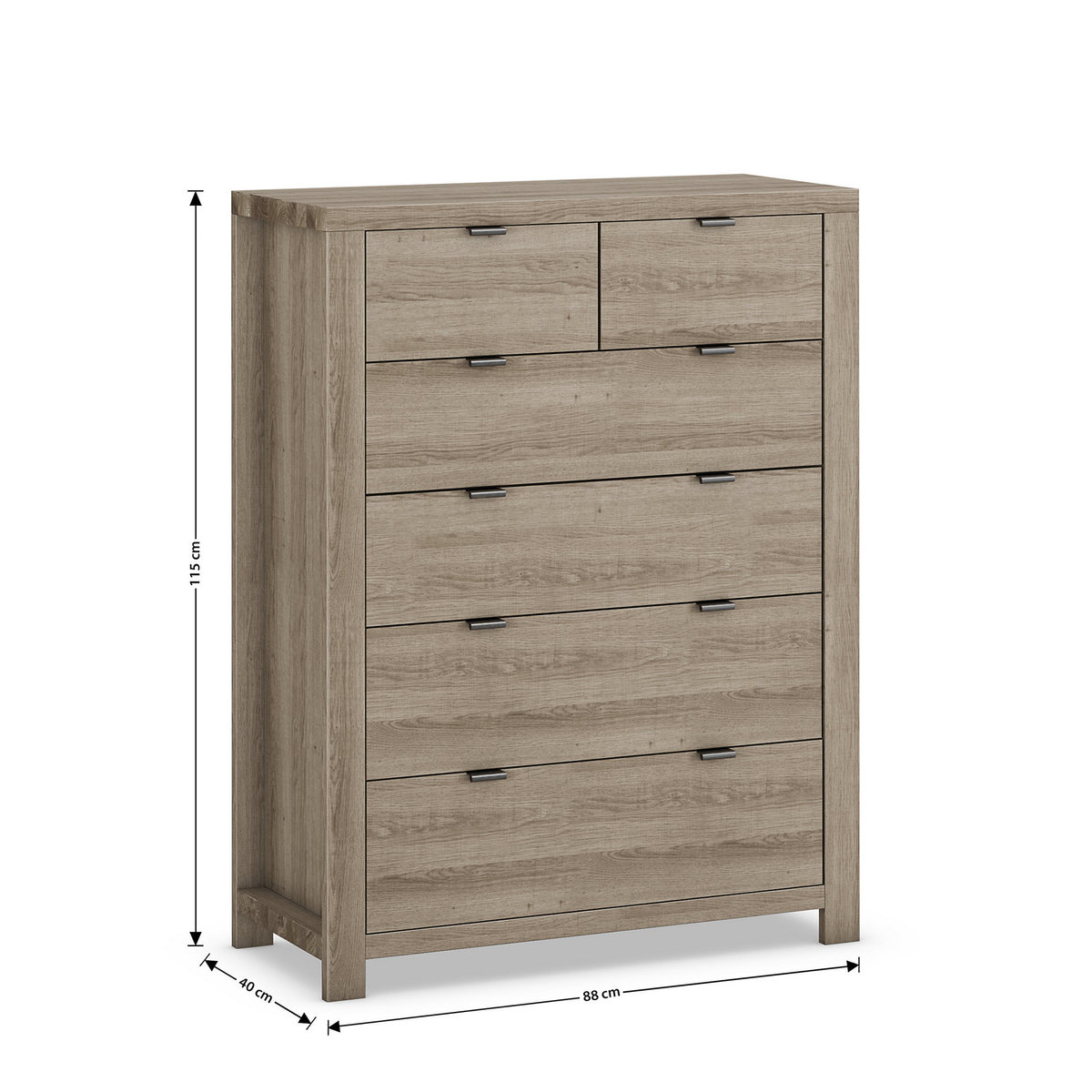 With a clean, modern design, this Arlo chest of drawers will look right at home in a contemporary styled bedroom and comes with antique chrome pull handles. It has an attractive ash brown wood-effect finish and is strong and sturdy, so it'll last over the long term. This chest of drawers comes with four larger compartments and two smaller compartments at the top, so it's great for general storage as well as clothing. We're so confident our furniture is built to last, our industry-leading guarantee covers any manufacturing failure on all furniture. That's our promise, and why our furniture comes with a 10-year guarantee that you can trust. Excludes: outdoor furniture and any issues that are a result of normal wear and tear, improper care or accidental damage.