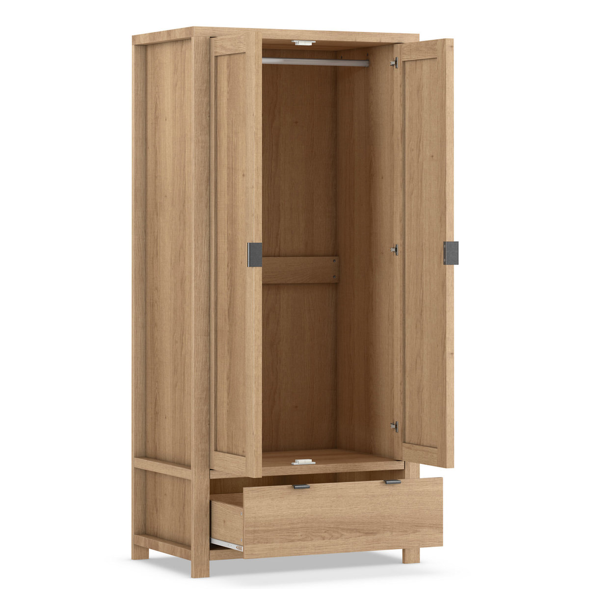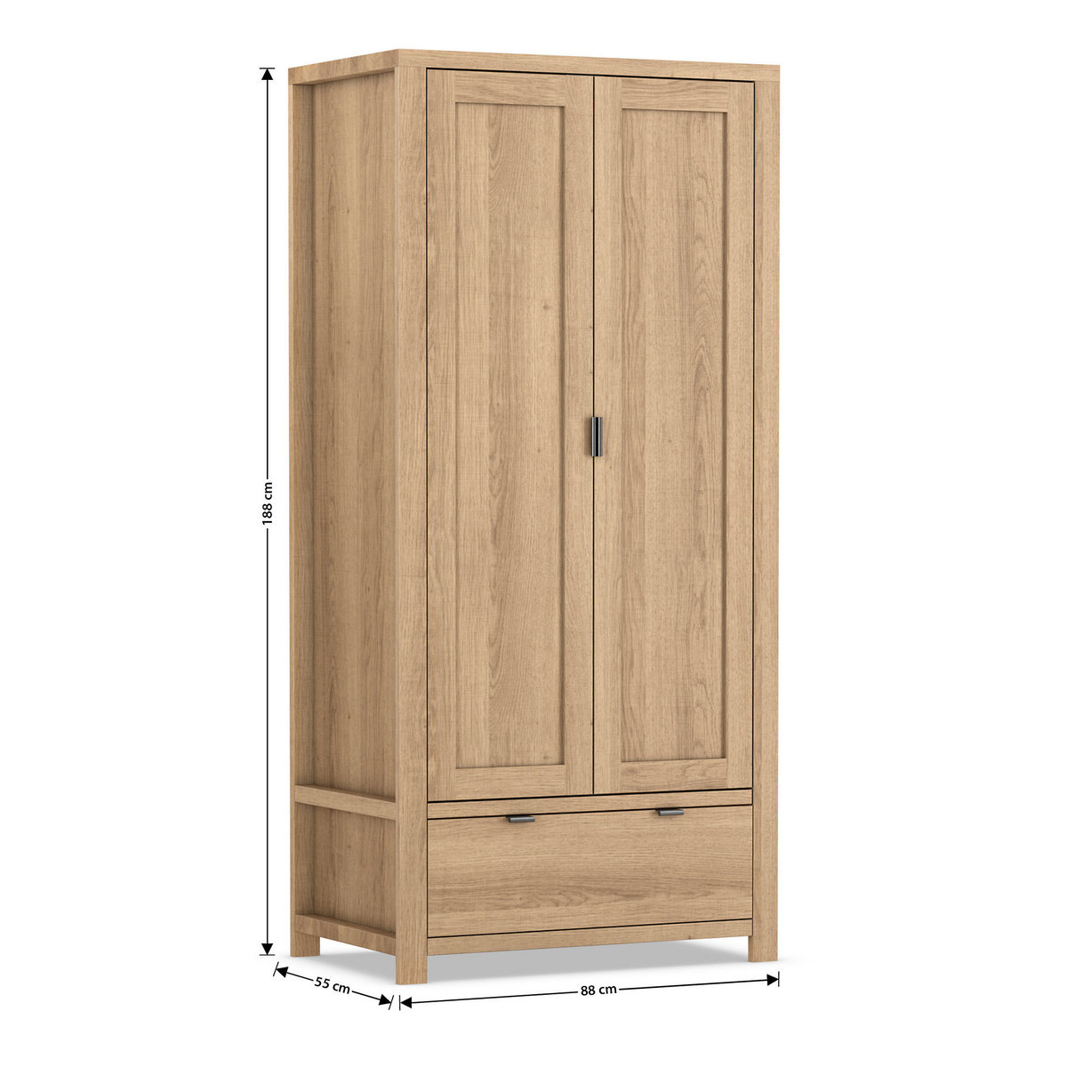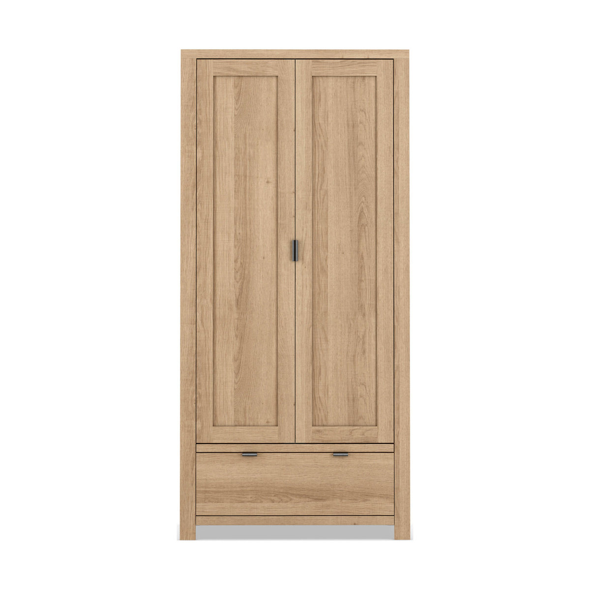As stylish as it is practical, our Arlo double wardrobe is the perfect new addition to your room or a guest bedroom. Designed with sleek, clean lines and featuring a single rail inside and a drawer down the bottom, this wardrobe is the perfect place to hang coats and store knitwear. Made with a natural oak-effect finish and antique chrome pull handles, this contemporary wardrobe easily pairs with a range of other home decor. We're so confident our furniture is built to last, our industry-leading guarantee covers any manufacturing failure on all furniture. That's our promise, and why our furniture comes with a 10-year guarantee that you can trust. Excludes: outdoor furniture and any issues that are a result of normal wear and tear, improper care or accidental damage.