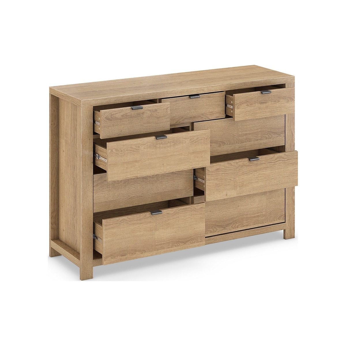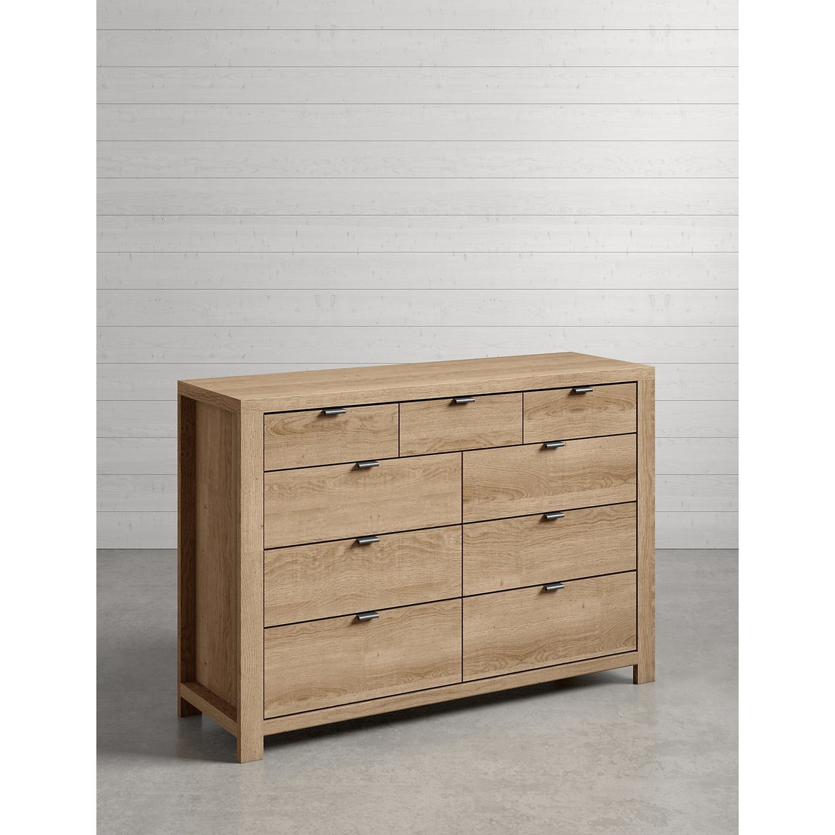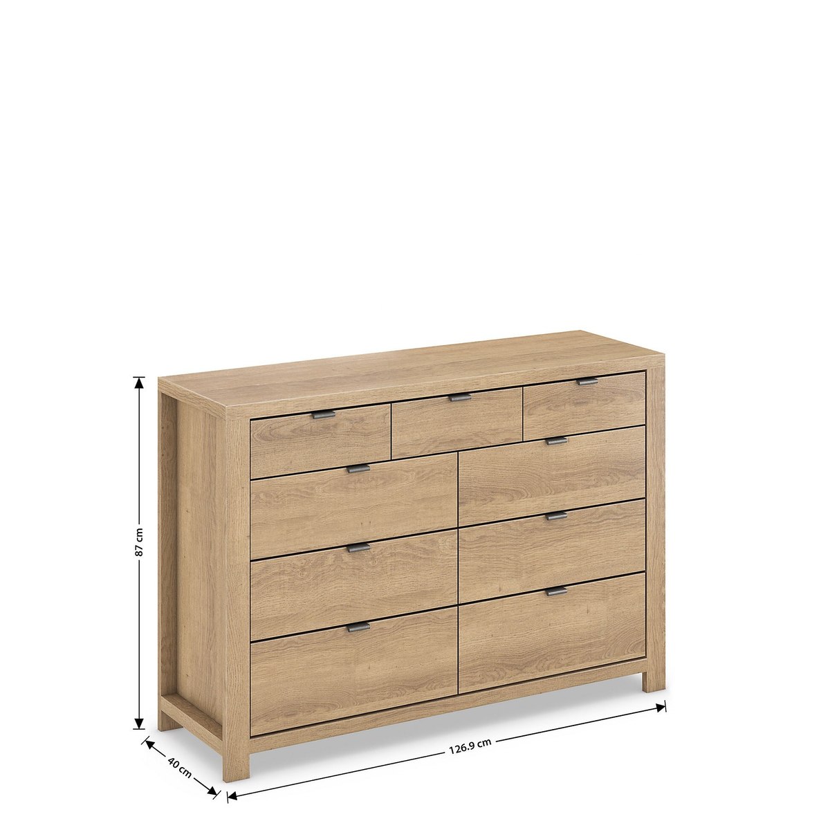 Bring a sense of order to your home with this Arlo chest, a clever storage solution with six large drawers and three smaller ones to keep all your household items neatly organised. Not only is it a practical addition to the home, but this chest of drawers features a clean and contemporary design that\u2019s easily paired with any home decor. For a traditional appeal, this chest has been crafted with a wood-effect finish and antiqued handles.