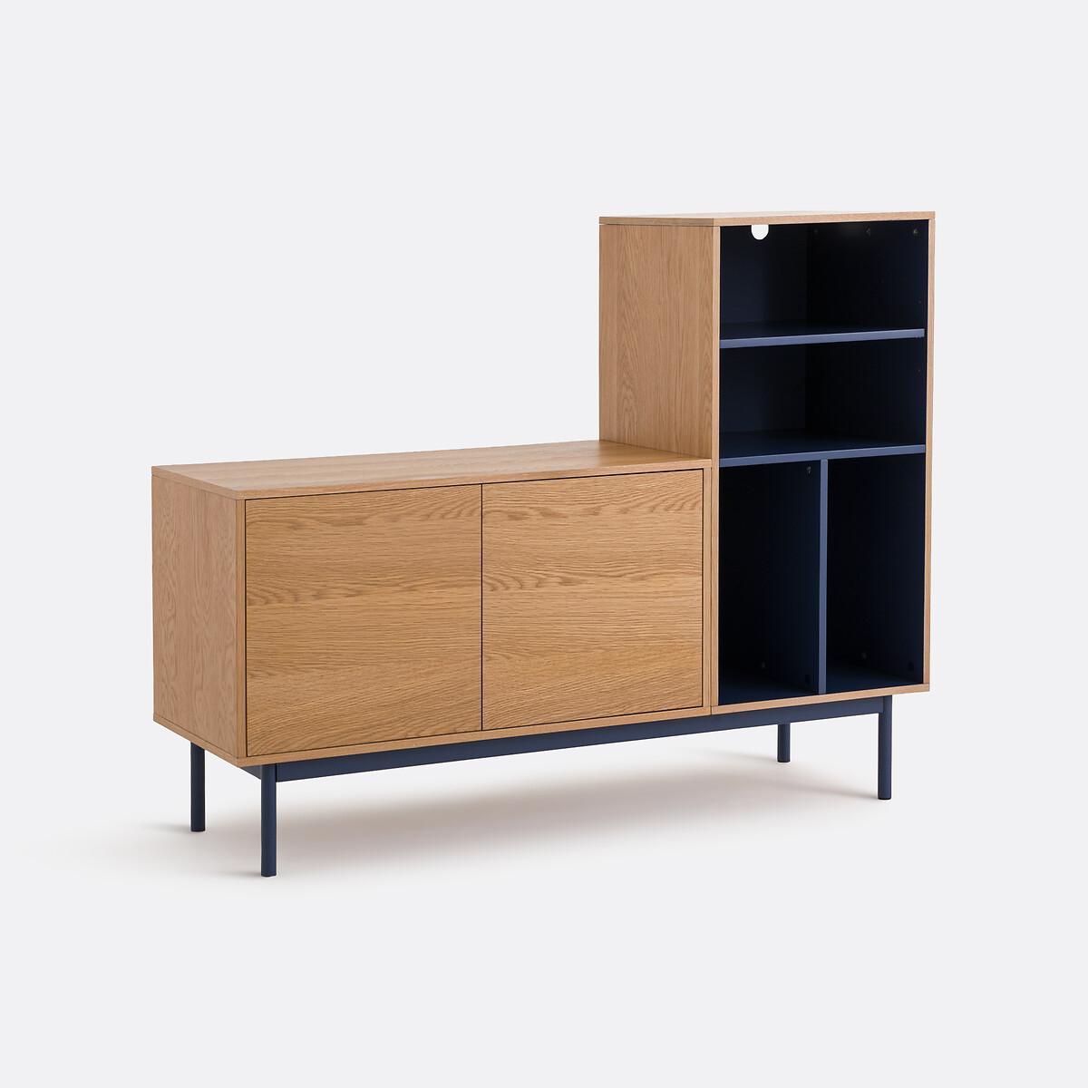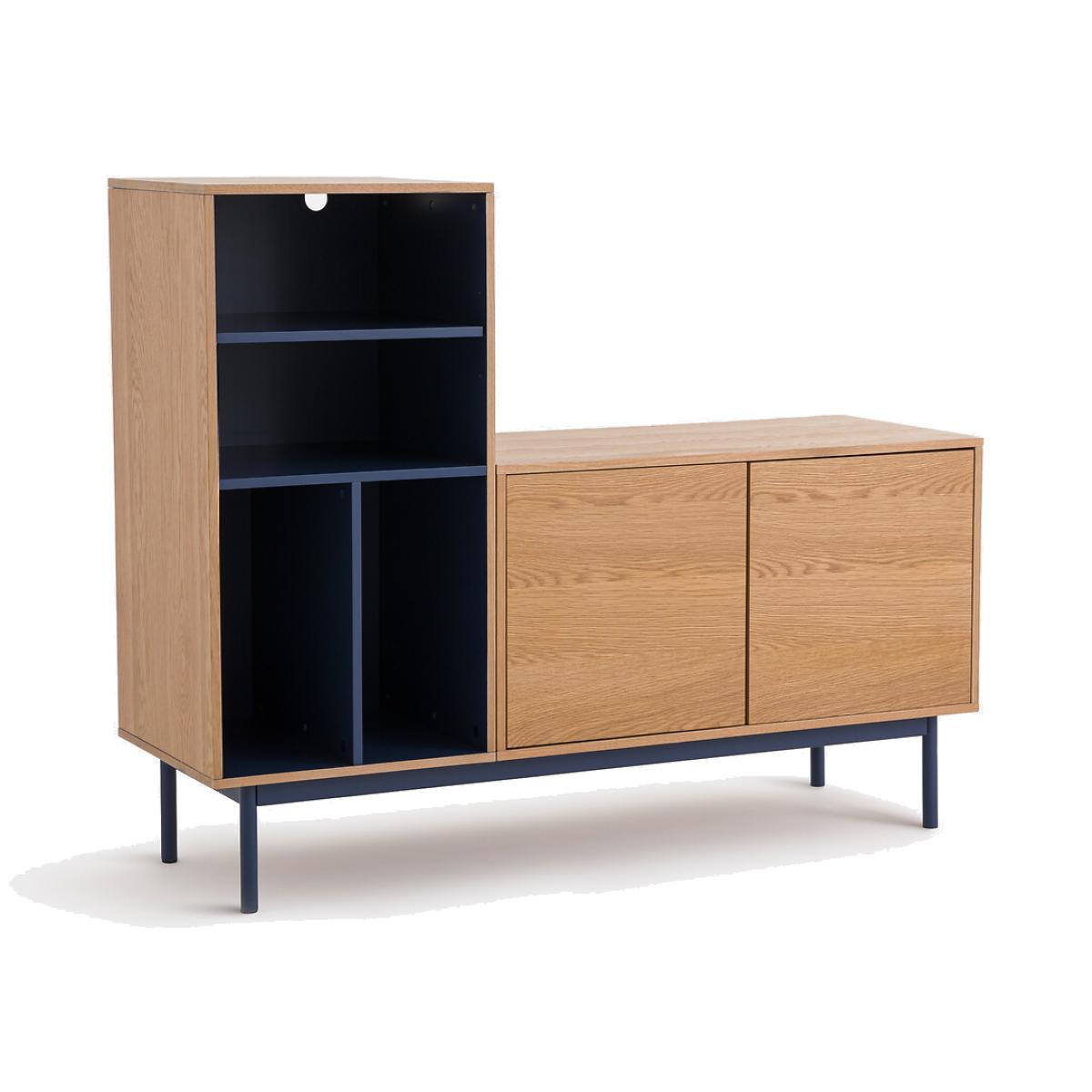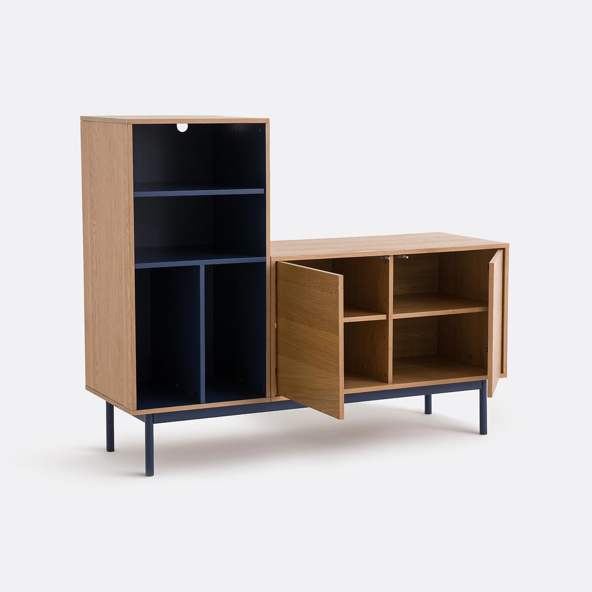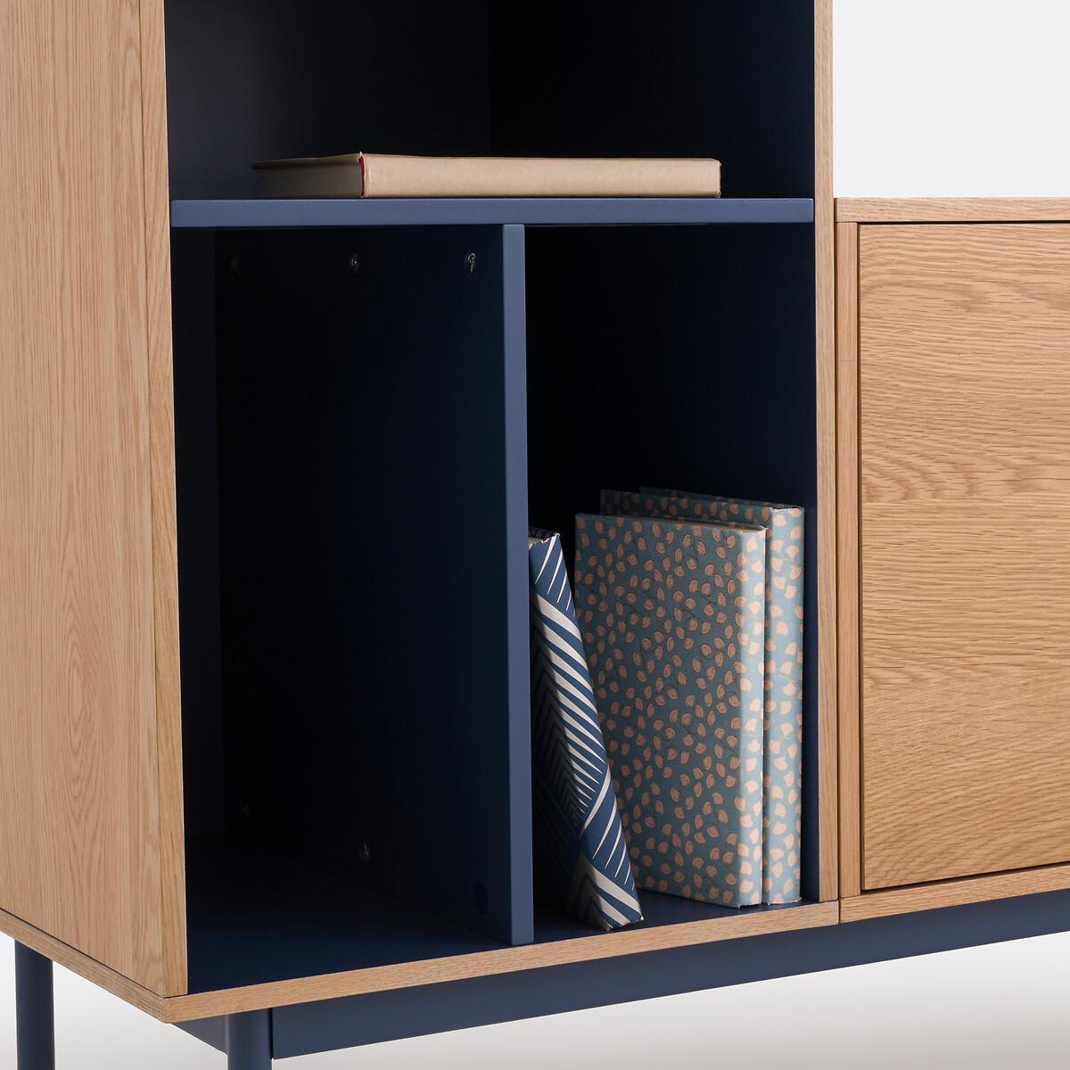 The Arloc modular sideboard is part of our Les Ingénieux collection. Creations full of ideas to make life simpler and everyday life more beautiful, imagined by our designers in France.. On one side, it's a 2-door sideboard. On the other it's a a high sideboard with 4 open compartments. With its light oak and deep blue, the Arloc modular sideboard is the perfect storage solution. Created by La Redoute Intérieurs. Why you will like it • Being modular, the tall unit can be positioned to the right or left during assembly, to adapt to all room configurations • Made from FSC® certified MDF from sustainably managed forests:yes to reasoned production. Product Details • Oak veneered MDF, nitrocellulose varnish finish • Lower box with 2 doors with soft-closing system, and height-adjustable interior shelf • Tall box with 4 fixed shelves in blue-painted MDF • Powder-coated iron legs • Cable entry hole at top of vertical box • Plastic pads on feet • People required for assembly: 2. Quality Info • Soft-closing : soft, silent door closing system, also preventing fingers from being trapped. Dimensions Overall • Length: 136.5cm • Height: 110cm • Depth: 45cm • Weight: 56.1kg. Lower box • Width: 84.8cm • Height: 66.5cm • Depth: 45cm. Tall box • Width: 46.5cm • Height: 110cm • Depth: 45cm. Usable space • External vertical compartments :W20.9 x H43.4 x D42.4cm • External horizontal compartments : W43.4 x H20.2 x D42.4cm • Interior compartment:W42.4 x H40 x D40cm • This product requires assembly. • WOOD FROM SUSTAINABLY MANAGED FORESTS. FSC® certified wood comes from forests that are environmentally, socially and economically well managed. Dimensions and weight of parcel2 parcels • W30.5 x H16 x D54.5cm. 39kg • W100 x H14 x D54.5cm. 23.4 kg