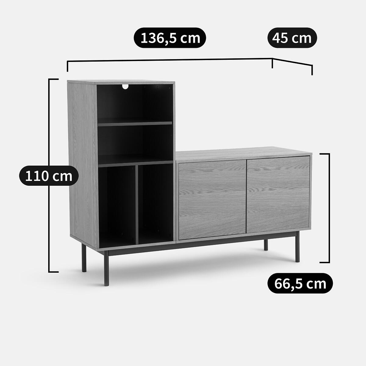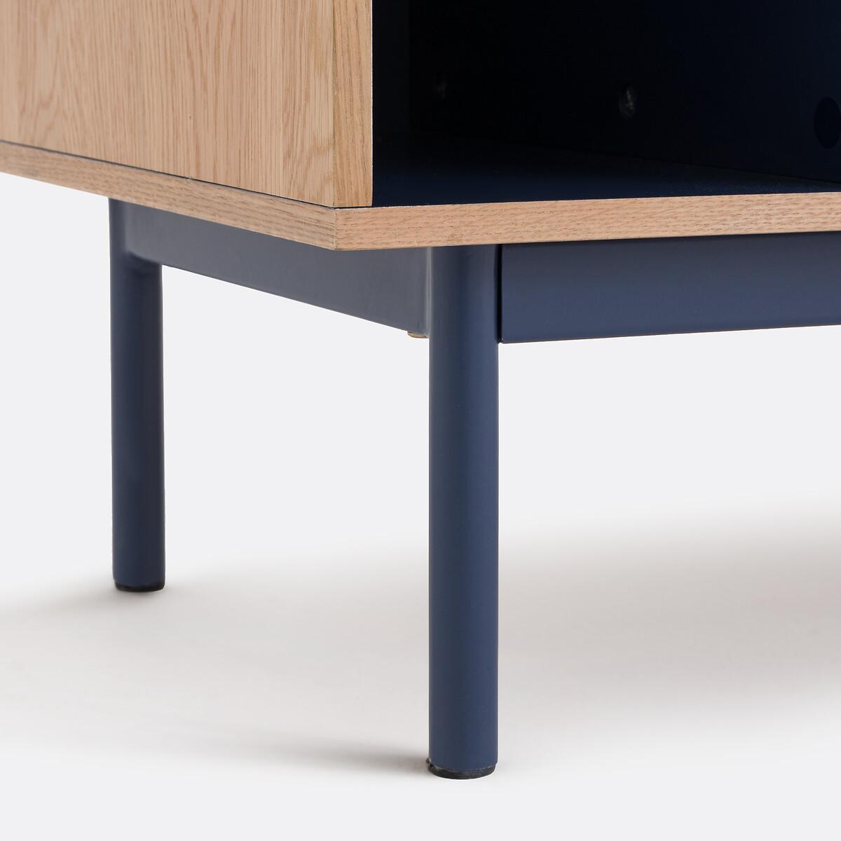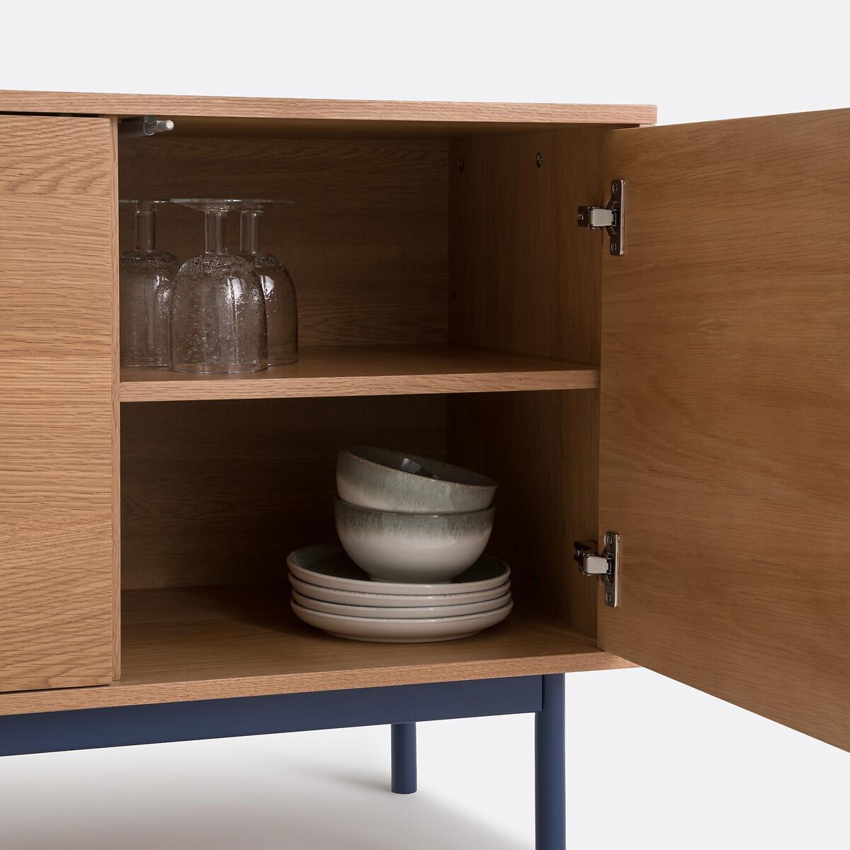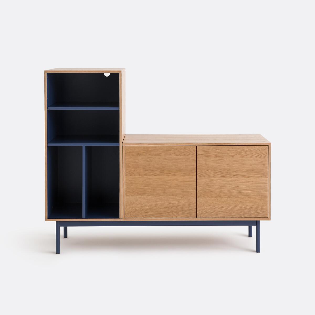 The Arloc modular sideboard is part of our Les Ingénieux collection. Creations full of ideas to make life simpler and everyday life more beautiful, imagined by our designers in France.. On one side, it's a 2-door sideboard. On the other it's a a high sideboard with 4 open compartments. With its light oak and deep blue, the Arloc modular sideboard is the perfect storage solution. Created by La Redoute Intérieurs. Why you will like it • Being modular, the tall unit can be positioned to the right or left during assembly, to adapt to all room configurations • Made from FSC® certified MDF from sustainably managed forests:yes to reasoned production. Product Details • Oak veneered MDF, nitrocellulose varnish finish • Lower box with 2 doors with soft-closing system, and height-adjustable interior shelf • Tall box with 4 fixed shelves in blue-painted MDF • Powder-coated iron legs • Cable entry hole at top of vertical box • Plastic pads on feet • People required for assembly: 2. Quality Info • Soft-closing : soft, silent door closing system, also preventing fingers from being trapped. Dimensions Overall • Length: 136.5cm • Height: 110cm • Depth: 45cm • Weight: 56.1kg. Lower box • Width: 84.8cm • Height: 66.5cm • Depth: 45cm. Tall box • Width: 46.5cm • Height: 110cm • Depth: 45cm. Usable space • External vertical compartments :W20.9 x H43.4 x D42.4cm • External horizontal compartments : W43.4 x H20.2 x D42.4cm • Interior compartment:W42.4 x H40 x D40cm • This product requires assembly. • WOOD FROM SUSTAINABLY MANAGED FORESTS. FSC® certified wood comes from forests that are environmentally, socially and economically well managed. Dimensions and weight of parcel2 parcels • W30.5 x H16 x D54.5cm. 39kg • W100 x H14 x D54.5cm. 23.4 kg