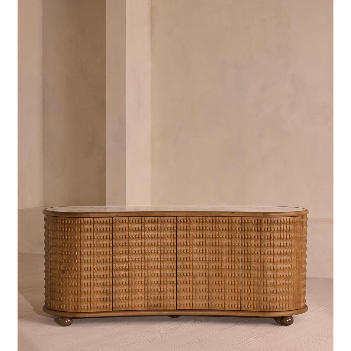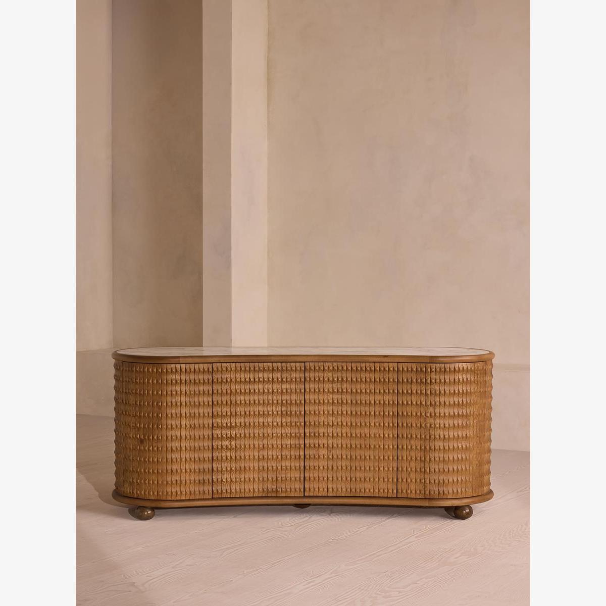 A curved silhouette carved from oak is accentuated from above by a Calacatta Aura marble inset. Taking inspiration from the wooden finishes seen throughout Soho House Chicago, the Armando sideboard spotlights its solid oak construction with a highly textured, intricately carved finish, and a mix of mid-tone and brown staining. Its softly curved, pill-shaped silhouette conceals three cupboards with push-catch doors.
