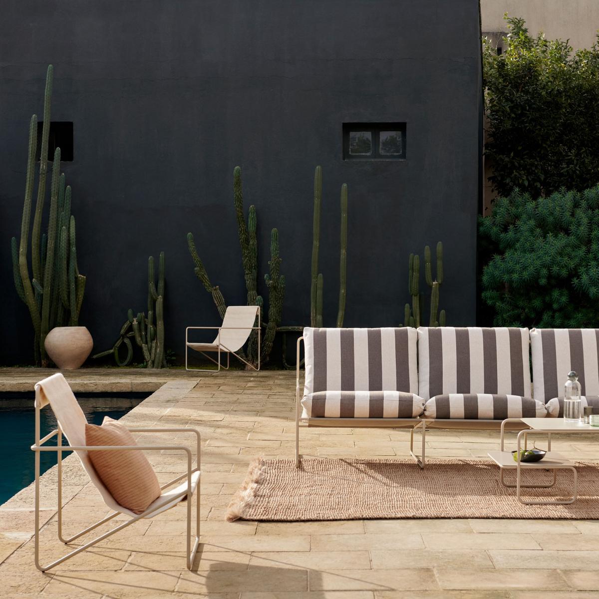 This modernist-inspired armchair has an aerial silhouette with clear geometric lines. The Desert armchair is made up of a thin tubular steel structure from which hangs a seat in flexible, comfortable canvas, decorated with stylised patterns. The classic style with its modernist accents receives a twist with the modernity of the patterns. Eco-designed, the hand-woven fabric is made from 53 recycled plastic bottles. The fabric is interchangeable and easy to maintain (wash at 30°). The Desert armchair is weather-resistant and will look just as good in your sitting room as on your terrace. A true invitation to relaxation, the flexibility of the fabric as well as the enveloping shape of the armchair leave plenty of room for comfort!
