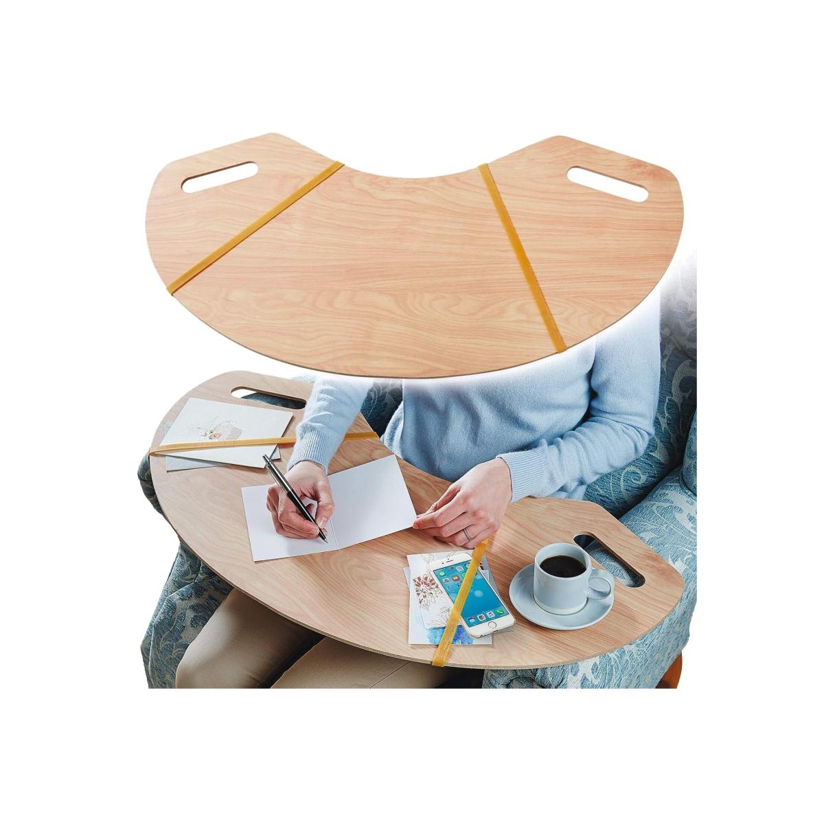 Always have a sturdy table top to hand with this lightweight and portable chair desk. Gently curved, with integral handles either end, it rests neatly and securely on the arms of your favourite chair to provide a level and sturdy work top. Strong elasticated bands keep flyaway papers securely in place, even if you move or tip the table. It makes a great lap tray for all sorts of daily activities, from writing letters and browsing your laptop to even eating your supper. When not in use, it slips neatly away for storage, taking up so much less space than a table or desk.