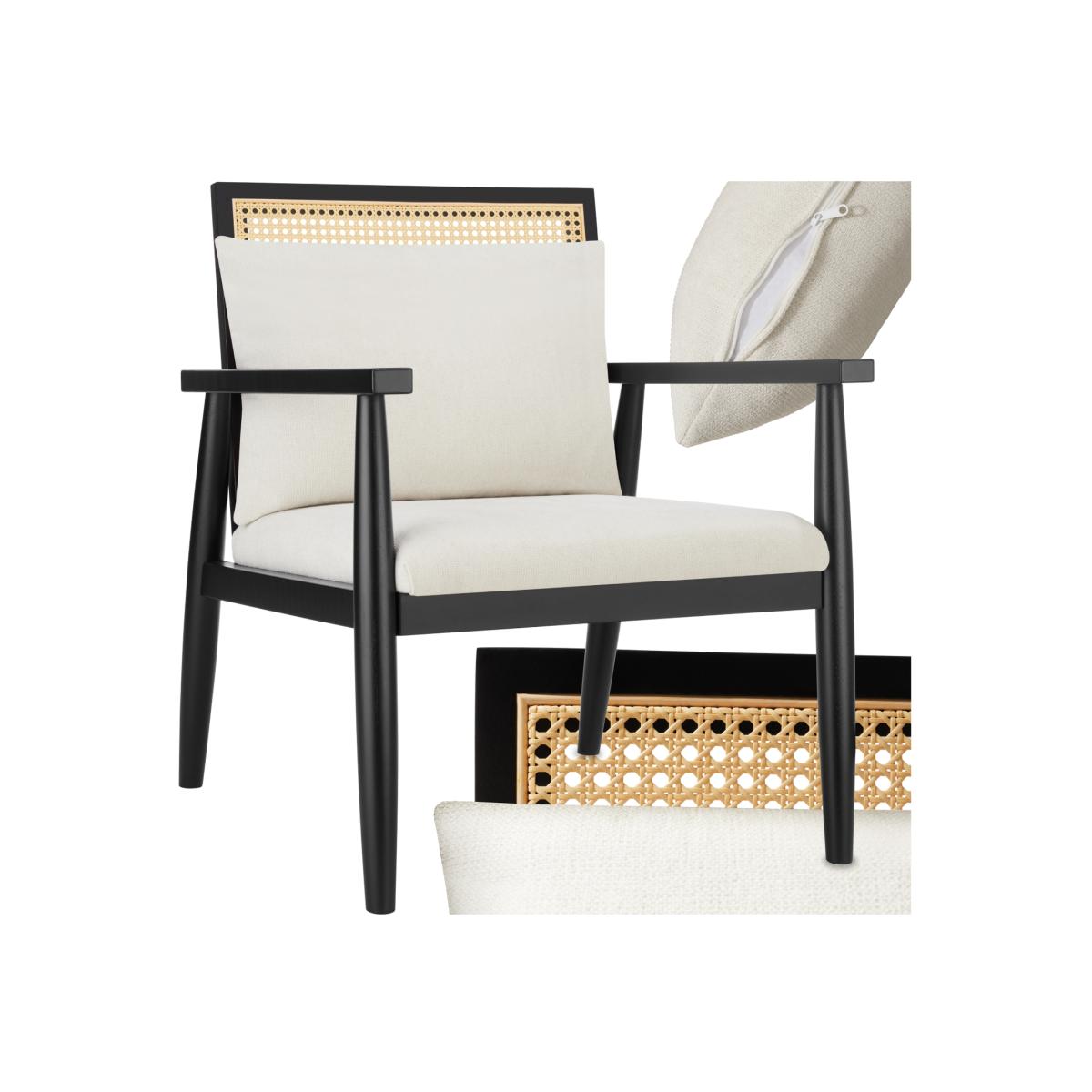 Experience unparalleled comfort and timeless design with the elegant armchair Manuela by tectake. This exclusive lounge chair sets new standards for relaxation. The armchair's stylish construction impresses with its high-quality workmanship and the solid, extremely stable wooden frame in chic black. The dining chairs' thickly padded seats and thick back cushions with removable and washable fabric covers guarantee you the highest seating comfort. The large backrest and the comfortable armrests ensure an optimal sitting position and invite you to linger and enjoy. A special highlight of the armchair is the use of Viennese wicker in the backrest. This detailed design element gives the chair a charming, nostalgic look and makes it an eye-catcher in any room. Despite the armchair's robust construction, it can be quickly and easily assembled, so you can start to enjoy your new favourite spot. The armchair Manuela is not just a piece of furniture, but an invitation to relax and feel good - bring a touch of luxury into your home and discover the perfect symbiosis of functionality and design!