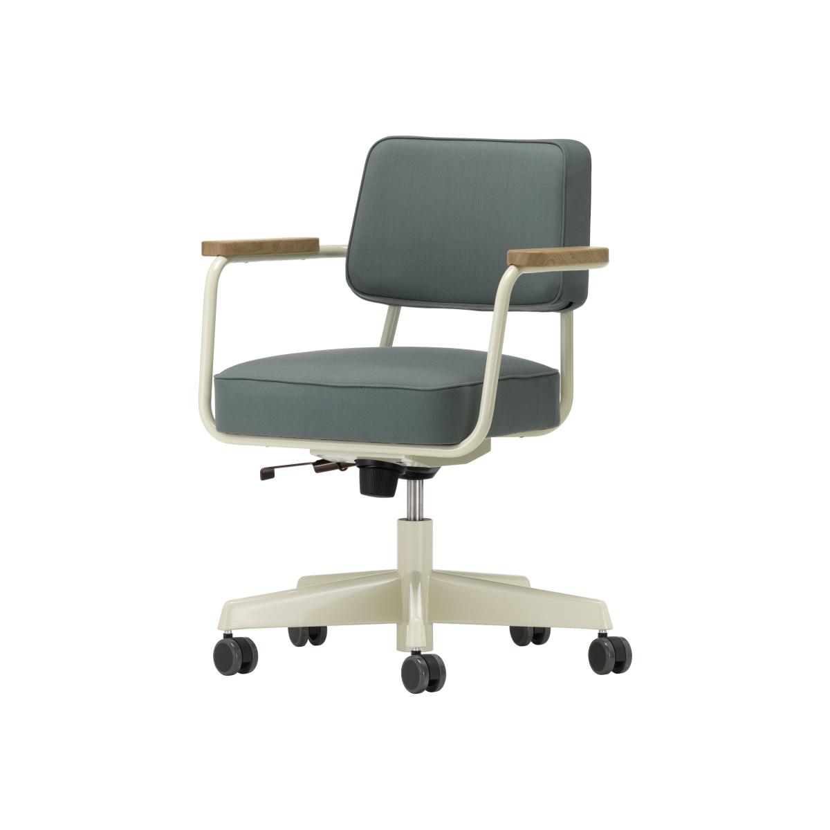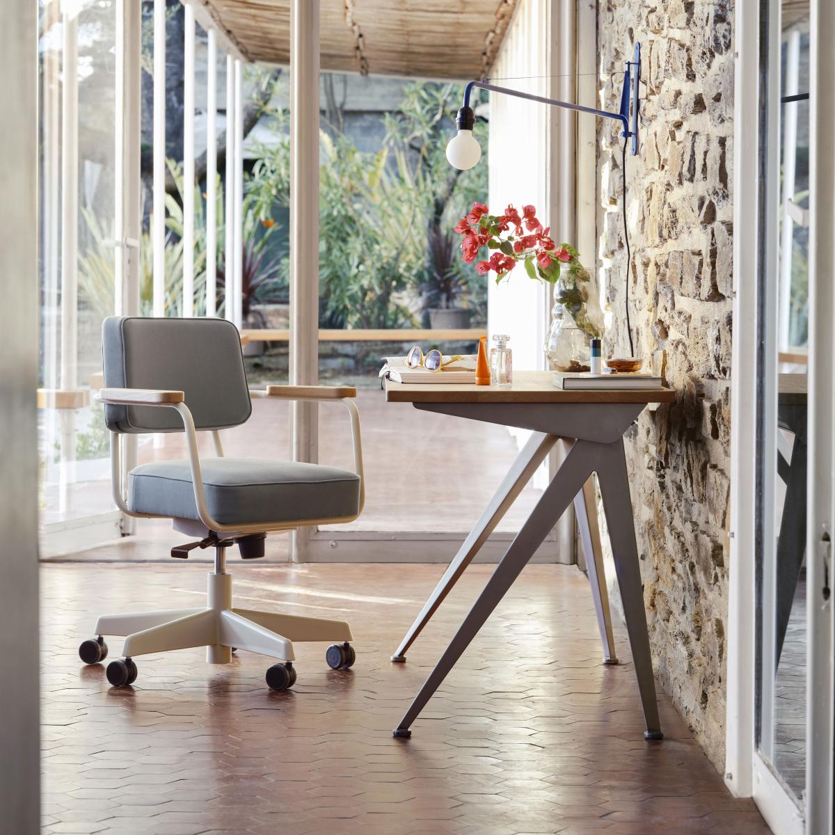Treat yourself to an ORIGINAL iconic piece by Vitra. An original will always hold its value. It will stay with you for your whole life and outlive you, being passed on to the next generation. A self-taught architect with a passion for industrialising buildings, Jean Prouvé (1901 - 1984) is now considered a leading architect and one of the greatest designers of the 20th century, on a par with Le Corbusier and Charlotte Perriand. A pioneer, Prouvé played a major role in the development of mass production techniques in the European post-war modernist movement. Jean Prouvé developed a "constructive thought" based on a logic of series manufacturing and functionality to create an aesthetic that’s purified of all artifice. The designer has a wide portfolio of designs ranging from prefabricated homes to furniture for offices, classrooms and interiors. Jean Prouvé's creations have become icons of the post-war period and have spanned the whole century. Developed by Jean Prouvé in 1951, the Direction Pivoting Armchair is a typical example of the distinctive structural aesthetics of his designs. It combines simple surfaces with a comfortable seat and backrest, thus forming an architectural entity. This armchair on wheels has a swivel seat which is infinitely height-adjustable by means of a gas spring. The backrest has a rear tilt mechanism that adapts to the user's weight (can be locked in the upright position). Combined with generous padding, these features ensure great comfort. This chair is ideal for any type of workplace or home office. The understated character of the armchair suits a wide variety of interiors. Its ample padding, as well as its armrests in oiled solid wood, suggest welcoming comfort. Comes in a multitude of colours: please ask us.