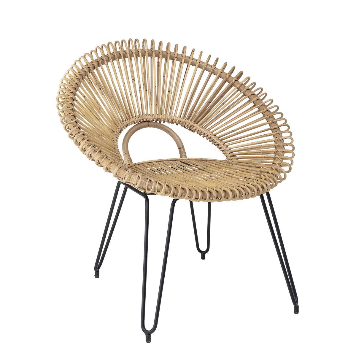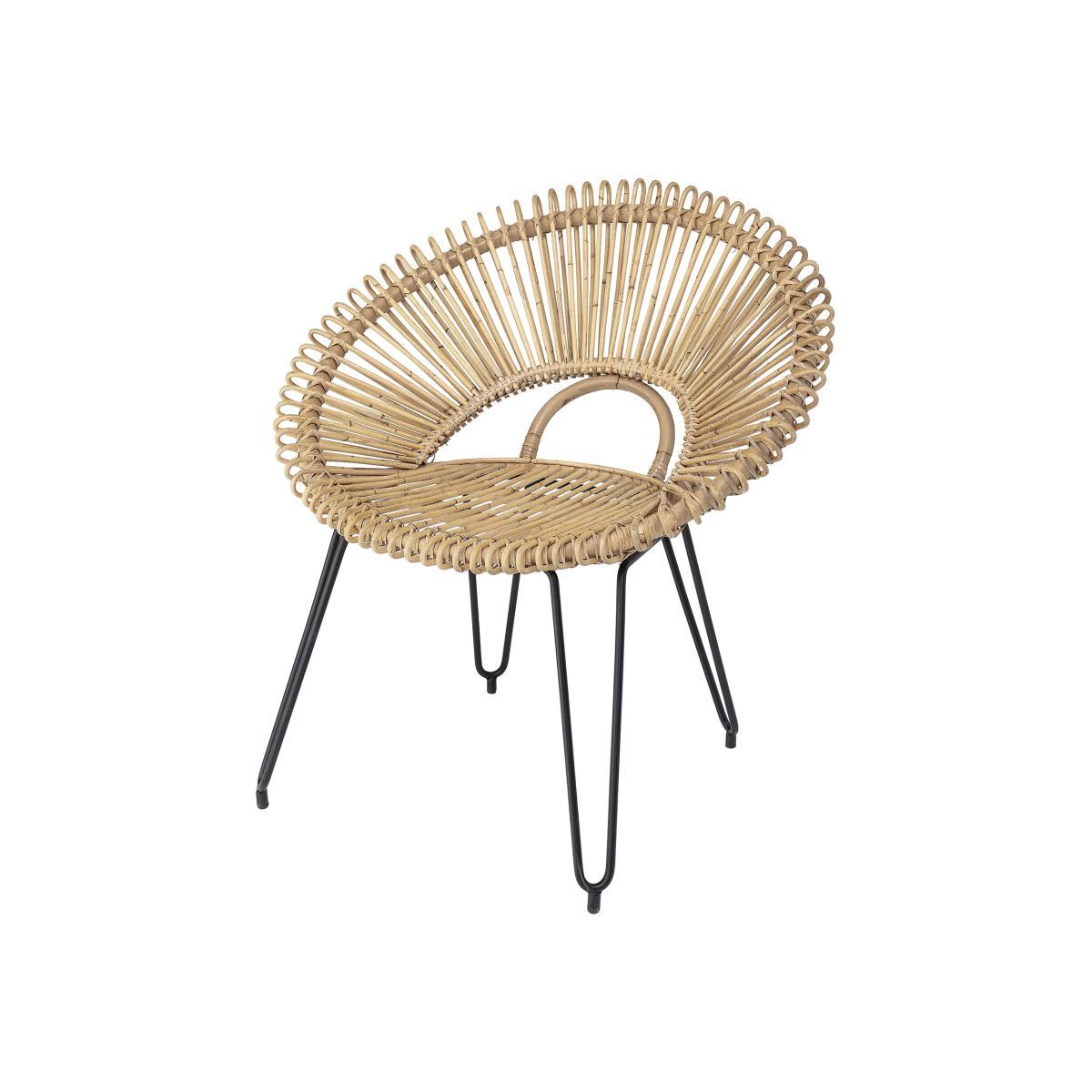 Go for this rattan armchair with a retro and bohemian style. The round and openwork seat is made up of rattan stems which draw repeating and highly graphical patterns. The black metal wired legs provide a vintage look to the outline. The light and mild rattan colour highlights the natural and Nordic origin of this piece and lends itself to all styles.