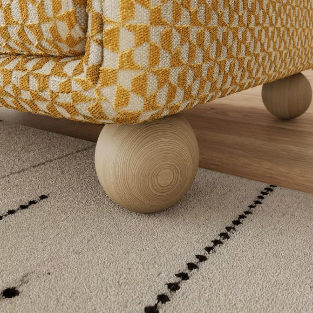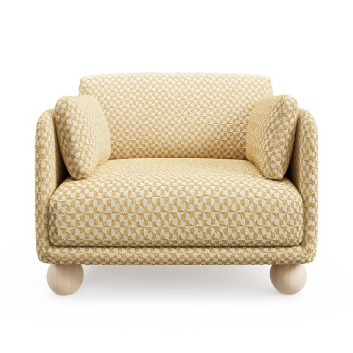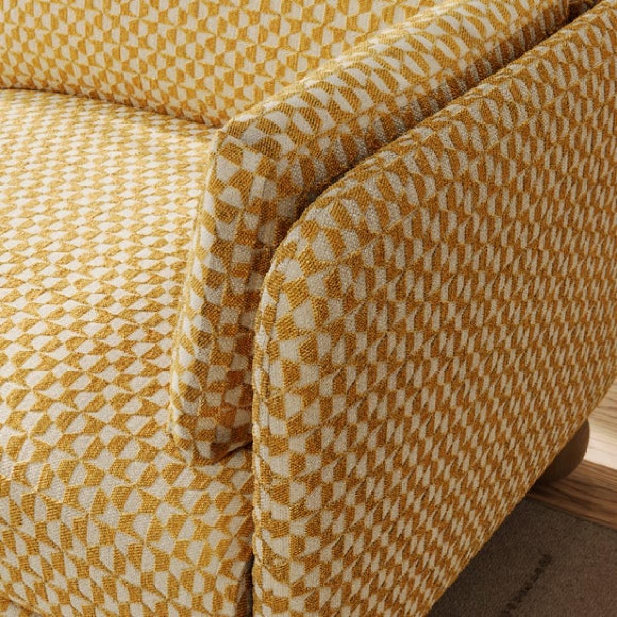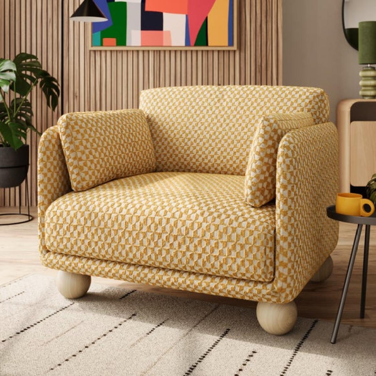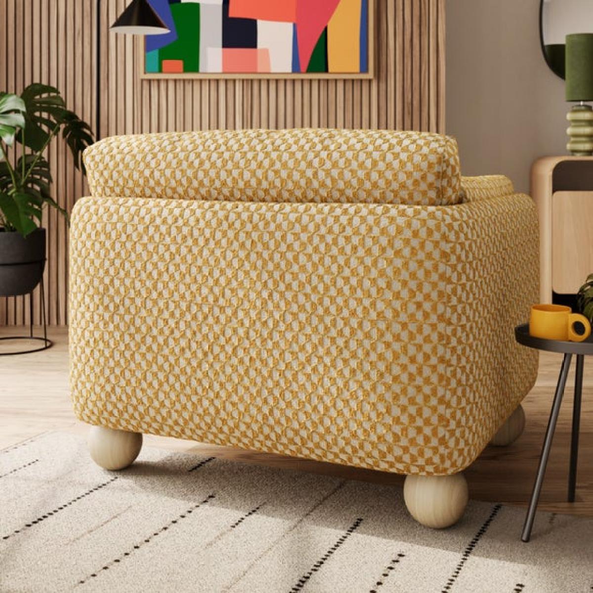 * Chenille upholstery * Geometric pattern * Retro style chair * Wooden ball feet * Foam and Fibre filled seat The Armitage Geo Chenille Snuggle Chair combines retro flair with contemporary comfort. Its soft chenille upholstery features a bold geometric pattern in warm ochre tones, adding a vibrant touch to your space. A fixed back keeps the look clean, while the foam and fibre-filled seat offers exceptional comfort for lounging. Finished with distinctive wooden ball feet, it’s a stylish statement piece with a nod to mid-century design. Ideal for creating a cosy spot with personality.