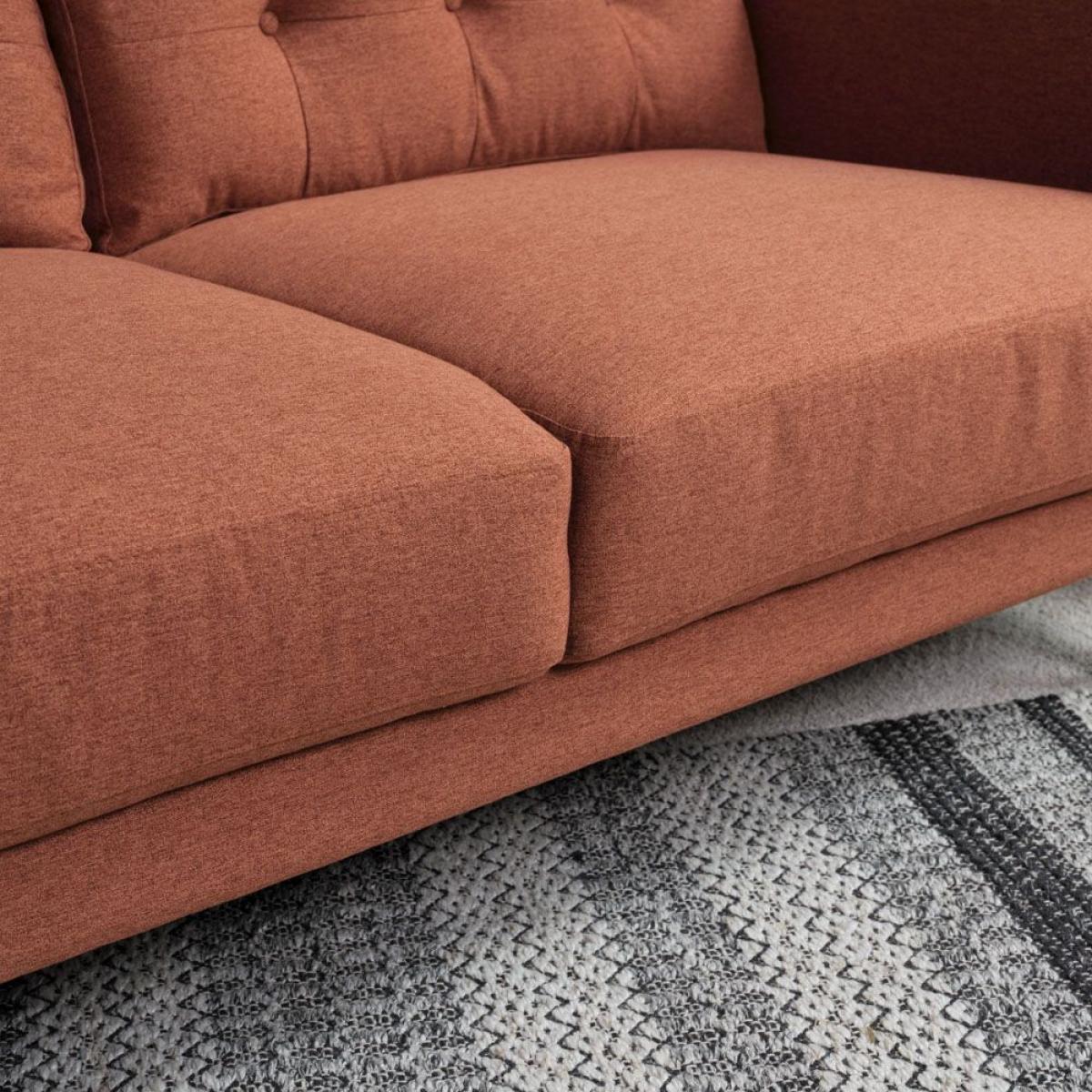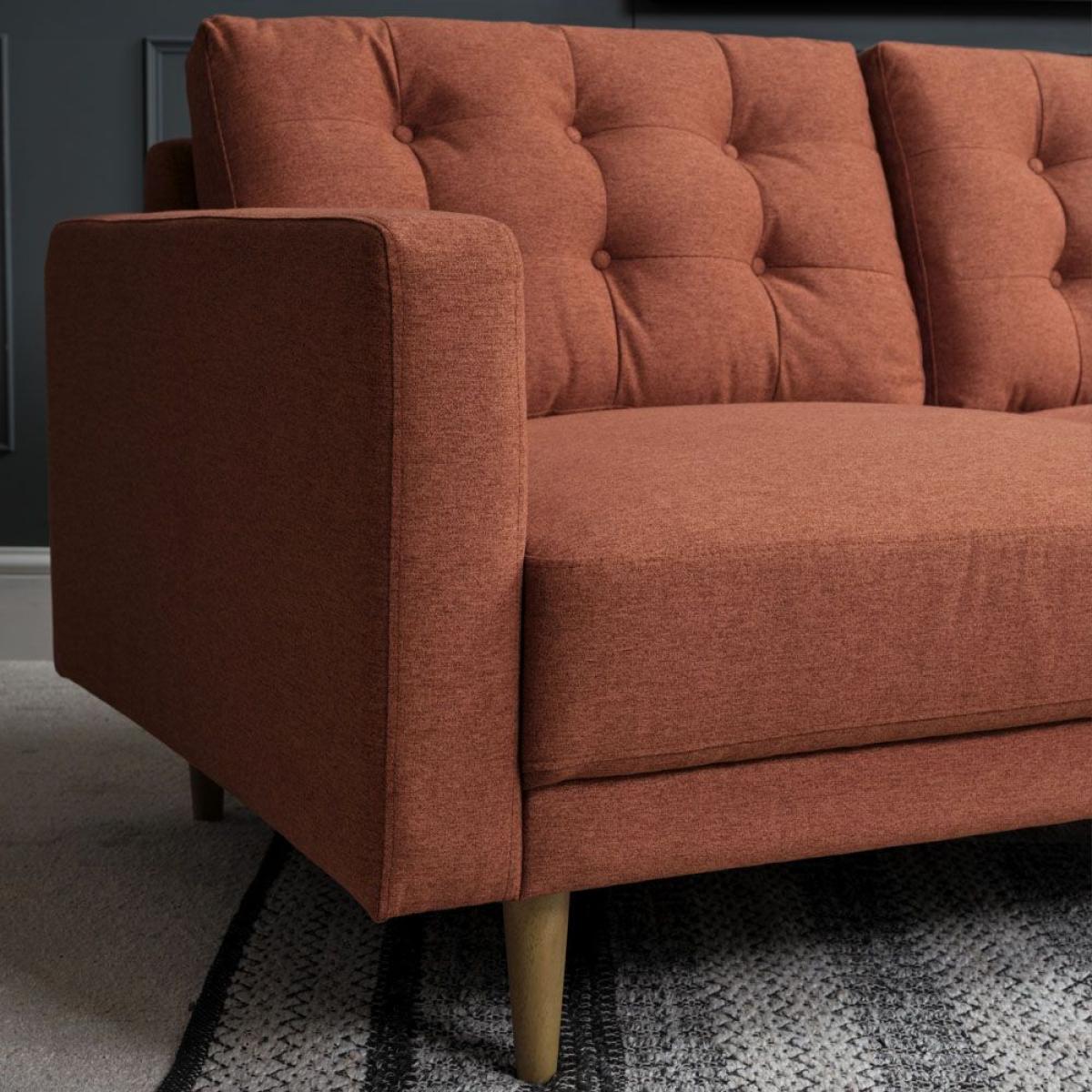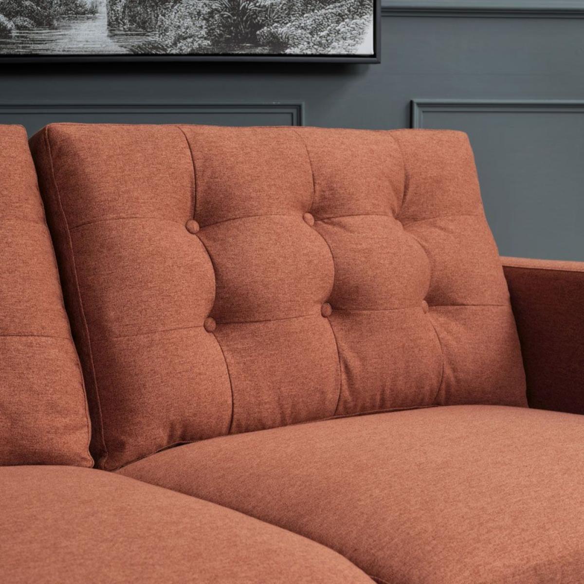 The Arnie sofa collection features this stunning 3 seater sofa in an eye-catching terracotta colour. Presenting a nod to traditional style with deep buttoned back cushions, this sofa also boasts attractive modern lines and tapered solid wooden legs, giving it a sleek silhouette and ready to introduce a touch of contemporary style to any family home. Dimensions: W184cm x H90cm x D94cm. Solid hardwood legs. Other colours available Swatch available upon request. Simple self assembly