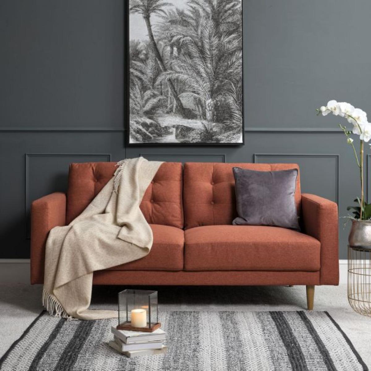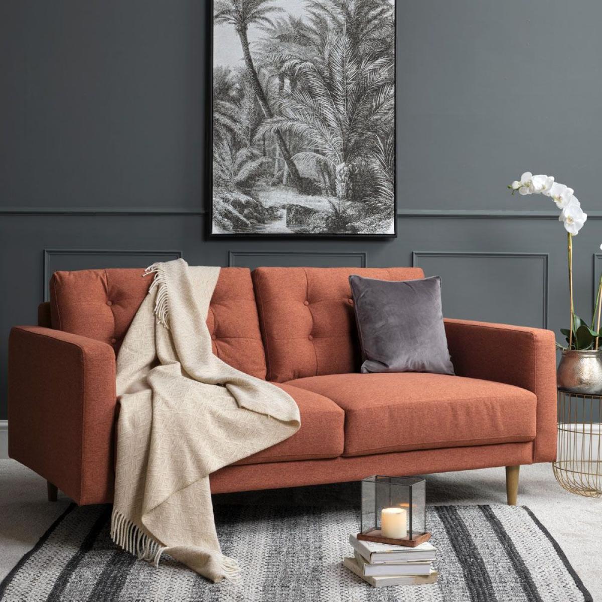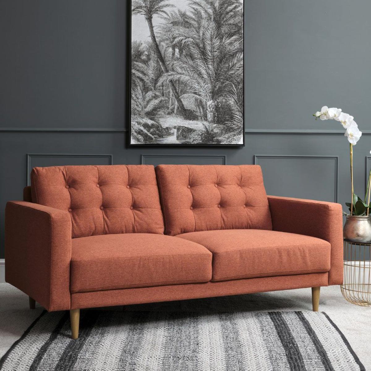The Arnie sofa collection features this stunning 3 seater sofa in an eye-catching terracotta colour. Presenting a nod to traditional style with deep buttoned back cushions, this sofa also boasts attractive modern lines and tapered solid wooden legs, giving it a sleek silhouette and ready to introduce a touch of contemporary style to any family home. Dimensions: W184cm x H90cm x D94cm. Solid hardwood legs. Other colours available Swatch available upon request. Simple self assembly