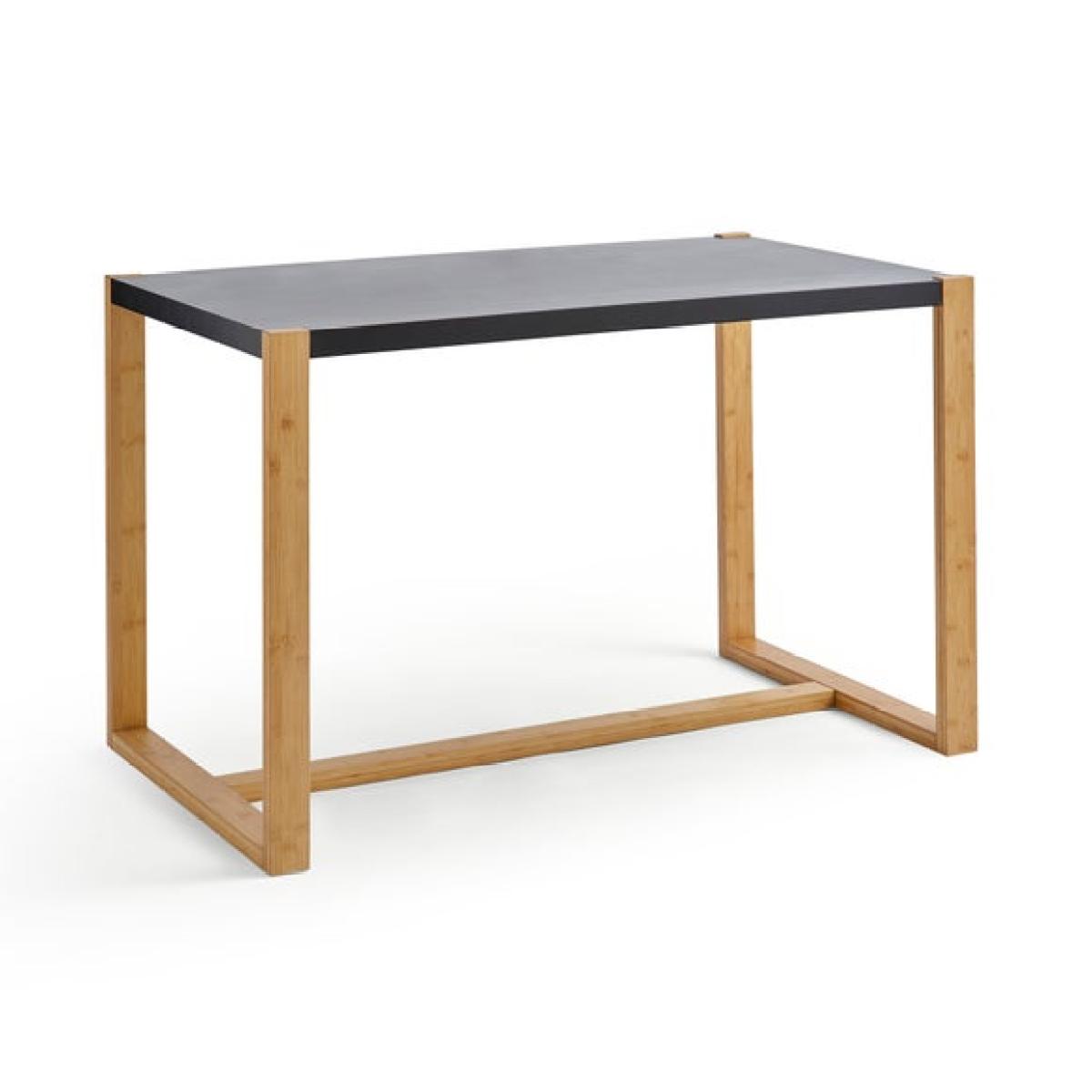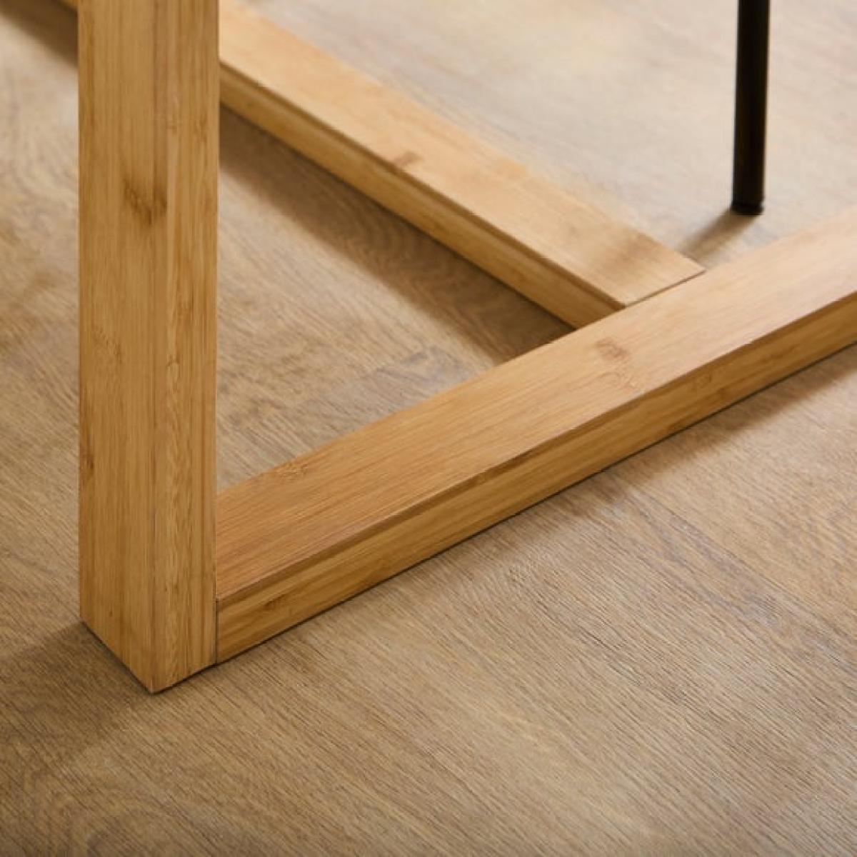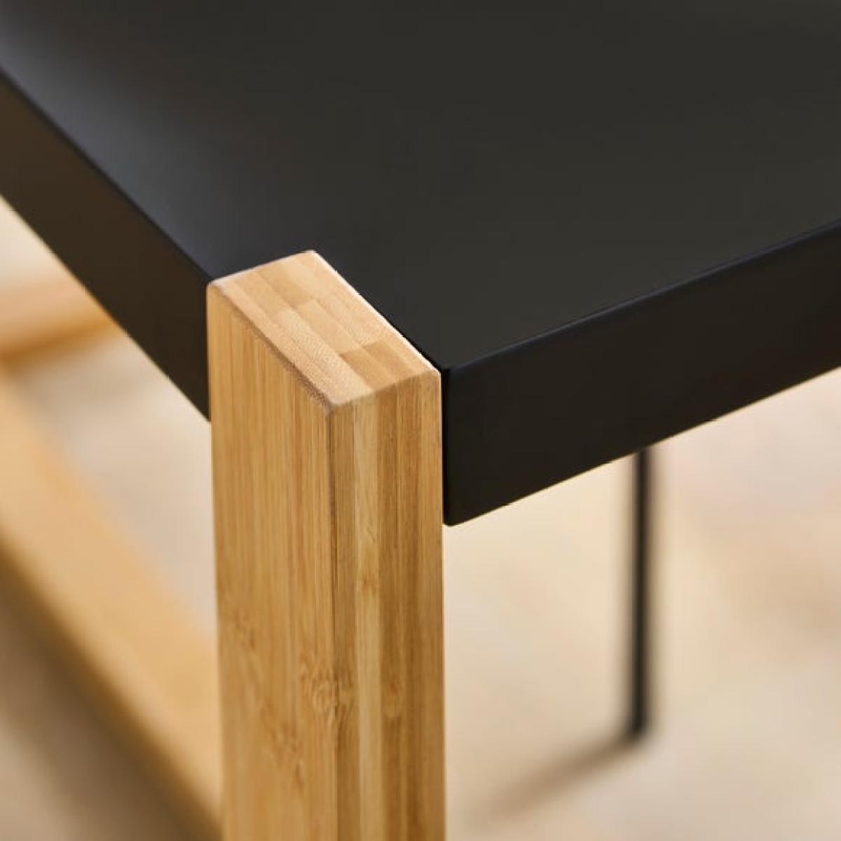 The Arnie rectangle four-seater is a versatile piece that works well in both modern and minimalist interiors thanks to its sleek black tabletop contrasted with natural wood accents. I love how it brings a contemporary edge while maintaining a warm, inviting feel. It’s ideal for compact dining spaces, providing enough room for family meals without overwhelming the room. For styling, consider adding colourful or textured placemats to soften the look, and pair it with Scandinavian-inspired chairs or even a bench to create visual interest. To keep the space feeling bright and open, keep accessories minimal and utilise the natural light from large windows, similar to the setting in the photo.
