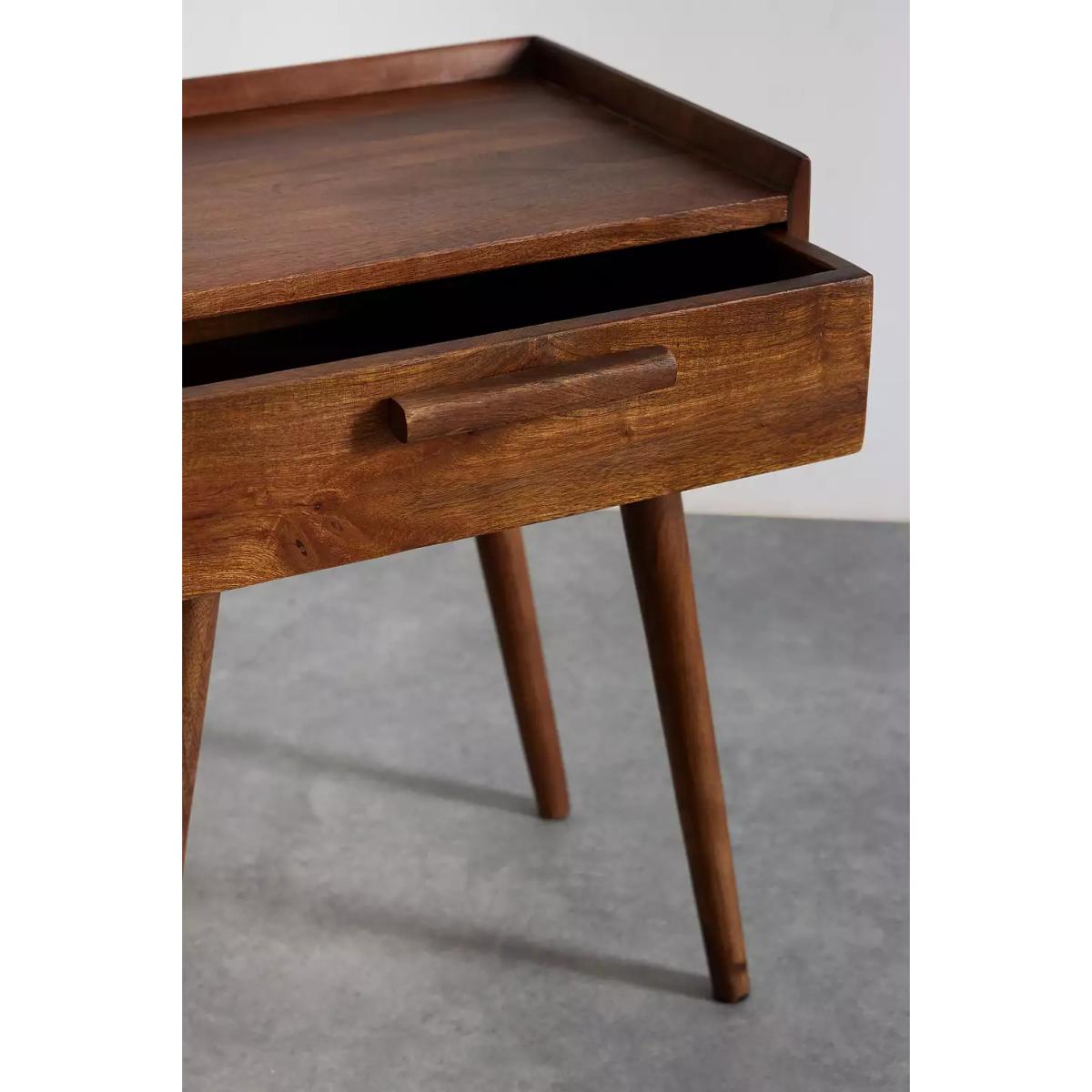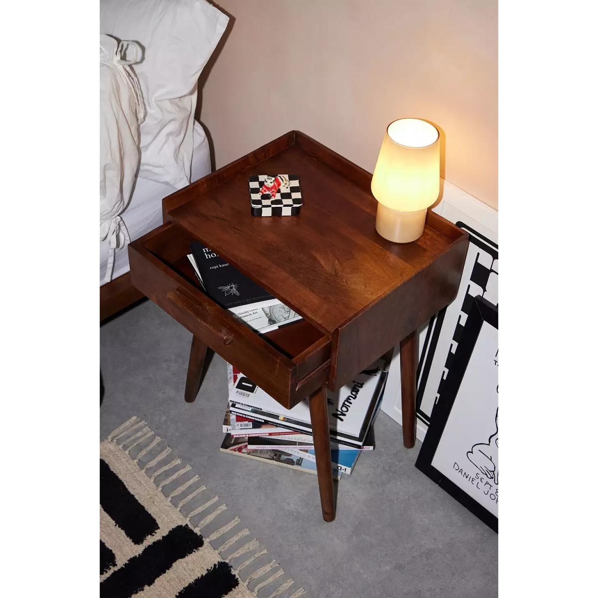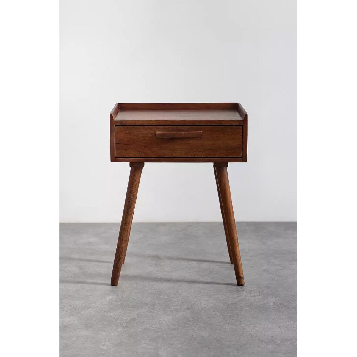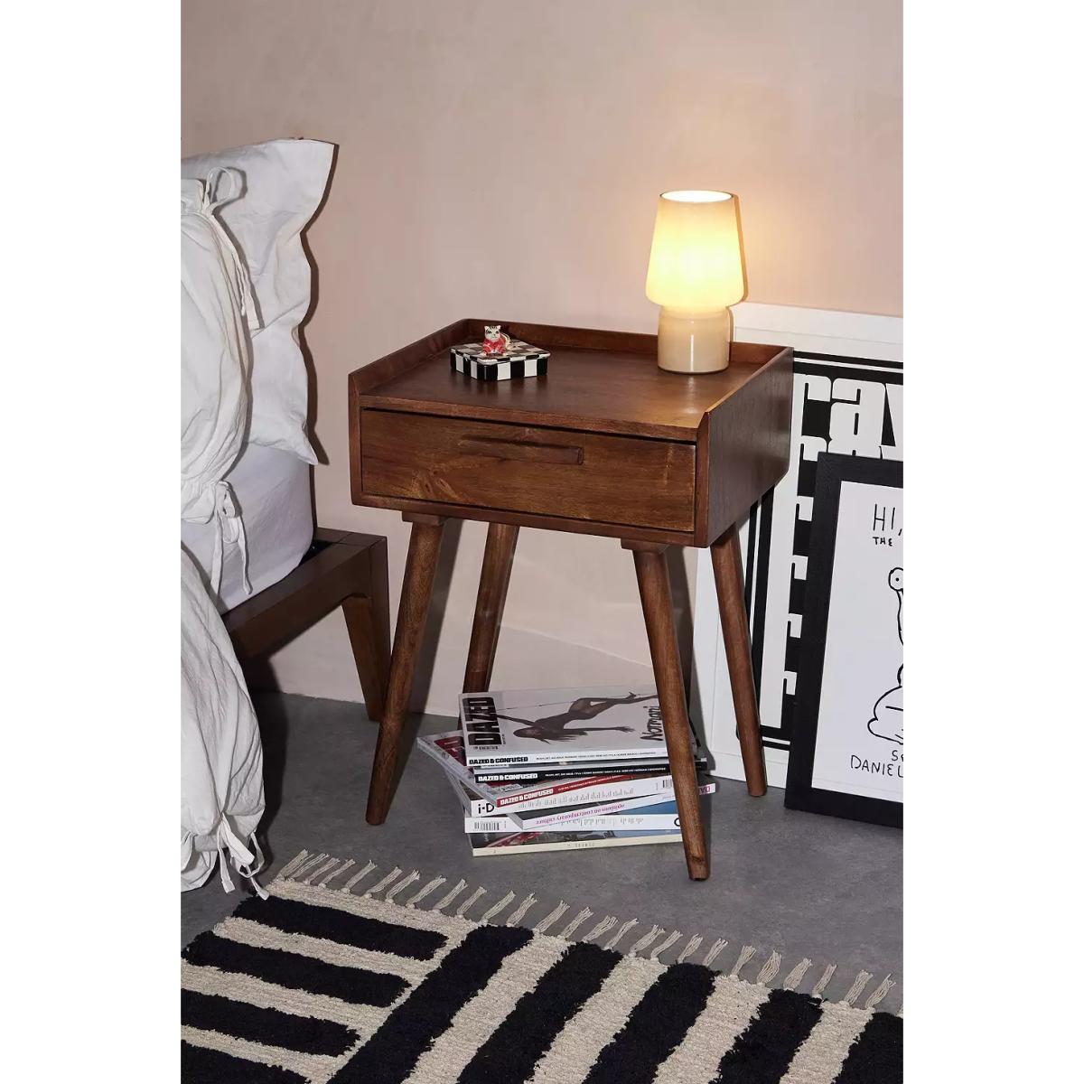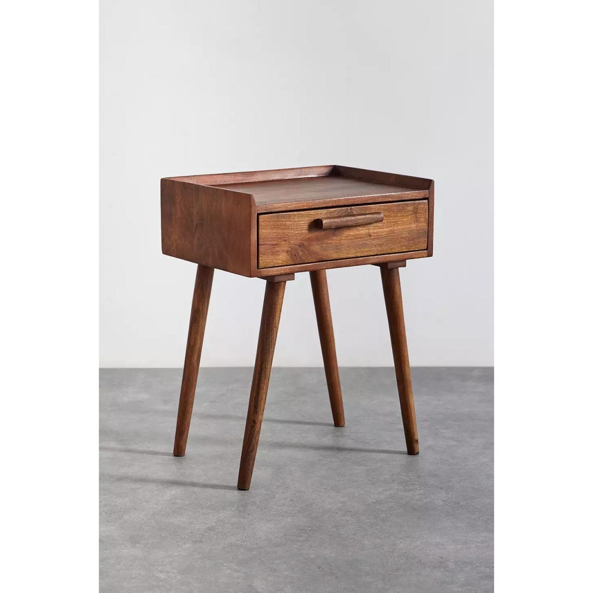 Vintage-inspired bedside table. Features a mango wood construction and a pull-out drawer for storing all your essentials. Finished with tapered legs. *Online return only. This item cannot be returned instore. Please note furniture items currently cannot be shipped to Northern Ireland or The Republic of Ireland. Delivery of large furniture items may take 1-2 weeks and are therefore not eligible for Next Day Delivery.* **Content + Care** \- 95% Mango Wood, 5% MDF \- Wipe clean **Size** \- Dimensions: L: 46cm x W: 36cm x H: 60cm \- Shipping dimensions: L: 55cm x W: 45cm x H: 37cm