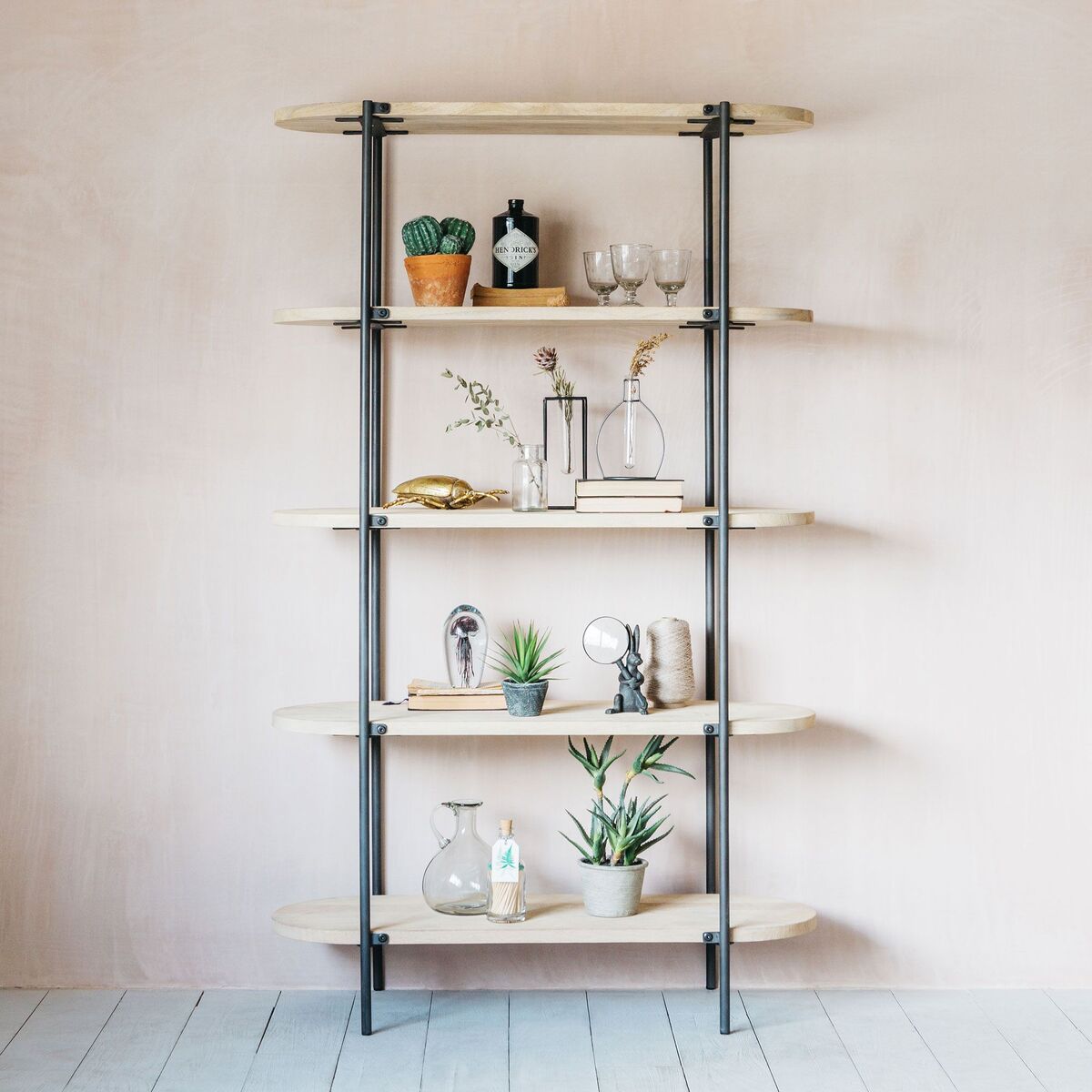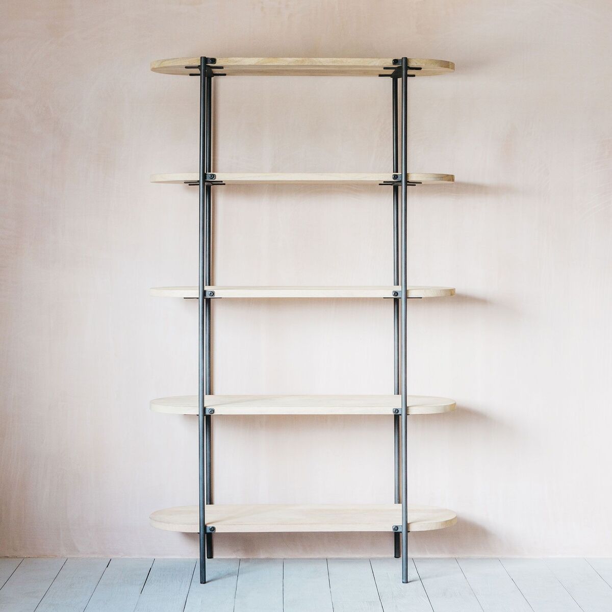 Featuring five oval shelves and an iron frame, display your greatest works of art with this sculptural midcentury-inspired shelving unit.