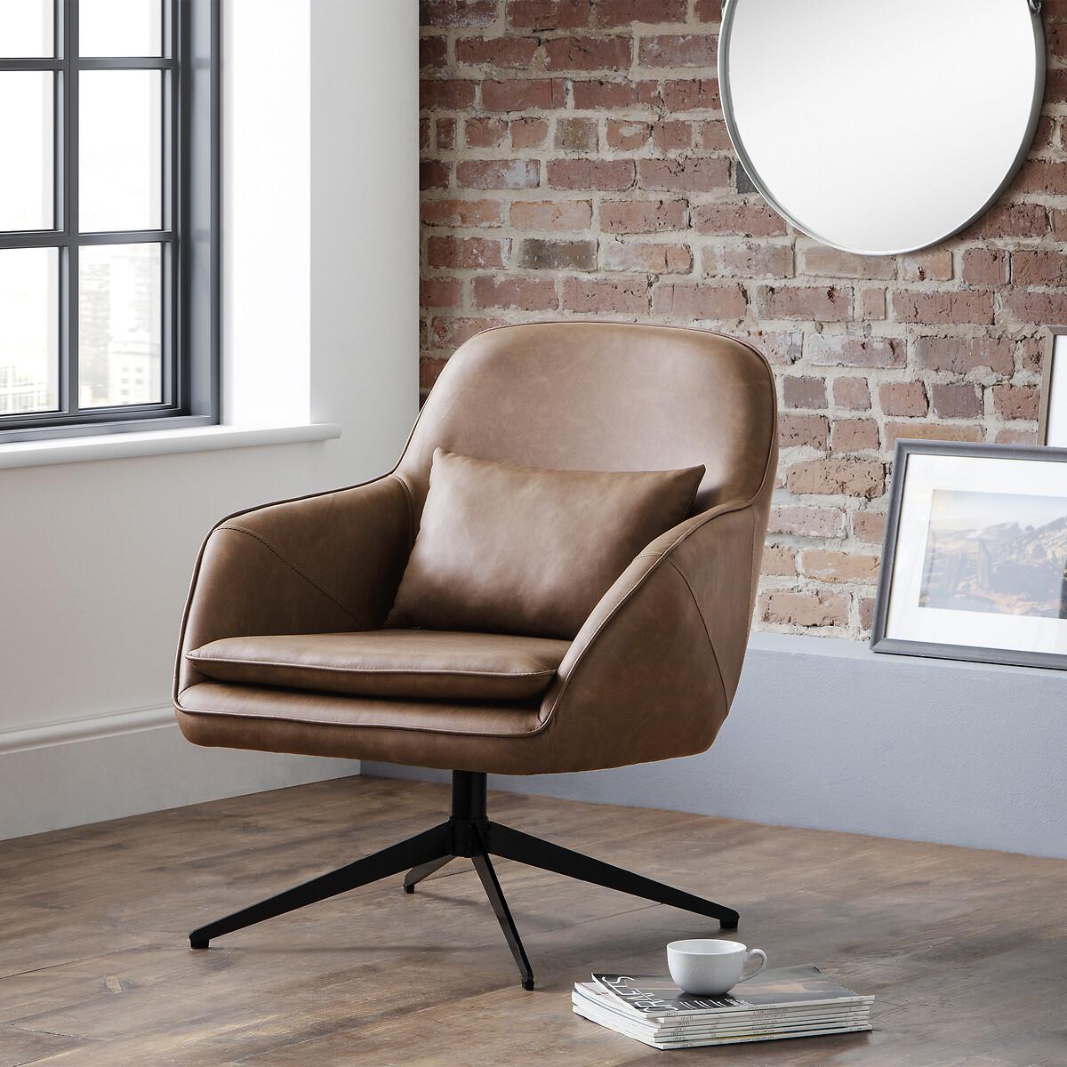 Create a cozy modern-industrial look with the bowery Swivel Armchair. Soft vintage style faux leather upholstery brings gorgeous warmth and texture. A sumptuous amount of padding paired with an additional back pillow makes the Arnott truly nap-worthy. Thanks to it's 360 degree swivel, it would make the perfect office chair, providing your boss doesn't mind if you accidentally fall asleep on the job! Product details • Soft buttery vintage style faux leather with stitch detail and piped edges • Curved armrests • 360 degree swivel functionality • Includes additional back pillow • Four pronged powder coated steel base • Assembly required • Fixings supplied • 12 month manufacturers warranty. Product Composition - 90% Faux Leather &10% Metal. Product Dimensions - 73 cm x73 cm x85 cm , Weight - 16 KGPackage Dimensions - 89 cm x 73 cm x 62 cm, Weight 22.5 kg. Please note: this product cannot be be delivered to all Offshore Islands Northern Ireland or Republic of Ireland. This product will be dispatched by one of our trusted suppliers. You’ll be contacted by their selected courier about your delivery.