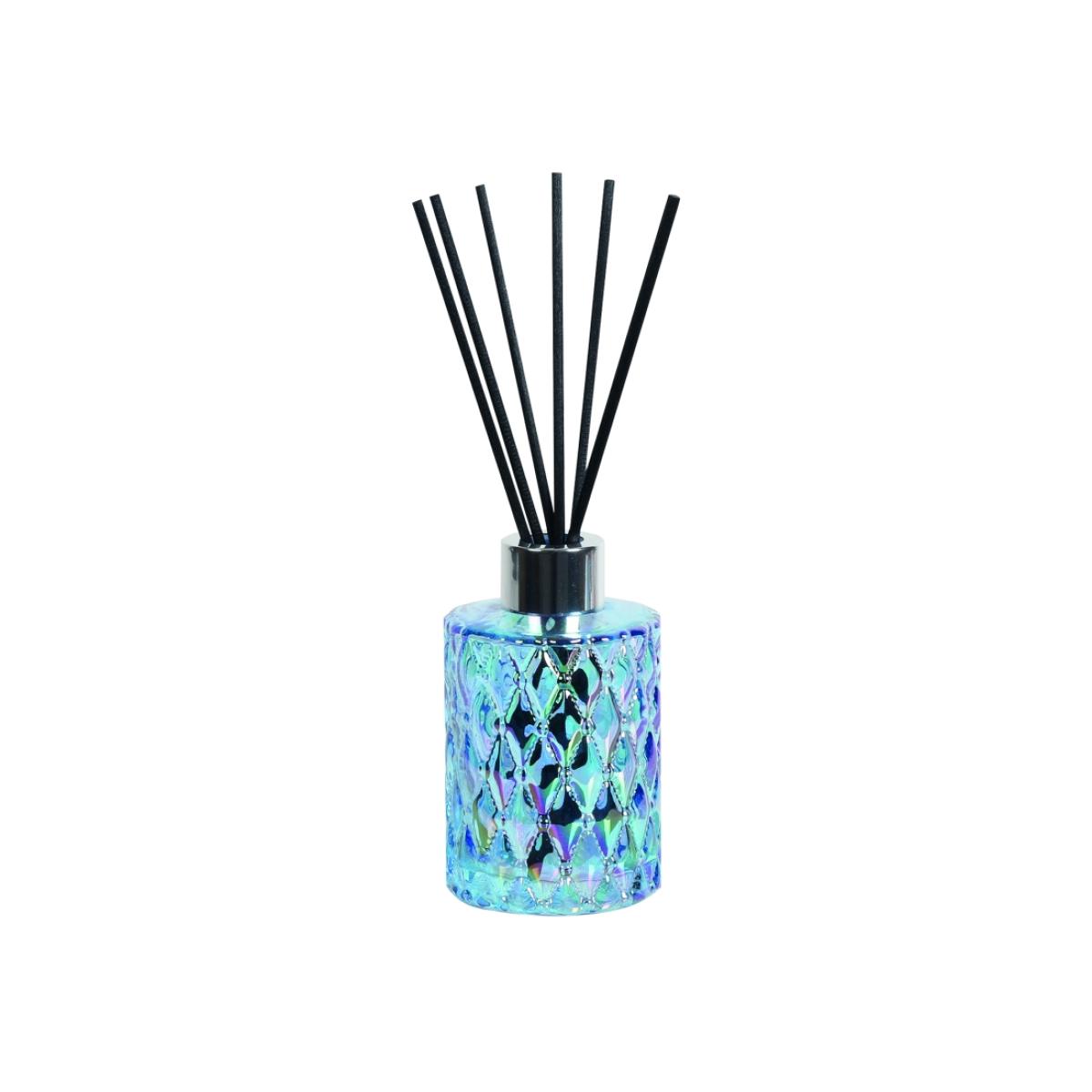 Bring colour and elegance to your home with the Blue Lustre Glass Reed Diffuser Bottle & 50 Fibre Reeds. This translucent, textured glass bottle features a lustre finish, creating a striking decorative accent while holding your favourite reed diffuser liquid. The diffuser includes 50 fibre reeds, ensuring a consistent and long-lasting fragrance release throughout your space. Features: Translucent blue glass with a lustre effect for a stylish finish Compact size: 10 cm Supplied with 50 fibre reeds for optimal scent diffusion Ideal for small to medium-sized rooms Reusable and easy to refill Please note: Diffuser liquid is sold separately – pair with Woodbridge Diffuser Refills for a complete fragrance experience. A chic and functional home accessory, the Blue Lustre Reed Diffuser Bottle adds both elegance and a delightful aroma to any room. Please note All screens vary in colour reproduction and whilst every effort has been made to display the colour as accurately as possible it is for guidance only.