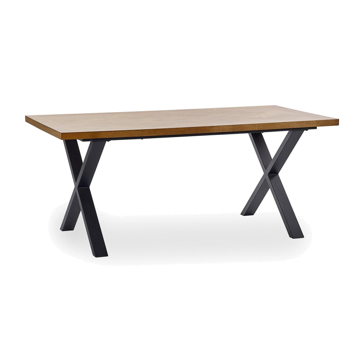 The Aron Dining Table blends craftsmanship with contemporary style. Its wooden top showcases an intricate herringbone pattern, adding texture and visual interest to your dining space. The rich wood grain, paired with the detailed pattern, creates a timeless look that complements both modern and traditional interiors. Supported by bold, crossed black metal legs, the piece offers robust durability with an industrial edge. Whether hosting gatherings or enjoying everyday meals, it serves as the perfect centerpiece. Minimal assembly is required, ensuring a seamless setup for your home.