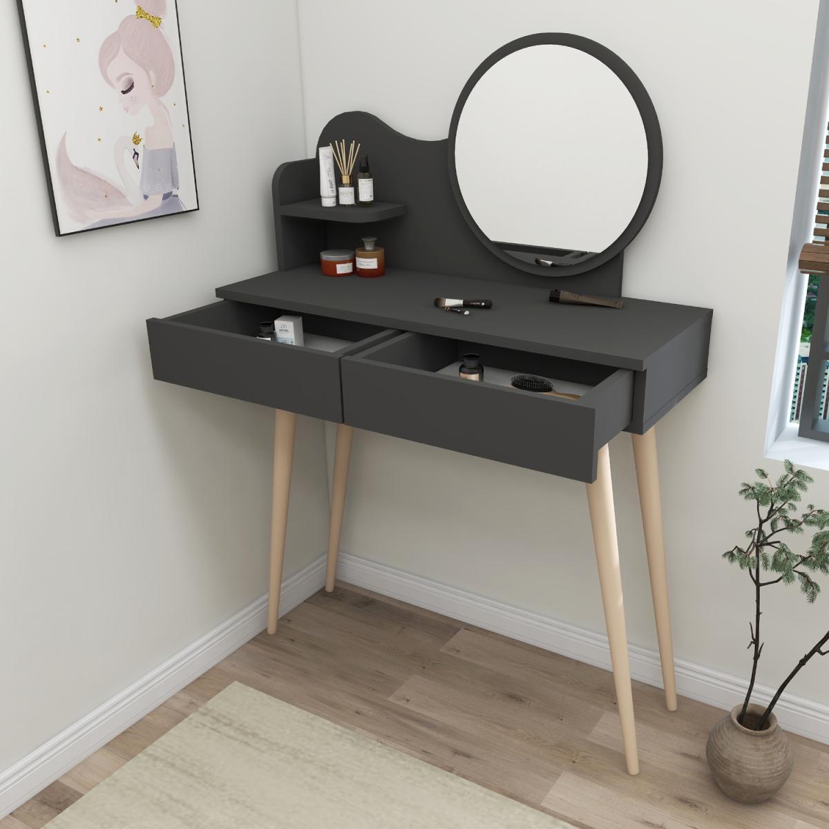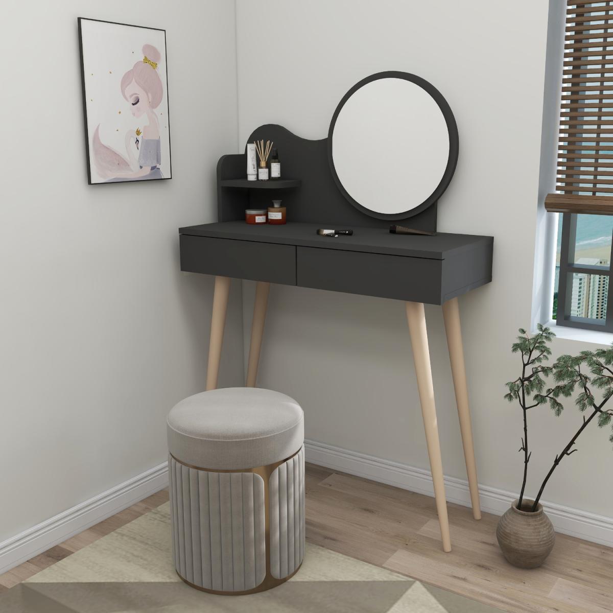 MATERIAL The makeup table is made of an 18 mm thick quality melamine-coated particleboard. The manufactured wood surface is water-resistant to some extent and the edges are banded with PVC edge banding tape. First-class assemblyinstallation hardware and accessories are used. Our products are produced from certified raw materials that do not contain carcinogenic substances and comply with European Union health norms. CLEANING You can clean your furniture with a dry cloth. Avoid prolonged contact of your product with moisture and water. ASSEMBLY The product will be delivered to the customer in the original package as disassembled. It is designed to be assembled by the customer using a power drill and screwdriver. Assembly instructions and installation hardware are included in the box. Product parts are numbered with stickers per the assembly guide for fast and error-free installation.