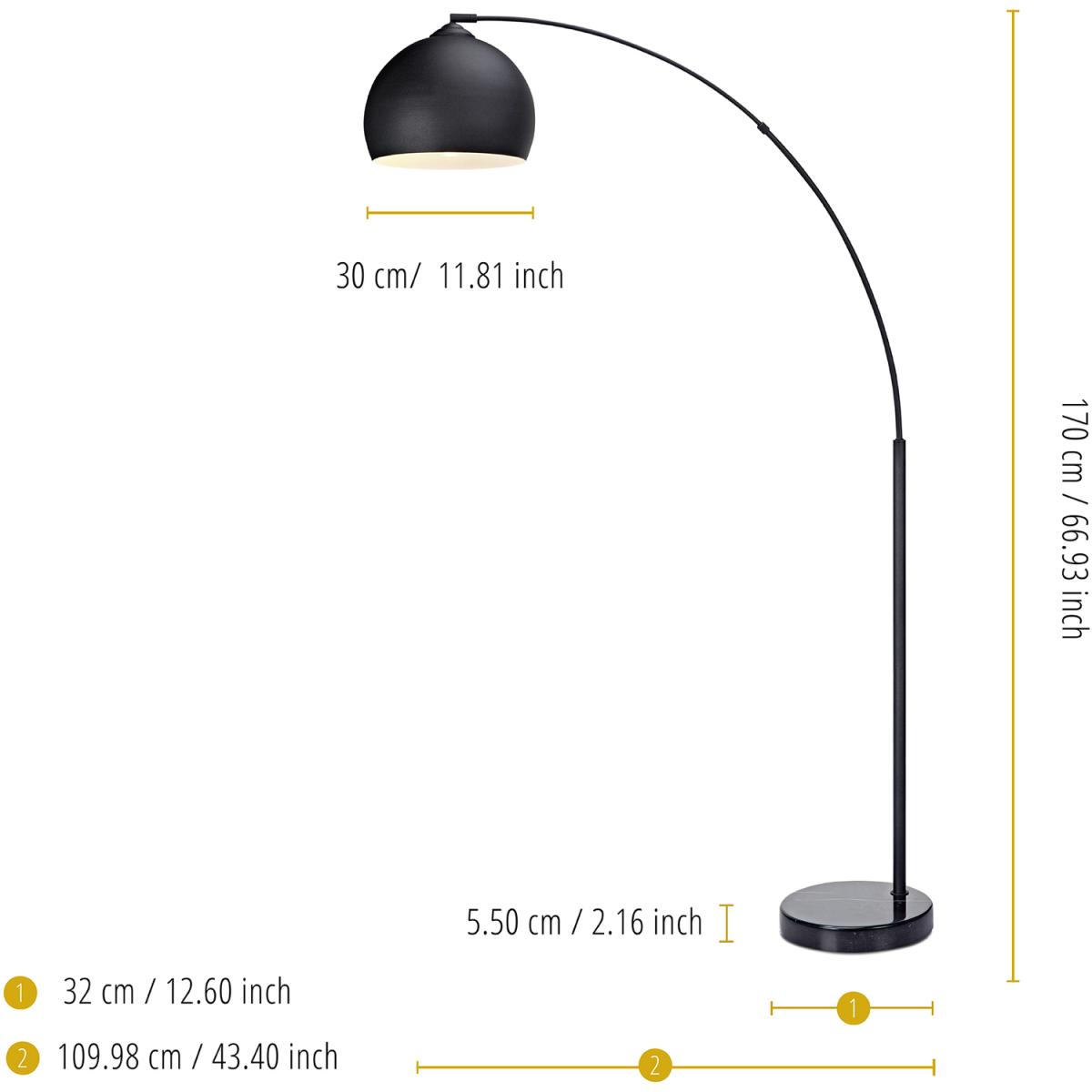 The stylish and versatile Arquer arc floor lamp features a faux Black marble base that stabilises the slender arced stem and bold bell shade for a Mid-Century Modern silhouette. The fade-resistant, bold Black metallic bell shade features a White interior to amplify the light and can provide ambient, task, or accent lighting in living rooms, dining rooms, bedrooms, or home offices. It is also flexible, with a 2m cord and on/off foot switch, so proximity to an outlet isn't an issue.
