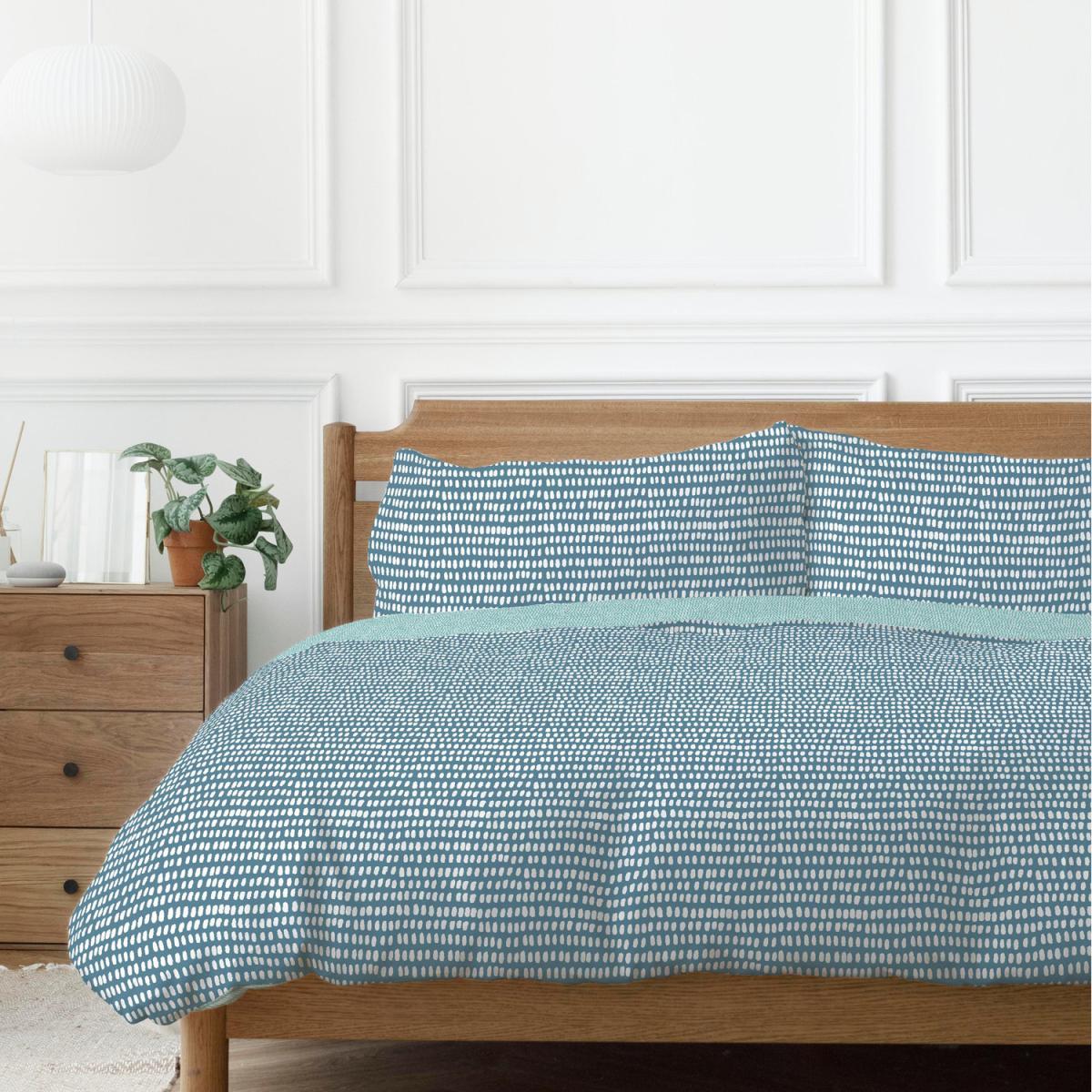 This simple mark-making design is bang-on-trend with its fresh colour palette and fully reversible design. Its reversible design has a deep ocean blue on one side and a fresh aqua on the reverse. Produced using easy-care polycotton blend for easy laundering. Machine washable. Single sets include 1 pillowcase Double and king sets include 2 pillowcases 52 Polyester,48 Cotton