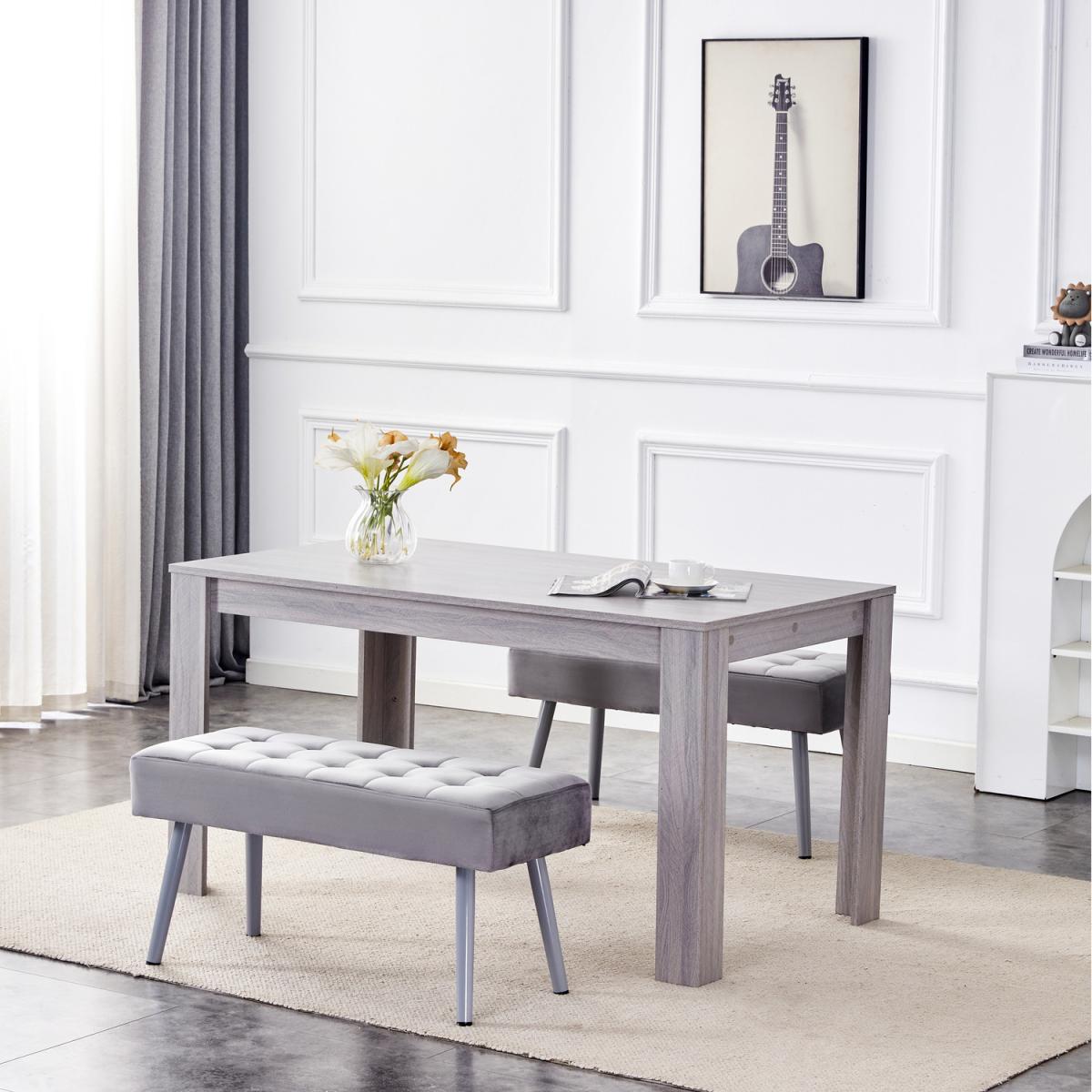 The Kosy Koala Arrow Effect Dining Table set comes with 2 Benches. The dinner table is crafted with premium MDF, Arrow effect with a melamine laminated Grey/Charcoal colour finish. Clear instructions are included for easy assembly. Grey Velvet dining bench with a soft grey velvet padded seat with stylish stitching and tufting. Legs prevent damage with the adjustable foot protection provided. Bench size: 90cm (L) X 36cm (W) X 47cm (H). Convenient format with instructions for easy assembly. *Chairs not included.