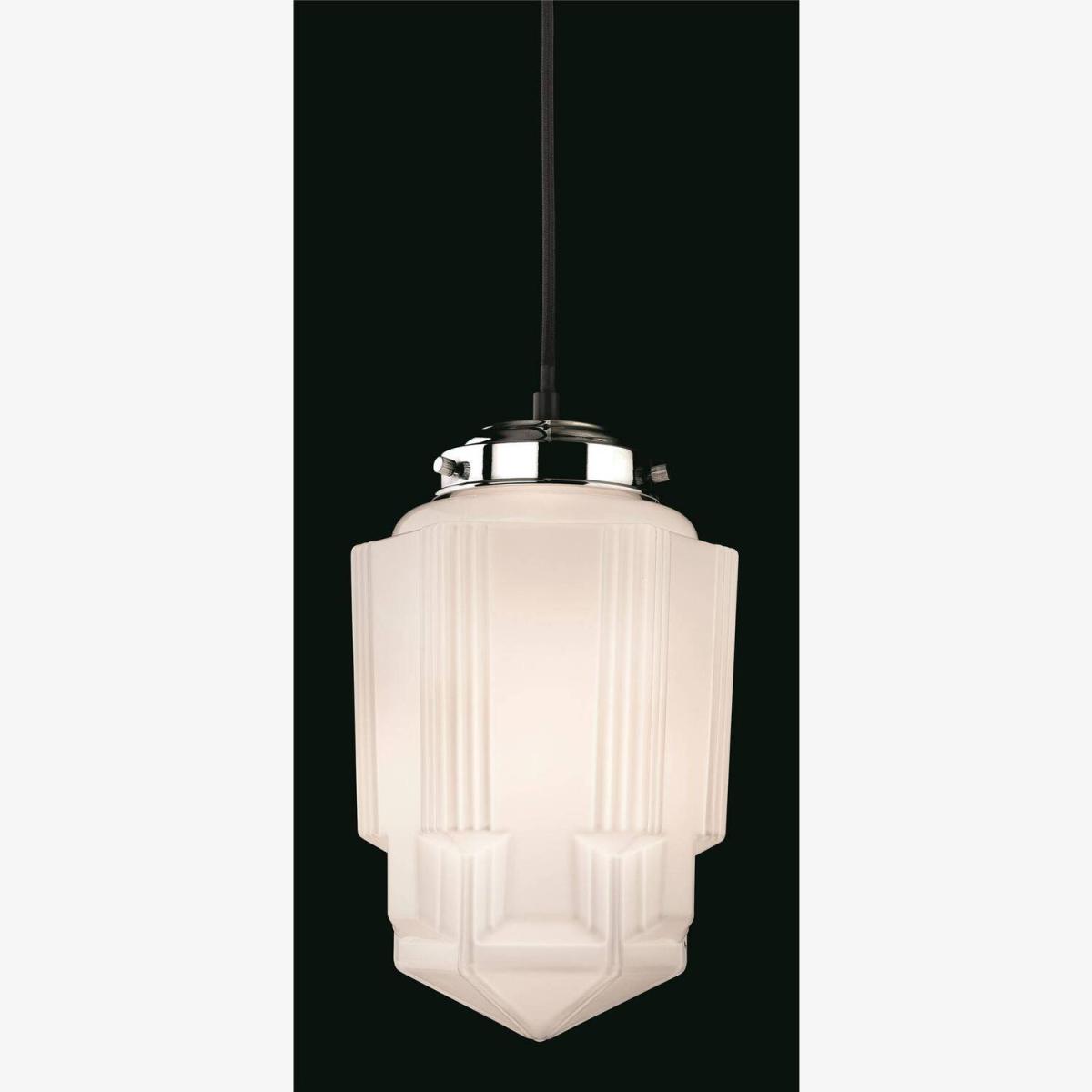 Simply crafted in opal white glass the Art 1-Light Ceiling Pendant Fixture has shining chrome trim, a conical shape, and distinct art deco flair. Perfect for lighting up a dining room this fixture is wonderfully elegant. It emits soft yet bright light thanks to the opal white glass diffuser.
