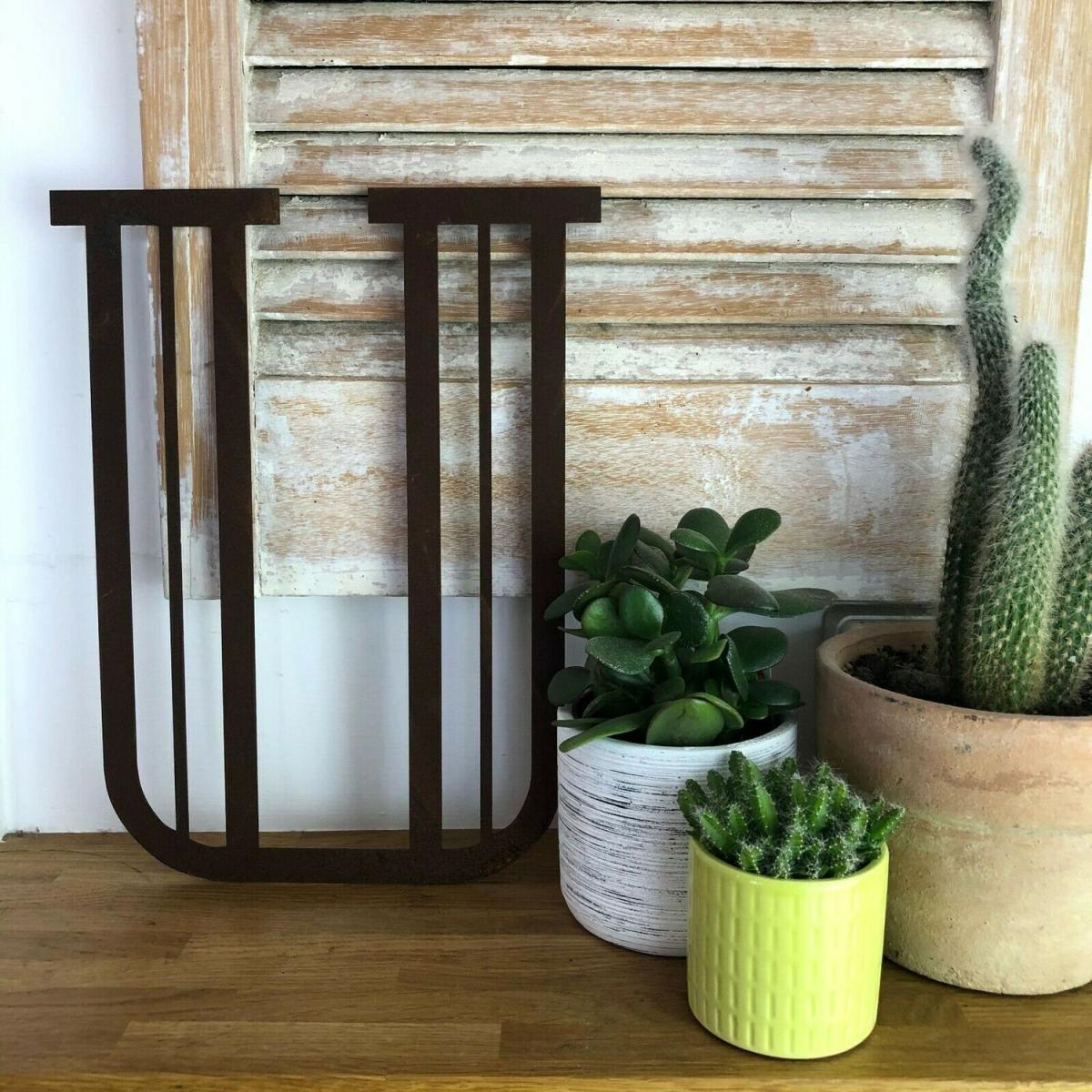 I love this rusty metal U letter sculpture for bringing an industrial edge to various interiors. It’s particularly effective in modern, urban, or eclectic spaces where raw textures and statement pieces are appreciated. Its rusted finish adds a weathered, vintage vibe that can soften stark minimalism or complement reclaimed materials. For styling tips, consider pairing it with greenery or other metallic accents to enhance its earthy tones. It works well placed on a console table, bookshelf, or as a standalone feature in an open-plan area. Keep the surrounding decor simple, so the letter stands out as a focal point-it's an effortless way to introduce character and texture into a room.