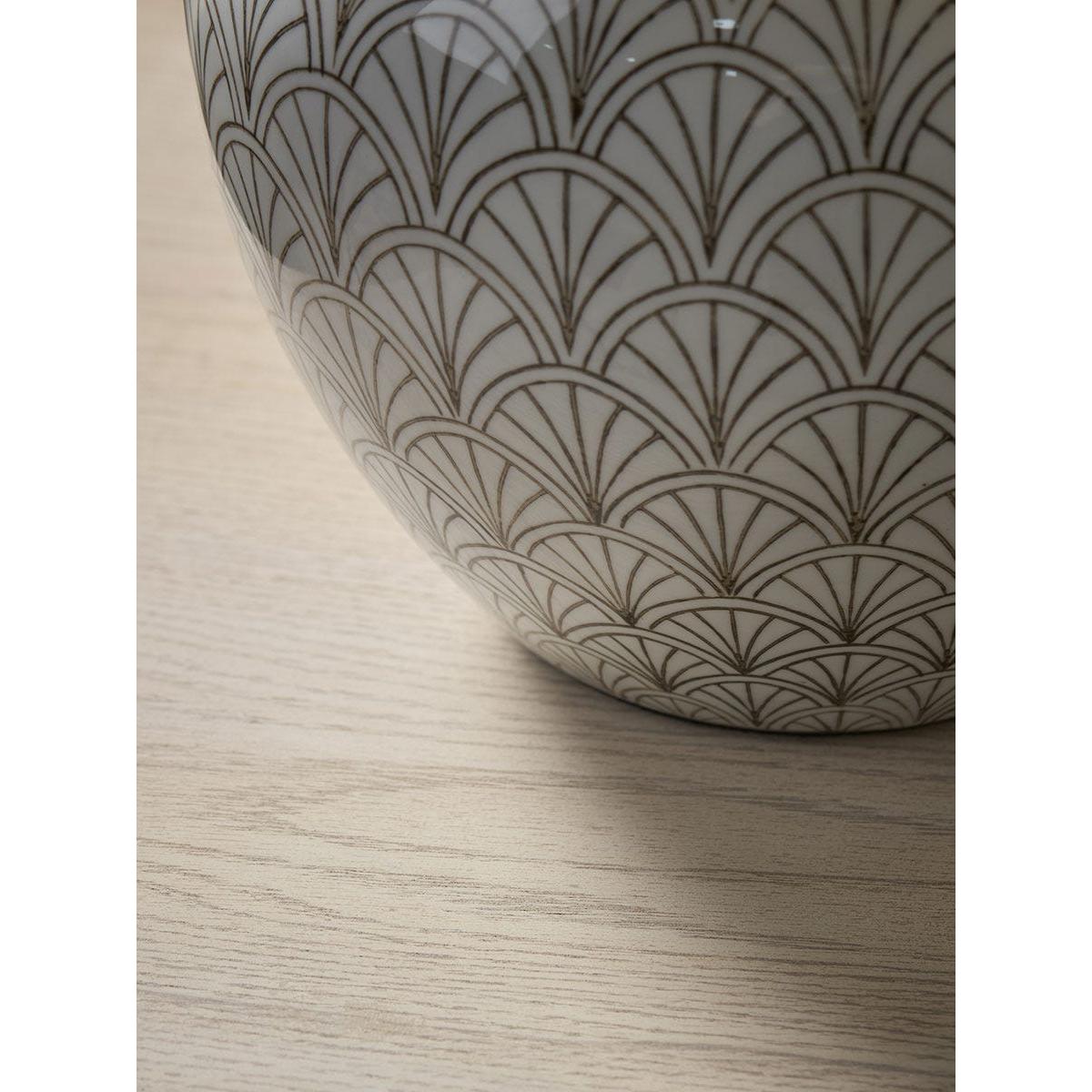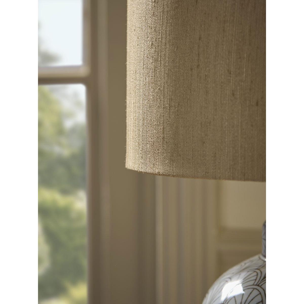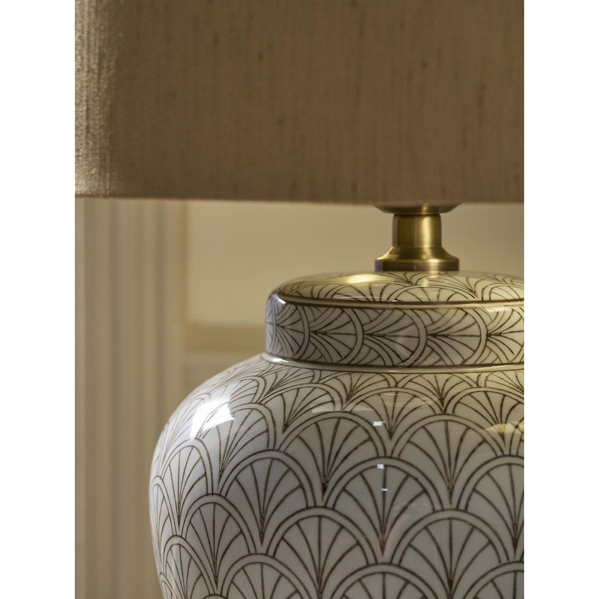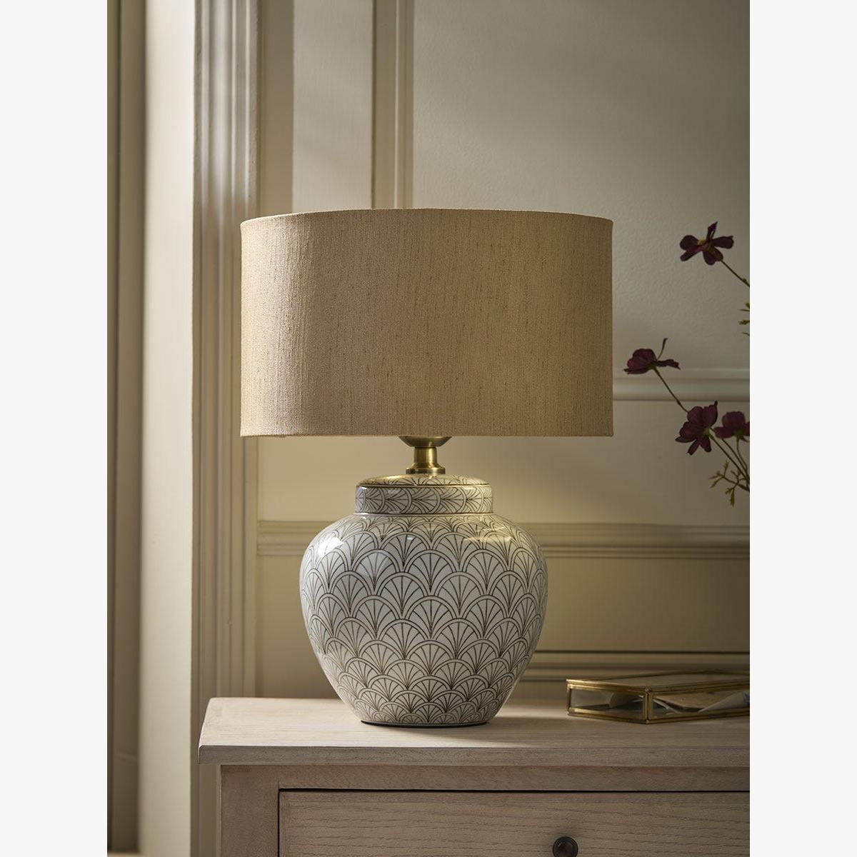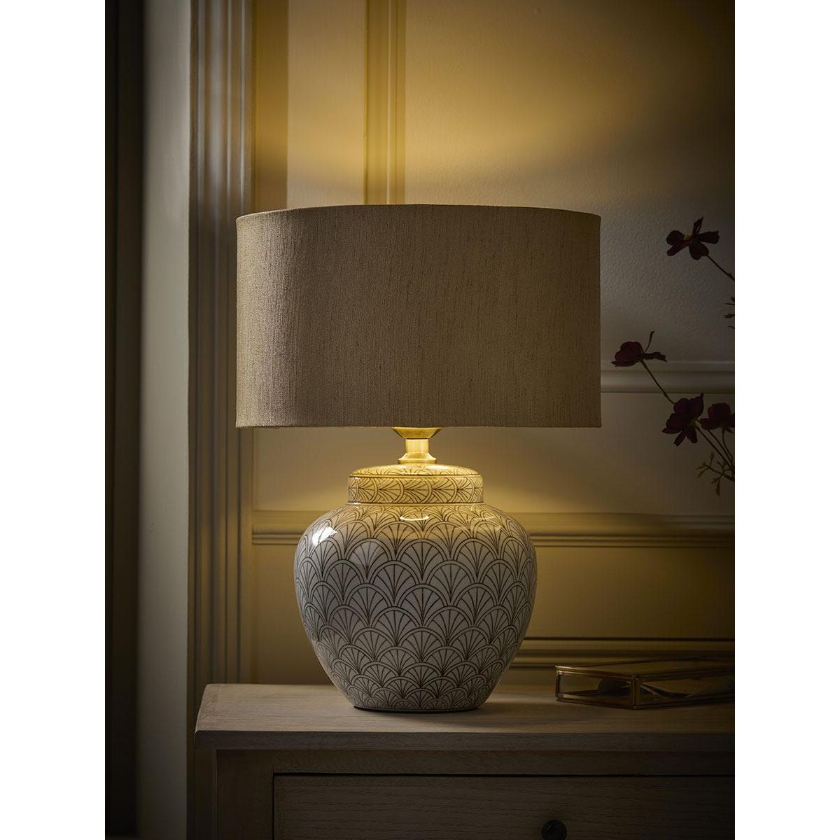 The classic ginger jar shape of this timeless table lamp is decorated with a distinctive Art Deco fan design in warm neutrals.  Ideal for elevating your console table or sideboard with some new season style, the base is topped with a fabric shade which has the appearance of slub silk in a golden straw shade. The golden lining to the drum shade ensures that the light it gives is warm and comforting.