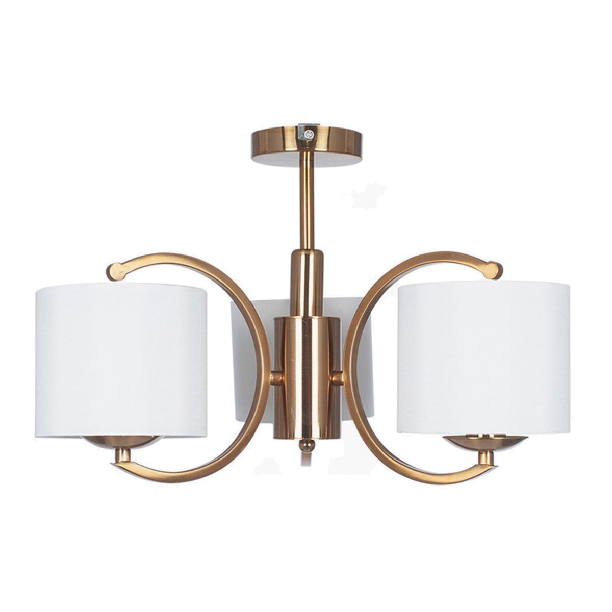 Three cream, faux silk shades sit atop each satin brass metal curved arm in this modern chandelier. Minimal, yet bold, this striking piece is an attractive centrepiece in any space. Also available in a 5 arm pendant and a wall light.