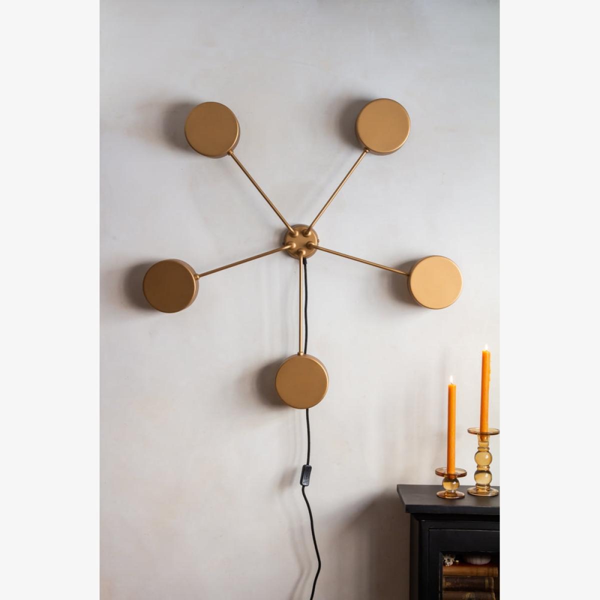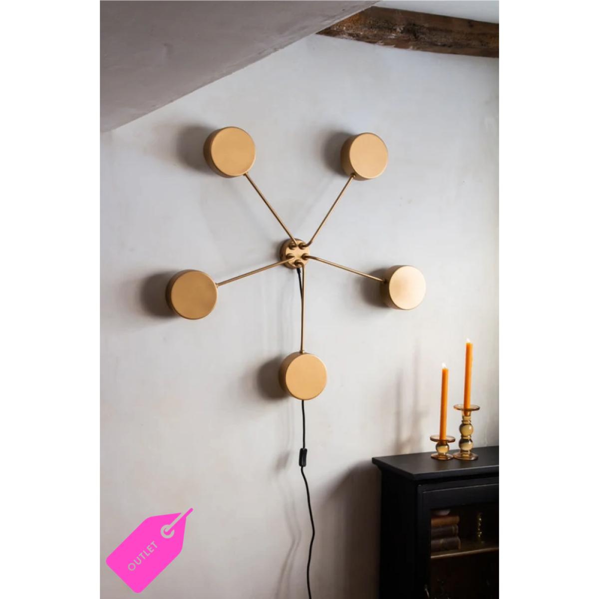 About The Discontinued Art Deco Statement Wall Light A large striking wall feature like no other, the discontinued Art Deco Wall Light brings bold retro flair to any corner of your home. With its signature gold finish and five circular sconces, this statement piece exudes vintage glamour and antique charm, casting a soft, atmospheric glow that elevates any space. The Art Deco Statement Wall Light measures 100cm in height, with a width of 100cm and a depth of 8cm. Made from brushed metal.