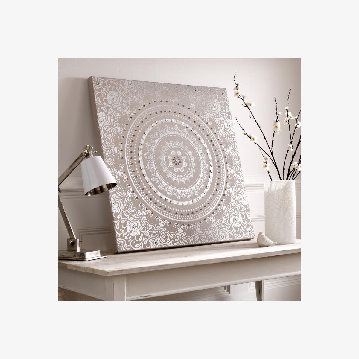 Bring elegance into your home with this beautiful cocoon fabric canvas. The beautiful muted colour palette embellished with high shine silver metallic catches the light beautifully. This unique canvas is delicately finished off with button and bead embellishment for the perfect finishing touch.