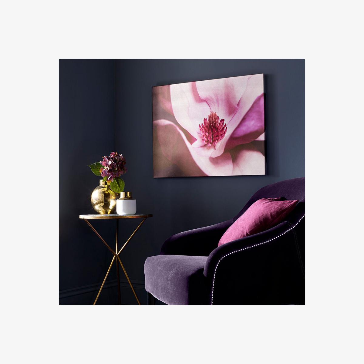 This piece is a great choice for adding a pop of colour and sophistication to a variety of interiors. I love the metallic plum petals print for its bold yet elegant aesthetic; it works especially well in modern or contemporary spaces with deep, rich colour palettes. It’s versatile enough to look striking in living rooms or bedrooms, especially when paired with neutral or darker walls to let the artwork stand out. For styling tips, consider balancing the purple tones with accessories like soft throws or cushions in complementary colours such as blush, grey or metallic accents. Hanging it at eye level above seating areas or beds creates a focal point, while its printed canvas format makes it easy to incorporate without overwhelming the space.