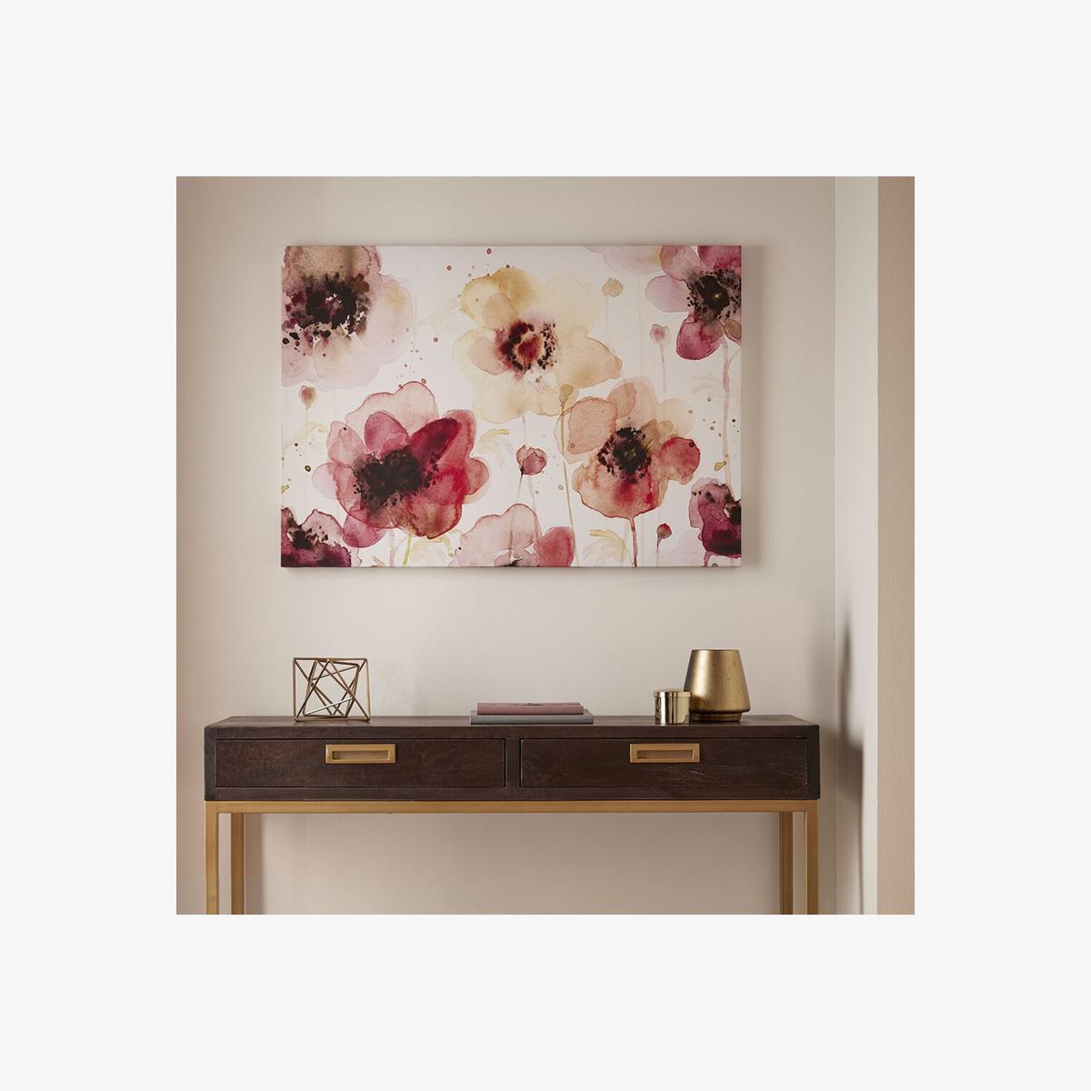 Painterly blossoms is perfect for bringing a pop of colour to your home. This fun, expressive hand painted printed canvas depicts abstract , watercolour style poppies. In stunning palette, this on trend design will create a beautiful focal point in any room.