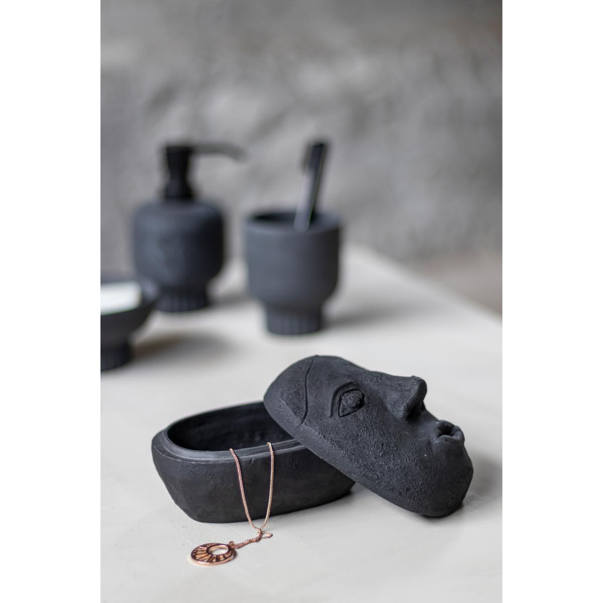 Art piece face jar 9x12 cm from Mette Ditmer is made of stone resin and designed in an oval shape with a lid that looks like a face. The jar has a rough finish that looks like ceramic and is an interesting eye-catching piece in any room The jar looks lovely on its own or can be used to store small items such as jewellery or hair accessories.