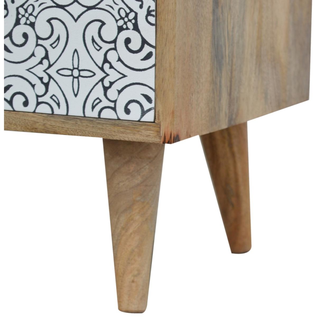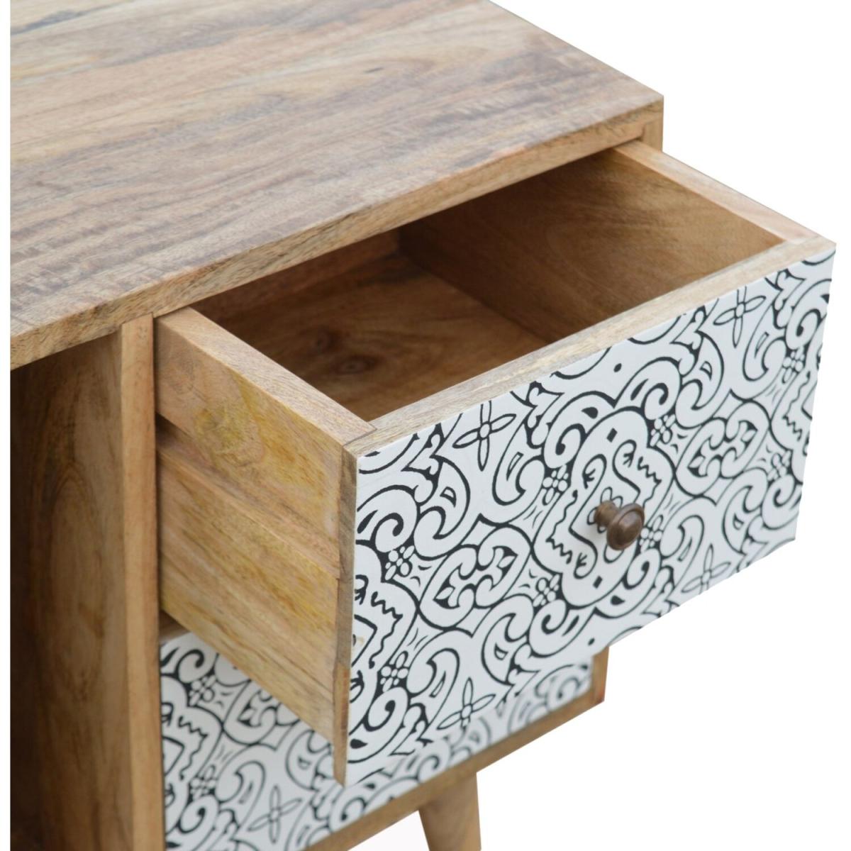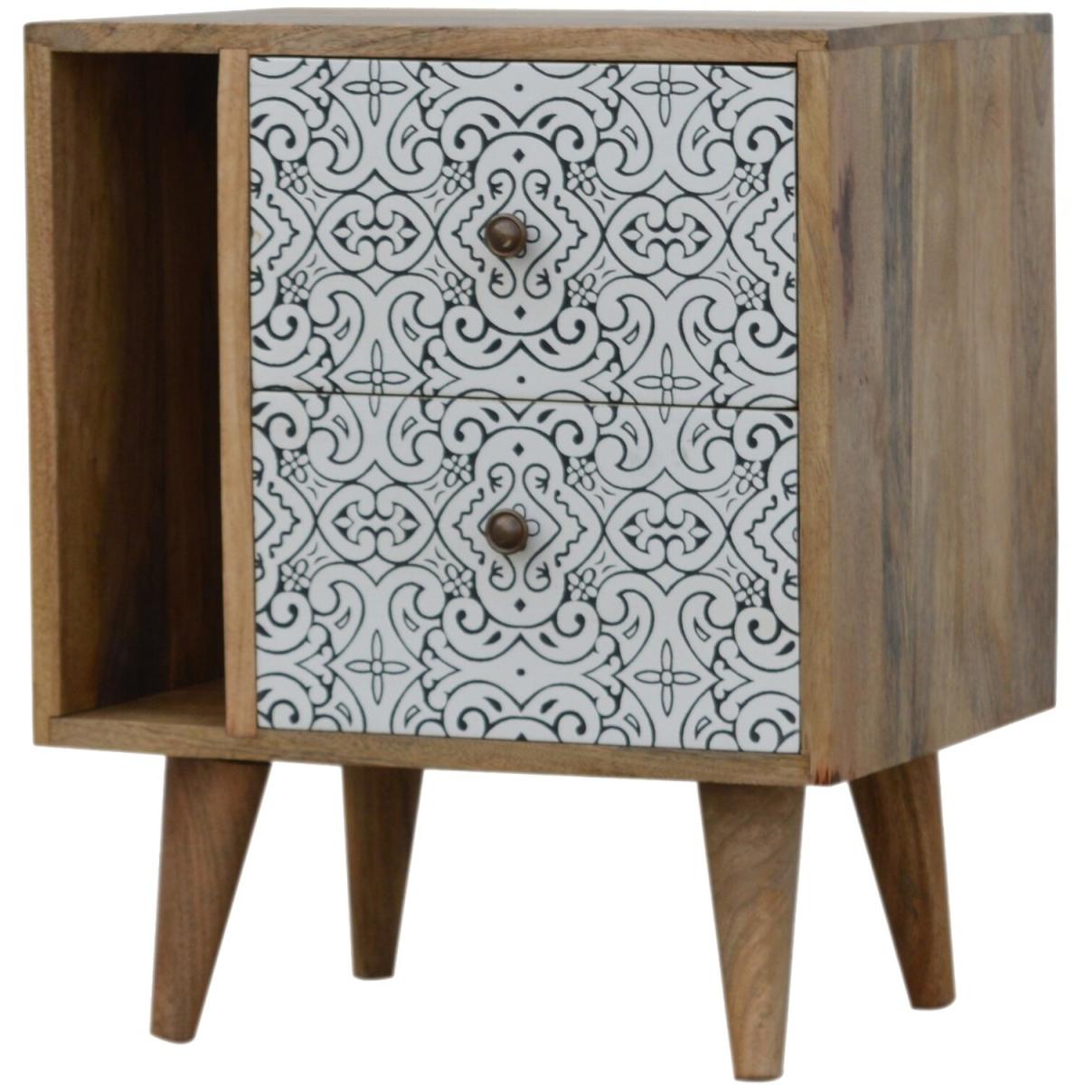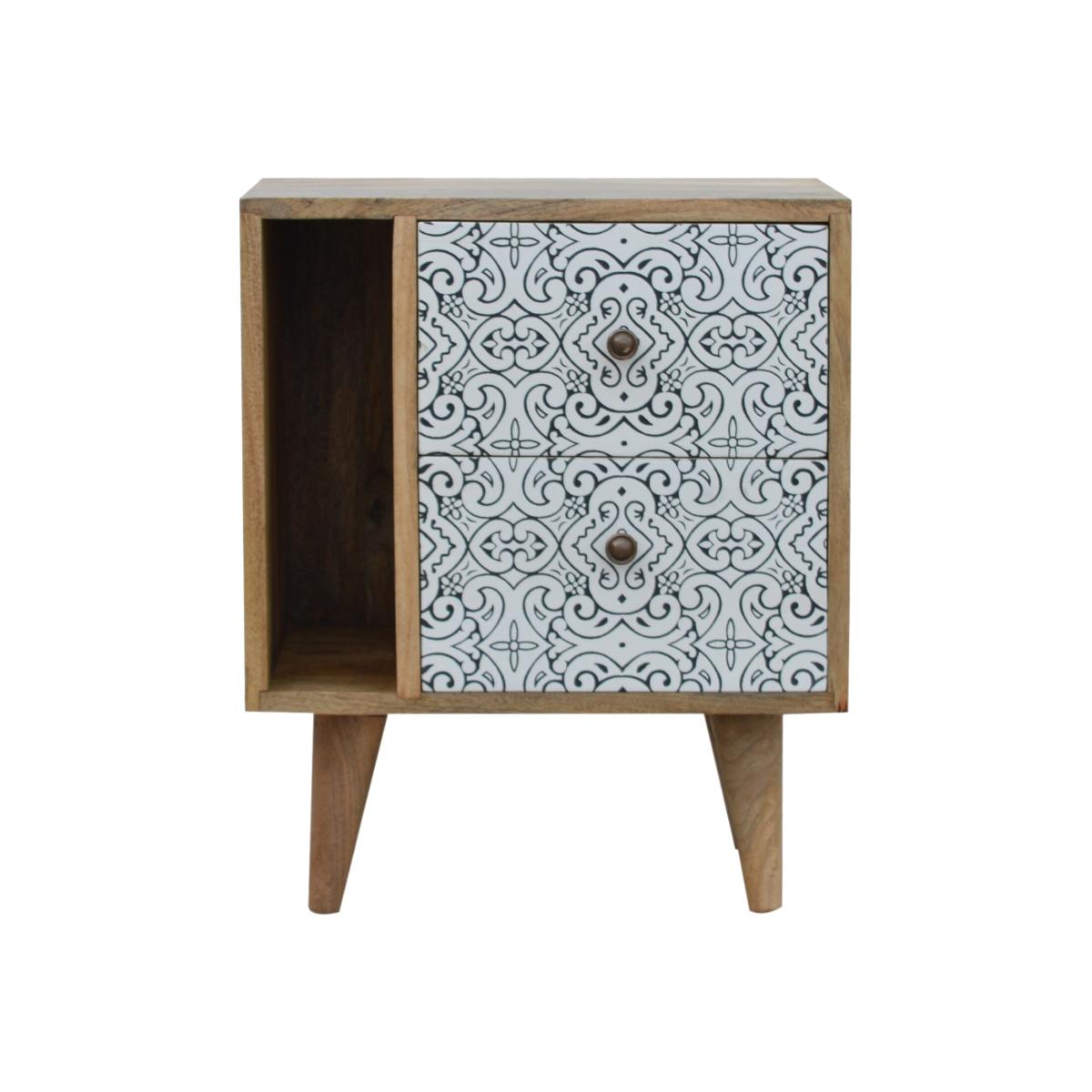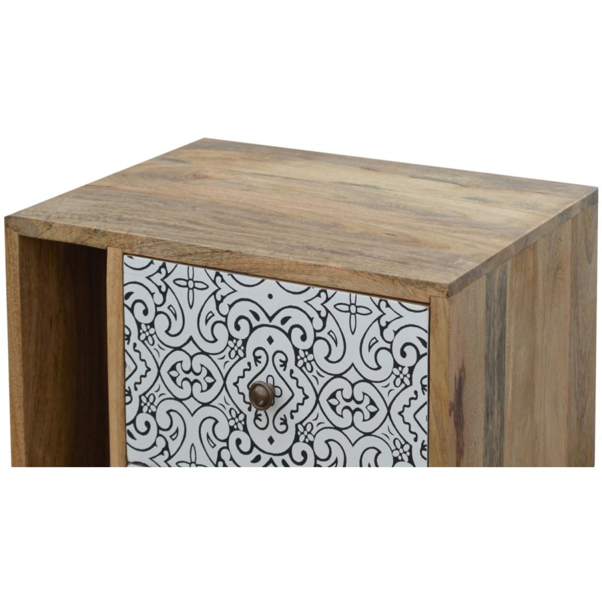 A practical and stylish addition to the home, this Artea Porcelain patterned mini cabinet can be used anywhere in the home from the hallway, bedroom or living room. Constructed from 100% solid mango wood in an oak-ish finish and 4 Nordic style legs, this piece offers storage space with 2 open slots and 2 drawers that each have a shiny brass knob.