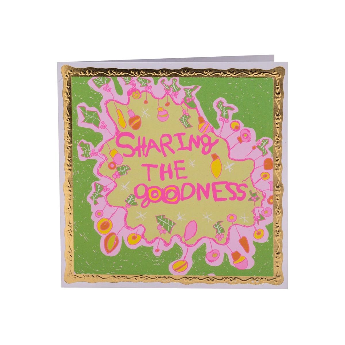 This joyful Christmas card design by ARTHOUSE Unlimited artist Elanor Sinden is packed with festive cheer. Blank inside, Sharing The Goodness is a bright and colourful charity Christmas card ready for joy & celebration.