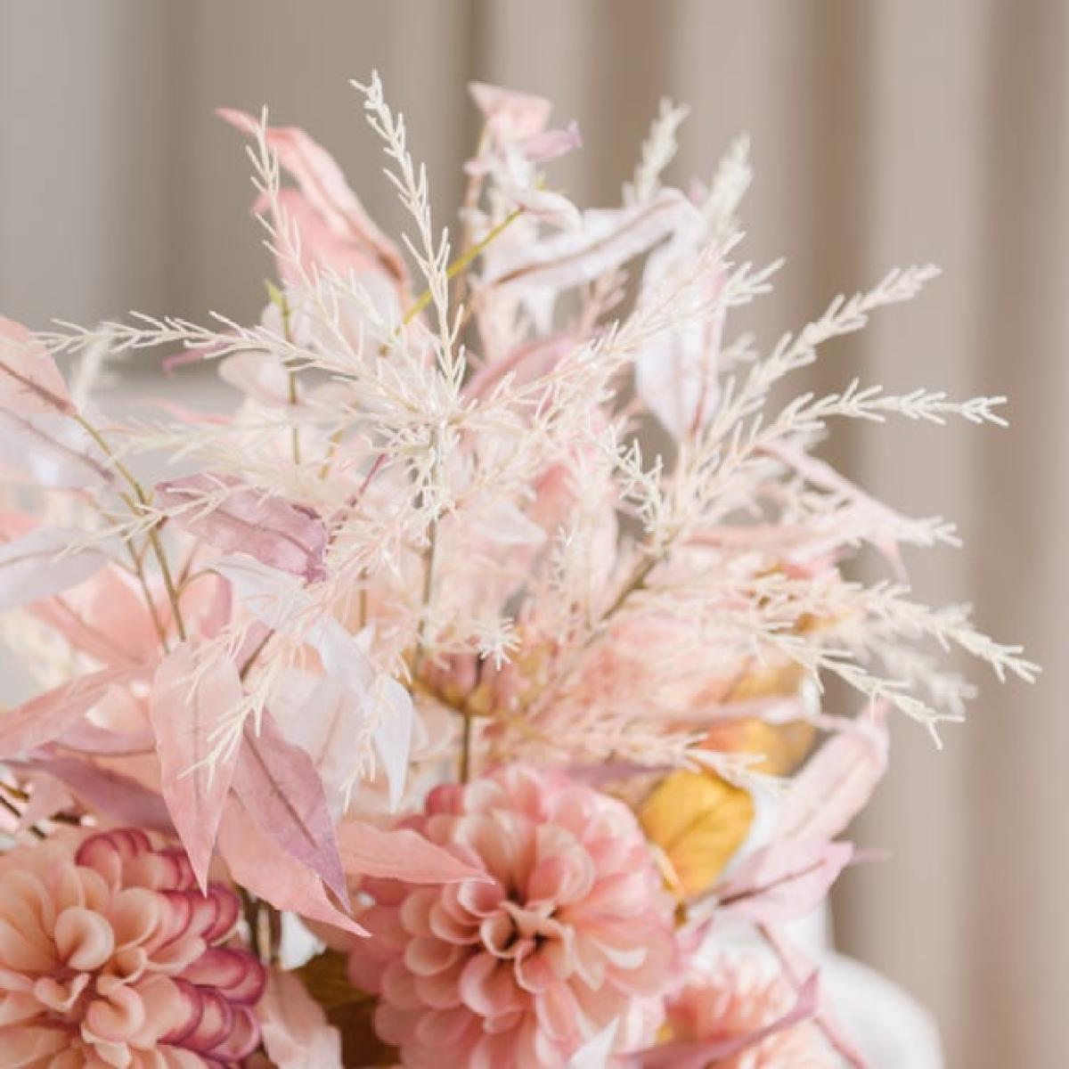 * Cream dahlias, eucalyptus & grasses * Soft pink accents for a romantic blush * Hand‑tied and ready to display * Realistic, long‑lasting design Create a timeless look with this elegant hand‑tied bouquet, blending classic pink dahlias with airy grasses and fresh eucalyptus. Soft tones add a gentle blush for a romantic finish, perfect for brightening any dull corner of your home. Pre‑arranged for effortless styling, it slips straight into your favourite vase (not included) for an instant update. Made for lasting beauty, it stays fresh and full without any upkeep.
