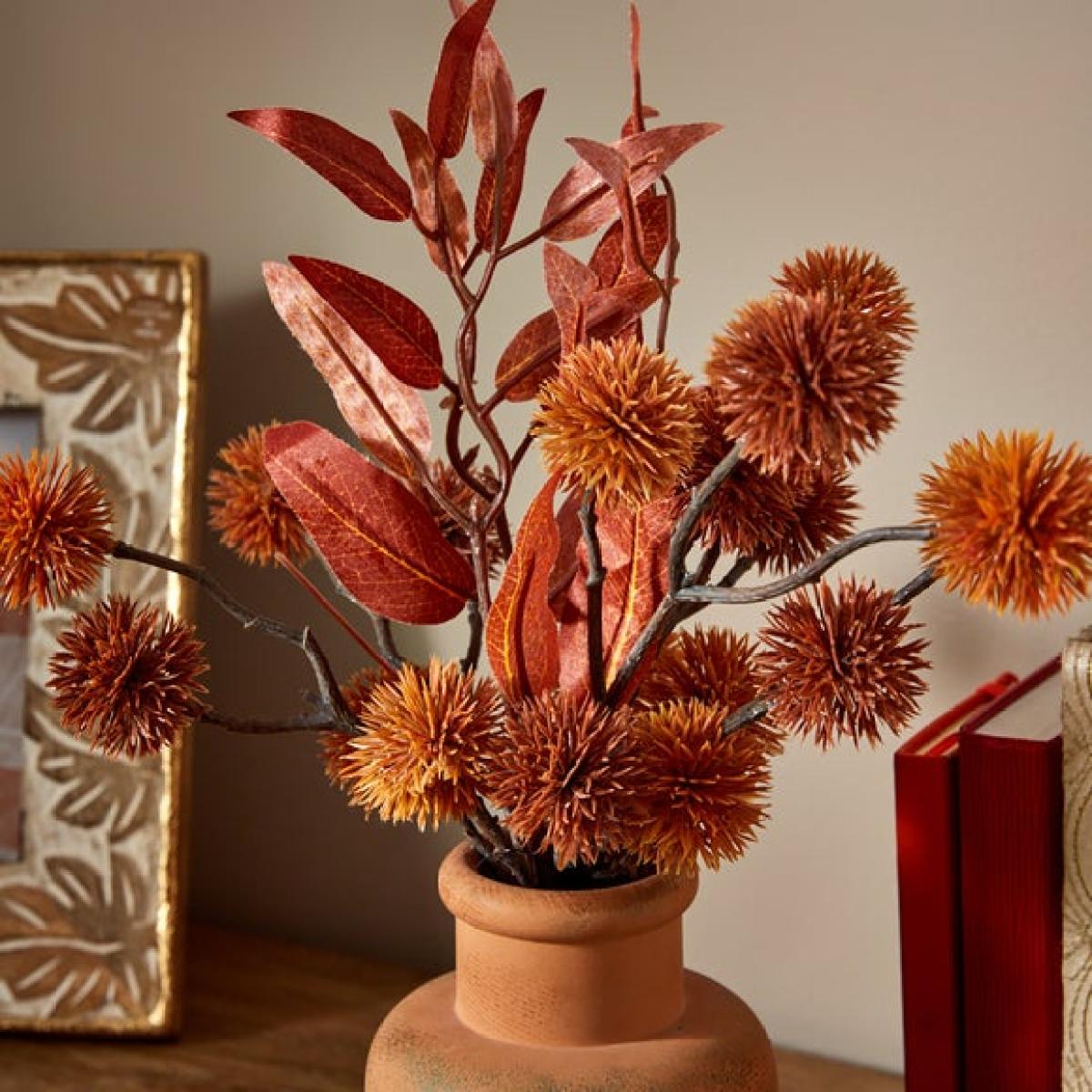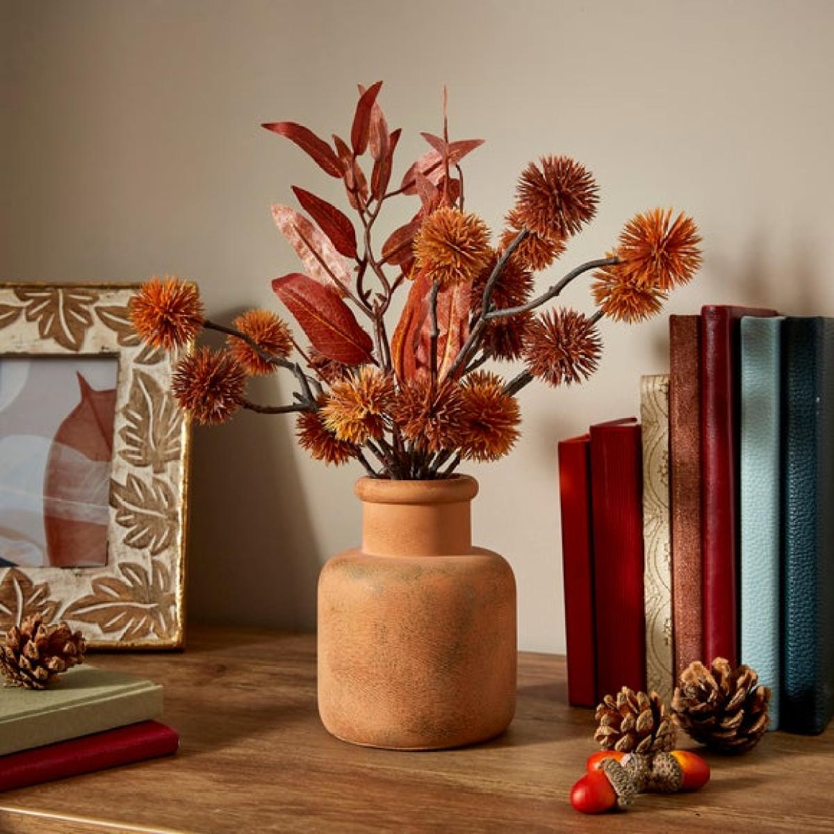 I love this fake autumn arrangement because it adds warm, earthy tones to a space without the need for maintenance. The washed terracotta vase is versatile and works well in both modern and rustic interiors, adding a touch of colour and texture to sideboards, shelves, or console tables. For styling tips, try pairing it with natural wood or linen textiles to enhance its organic feel, or group it with other plant-based decor for a layered look. It’s a practical choice for bringing seasonal colour indoors year-round, especially in well-lit areas where the colours can really pop.