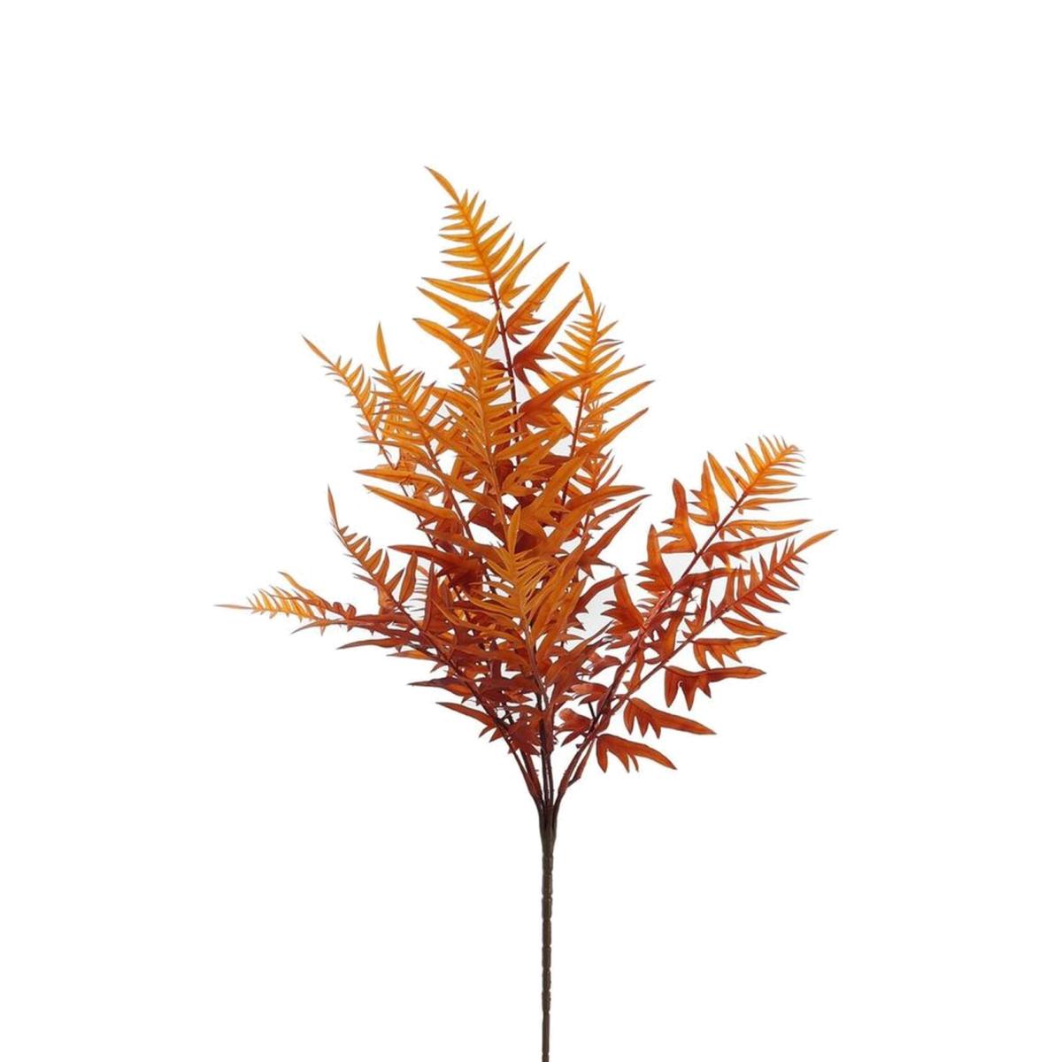 Add a touch of rustic texture and warm colour to your decor with this striking artificial hardy fern spray. Standing at 48cm, this piece showcases the intricate and delicate fronds of a fern in a beautiful, contemporary burnt orange hue. The fine, feathery leaflets create a sense of depth and complexity, making it a captivating accent for any room. This fern spray is perfect for autumnal arrangements, complementing rustic or bohemian aesthetics, or simply adding a pop of warm, earthy colour to a neutral space. Its single-stem design makes it easy to place in a vase on its own or to incorporate as a textural element in larger floral displays. Enjoy the timeless beauty of fern foliage with a modern, colourful twist, all completely maintenance-free.