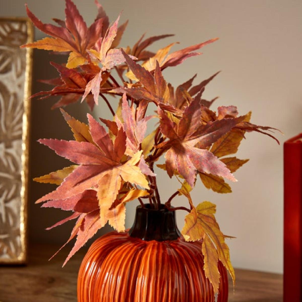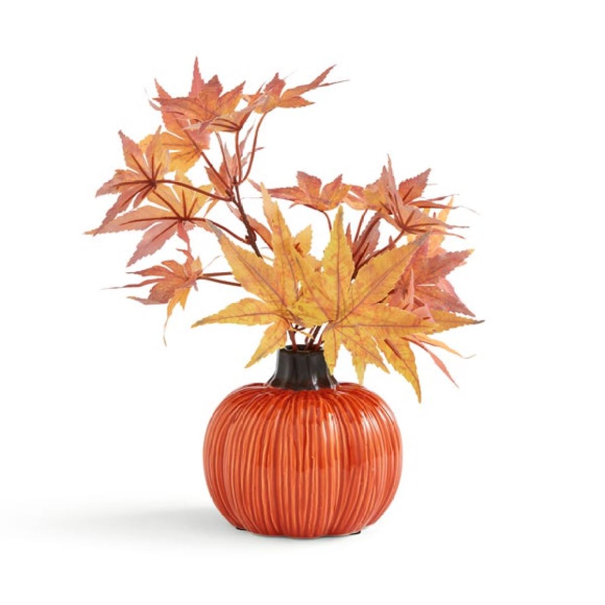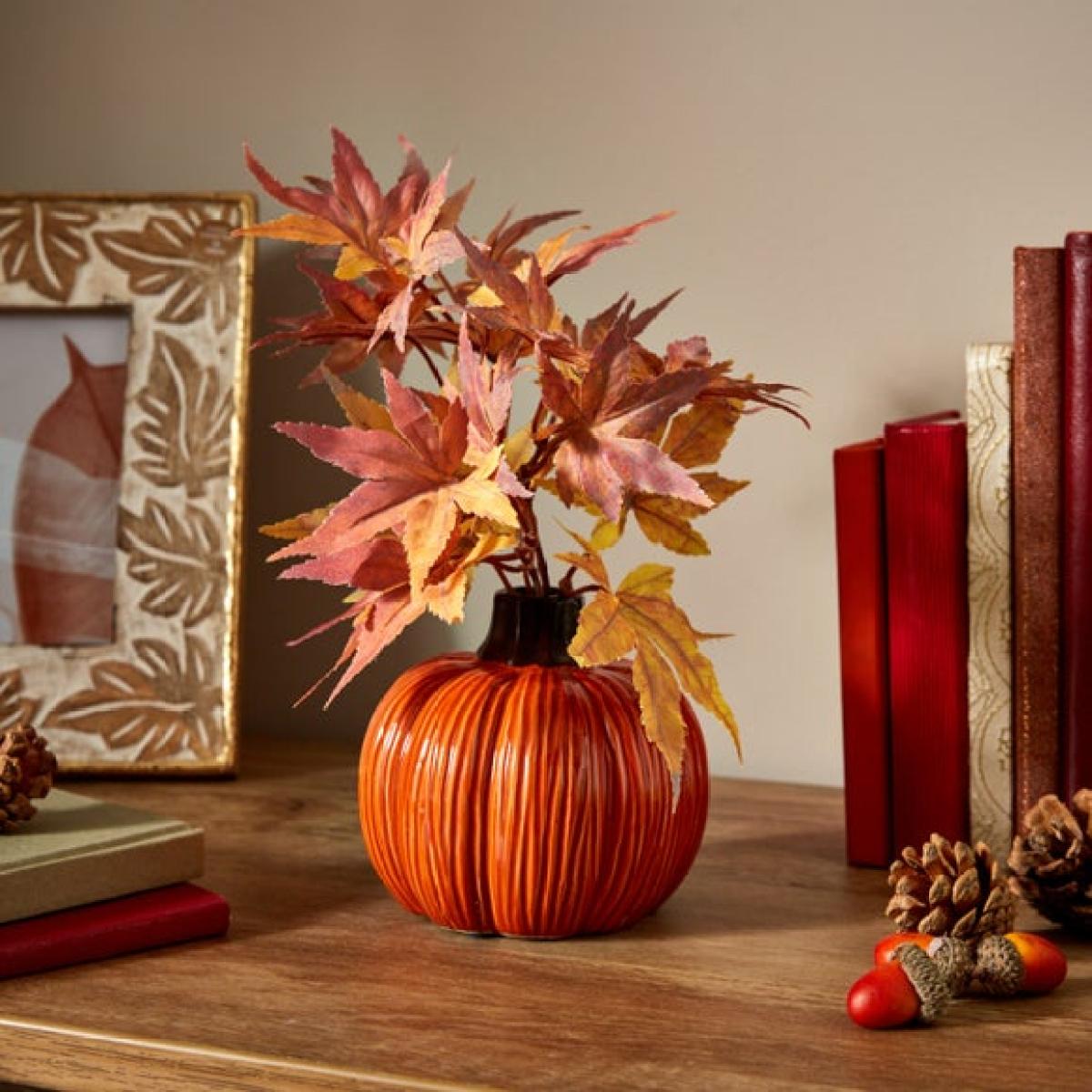 * Artificial autumnal leaves * Ceramic pumpkin plant pot * Great seasonal colour Bring seasonal charm to your home with this decorative ceramic pumpkin plant pot, finished in a rich orange glaze and filled with vibrant autumnal artificial leaf sprigs. Perfect for adding a cosy pop of colour to tables, shelves or mantelpieces - no maintenance required, just effortless autumn style all season long.