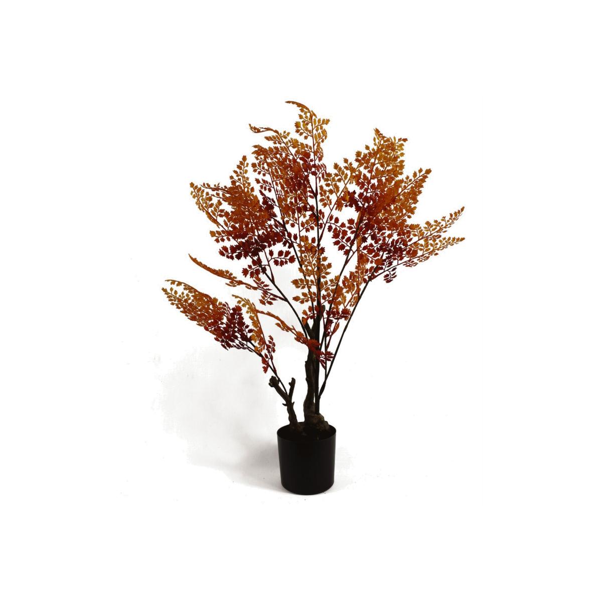 Artificial Autumn Orange Fern Tree Plant. Artificial tree by Leaf Design UK. Realistic artificial replica of a fern tree. Potted in a plain plastic pot and is fully assembled. These plants are designed to be put inside a larger planter to display and you can add soil - gravel or bark around them to make them look even more realistic. Part of our special autumn colours range of plants.
