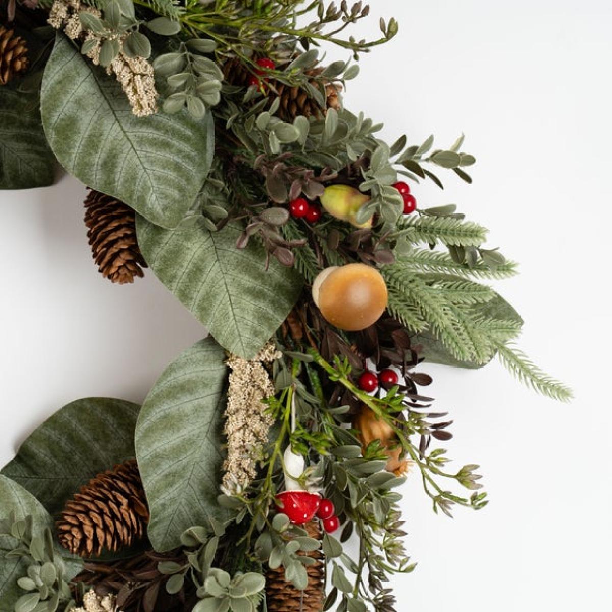 * Woodland style * Acorns and toadstools * Complementary foliage * 62cm diameter wreath Bring a woodland wonder to your home with this 62cm artificial autumnal wreath, featuring acorns and toadstools. Bursting with vibrant leaves, natural textures, and playful details, it’s the perfect way to add cosy, seasonal character to your door, mantel, or wall. The warm earthy tones and delicate accents capture the beauty of autumn, creating a welcoming focal point for your home. Durable and reusable, it’s a timeless piece you’ll enjoy year after year. Bring indoors during adverse weather conditions.