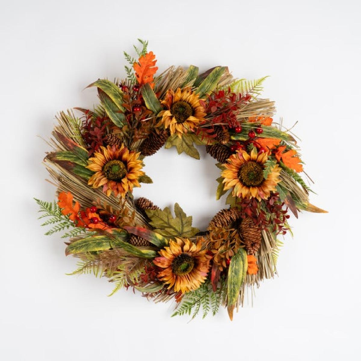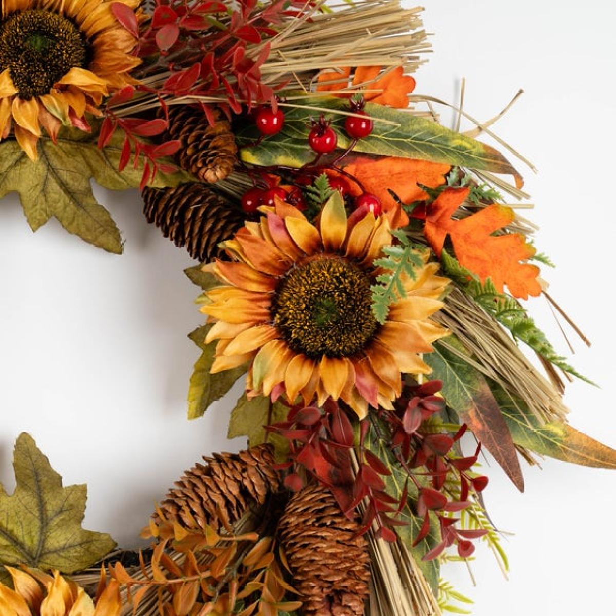 * Autumnal colours * Sunflowers and foliage * 60cm diameter Celebrate the season with this 60cm artificial sunflower wreath, featuring golden sunflowers surrounded by rich autumn leaves, warm berries, and rustic touches. Its striking colours and natural textures bring the warmth and charm of fall to any space. Ideal for front doors, mantels, or as a festive centrepiece, this wreath adds a bright, welcoming glow to your home. The cheerful sunflowers offer a fresh twist on traditional autumn décor. Durable and easy to display, it’s perfect for welcoming the harvest season in style. Remember to bring indoors during adverse weather conditions.