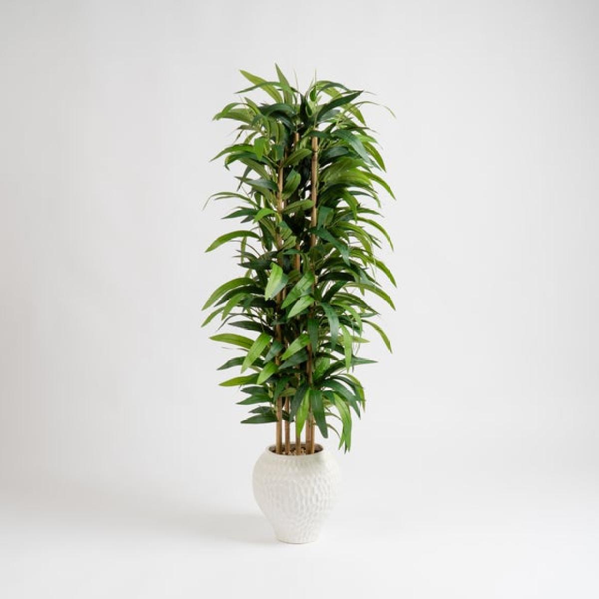 I love this one for bringing a touch of greenery without any fuss-it’s a great alternative to real plants if you’re after a low-maintenance option. The artificial bamboo looks particularly striking in contemporary or minimalist interiors, adding height and a bit of natural texture. It works well placed in empty corners, lobbies, or beside seating areas to create a relaxed, calming vibe. For styling tips, I’d suggest pairing it with neutral tones for a modern feel or mixing it with other natural materials like wood or rattan for a more layered, boho look. Since it’s in a dimpled ceramic pot, it can stand alone as a statement piece or be grouped with smaller plants for an inviting indoor garden effect.