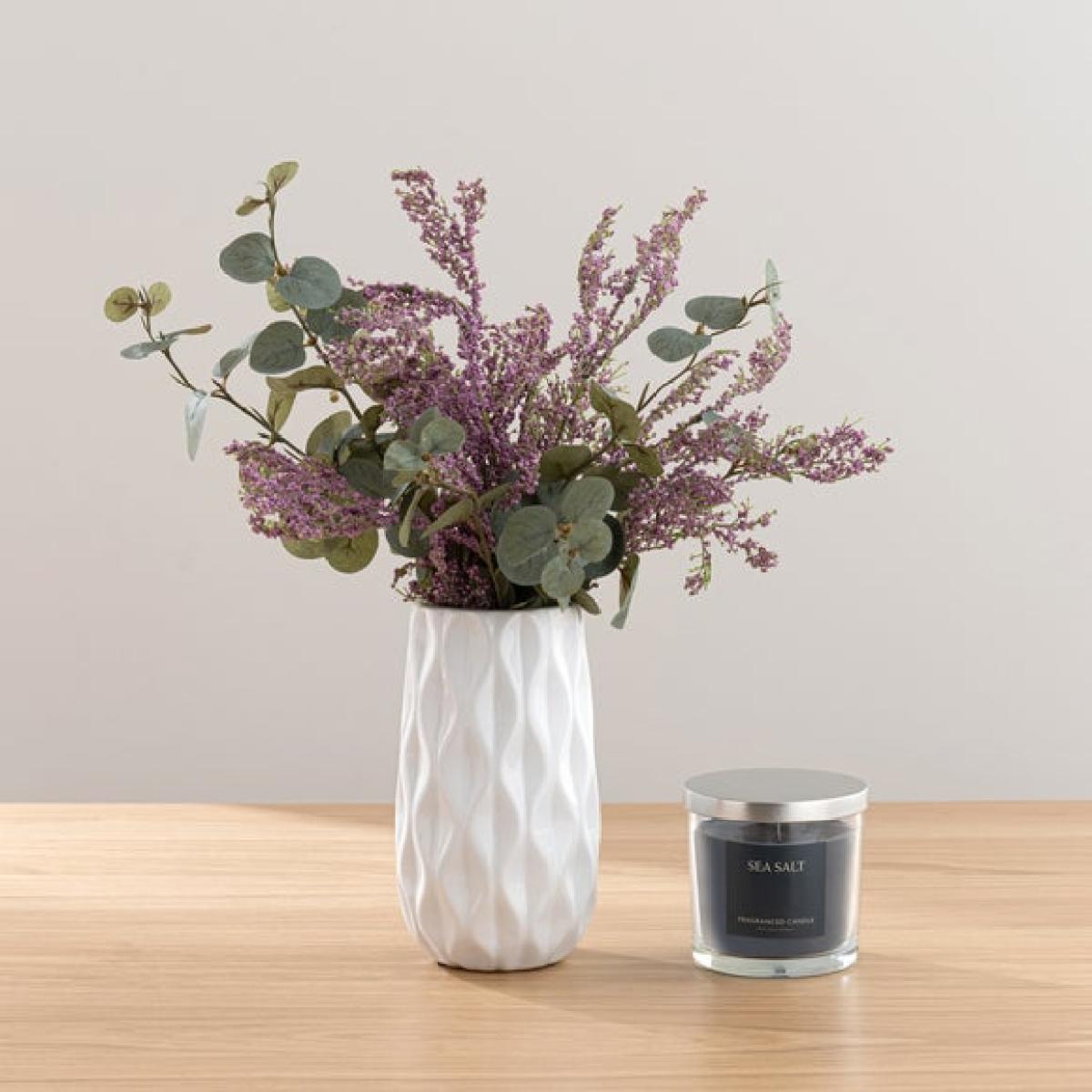 * Artificial flowers in vase * Scented candle * Fresh, uplifting fragrance * Up to 30 hours burn time * Great gift idea Bring a touch of nature indoors with this ready-made artificial bouquet and candle gift set, complete with a white ceramic vase and lush, lifelike foliage. The deep green eucalyptus leaves and rich berry accents stay vibrant season after season, with no watering needed. Paired with a Sea Salt scented candle, this set brings a sense of calm to any space. Notes of citrus, rosemary and vetiver create a fresh, breezy aroma that’s both soothing and uplifting. Whether it’s a thoughtful gift or a treat for yourself, it’s a simple way to add a little serenity to the day.