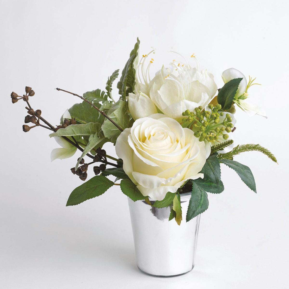 Place one of these shining silvery pots blossoming with white roses, amaryllis, hellebores, ivy berries and evergreen on a console, or several of them along a table or mantelpiece, settle back and enjoy your very own wonderland.